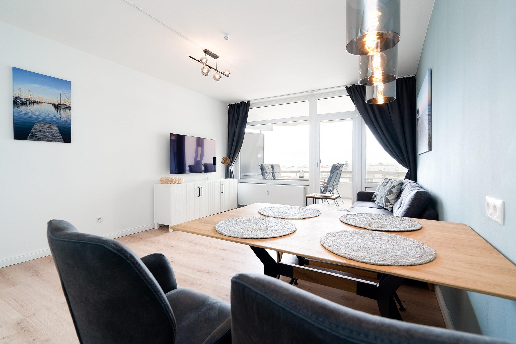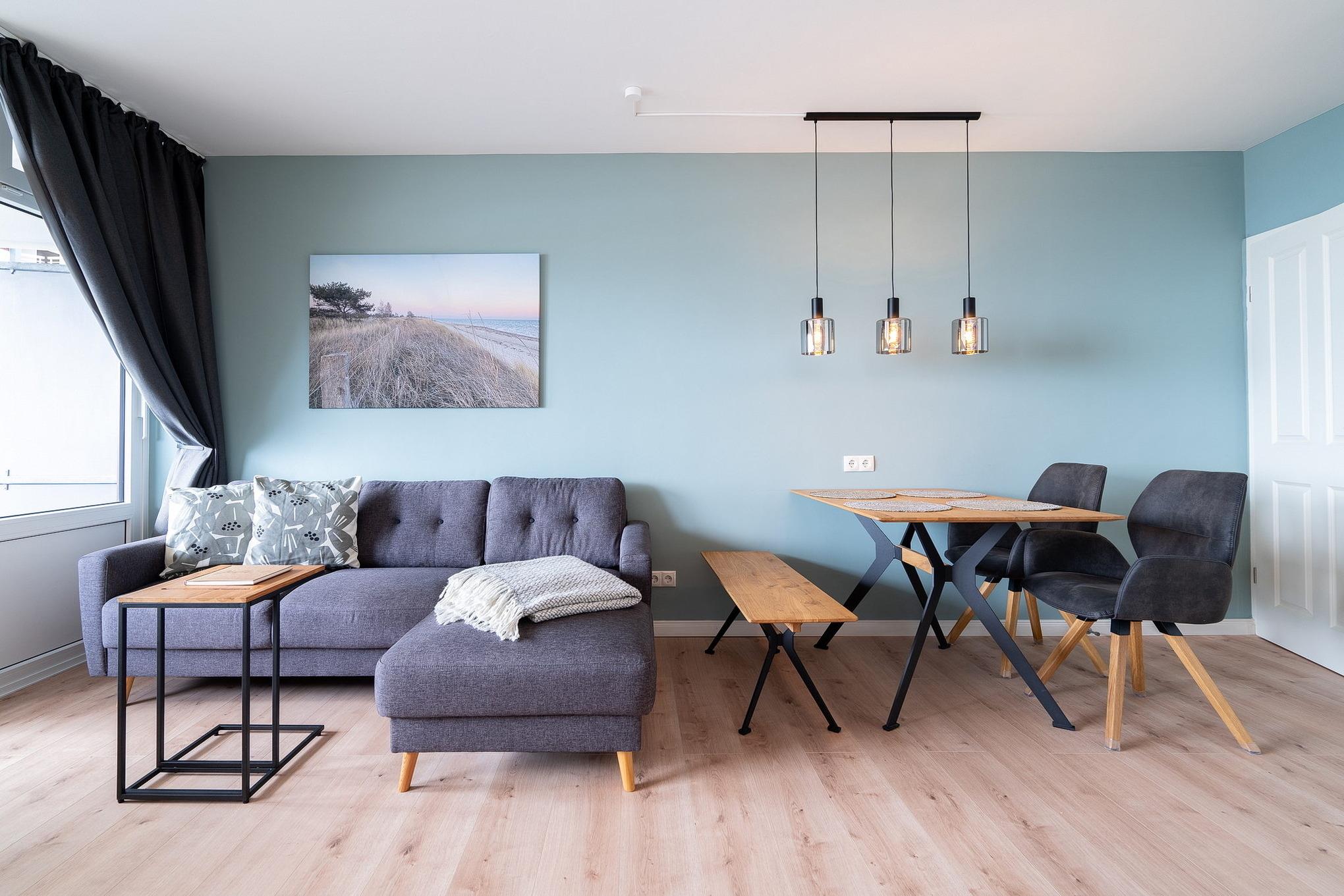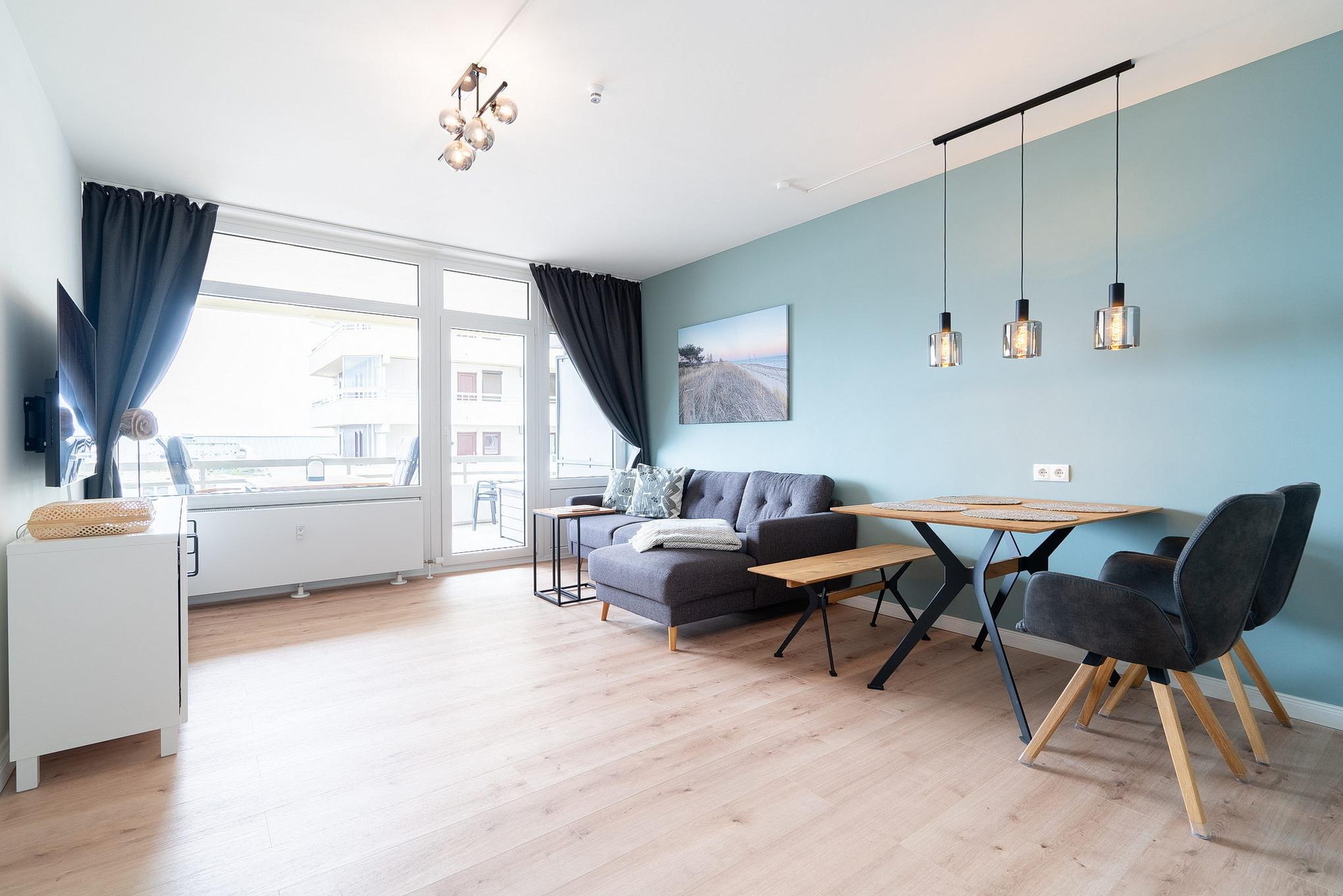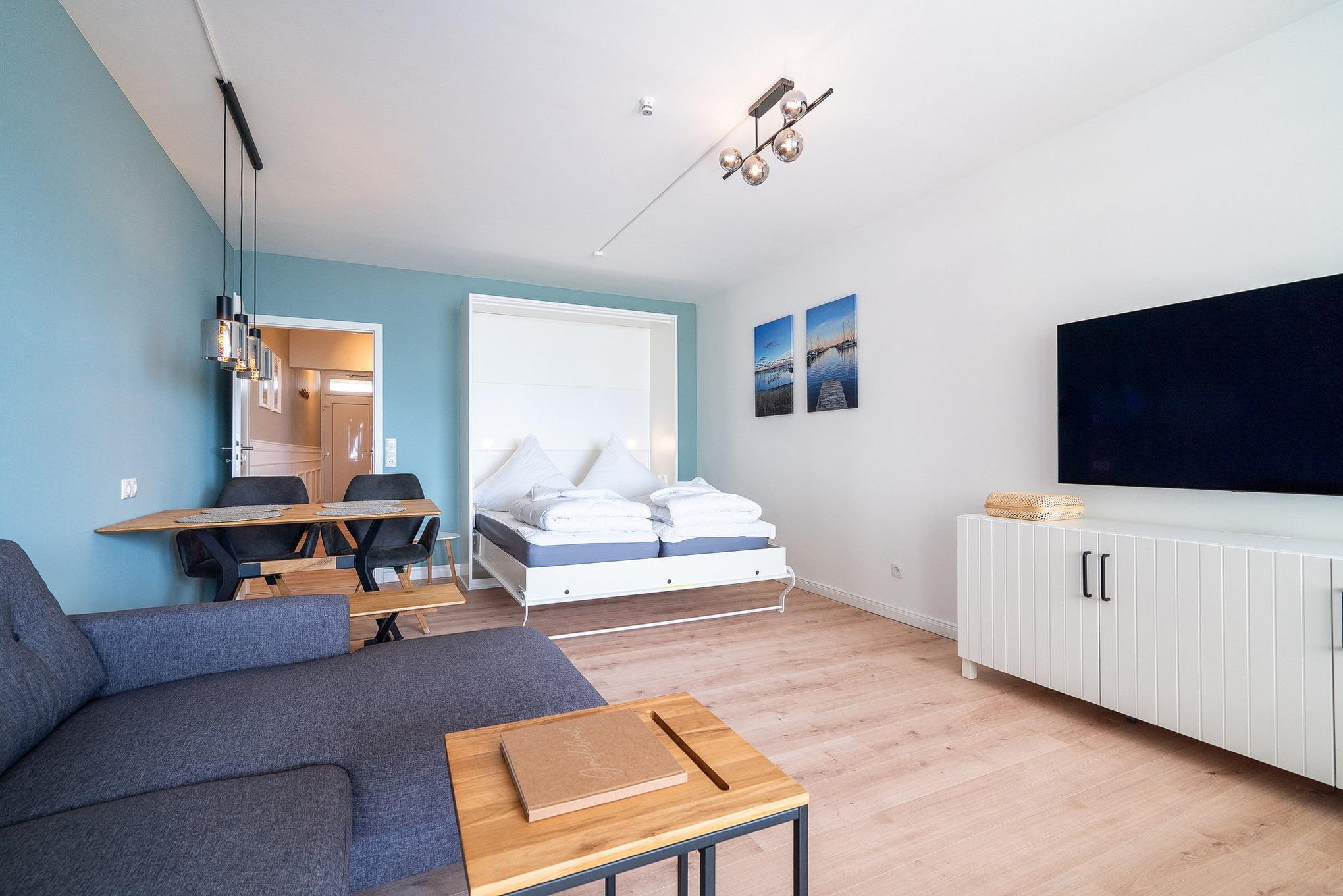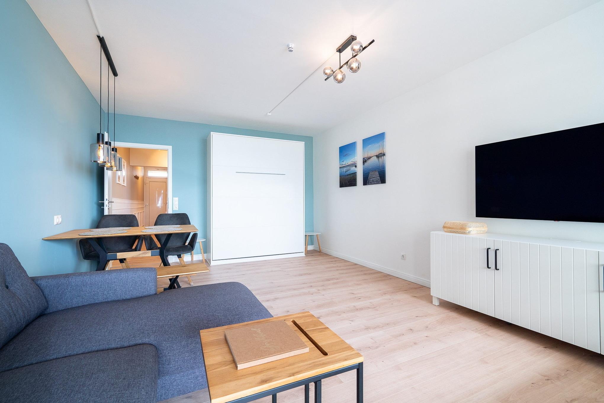 Freundliches, helles und gemütliches Wohn- und Schlafzimmer mit einem Designerfußboden in Holzoptik. Im Wohn-/Schlafzimmer befinden sich eine Eck-Couch, ein Couch-Tisch, ein Essplatz für 4 Personen, ein Schrankbett (2x80x200cm) sowie ein SAT-TV (Flachbildschirm). Das Zimmer lässt sich mit Vorhängen verdunkeln. Direkter Zugang vom Wohn- und Schlafzimmer zum Balkon mit Aussicht auf das Meer.