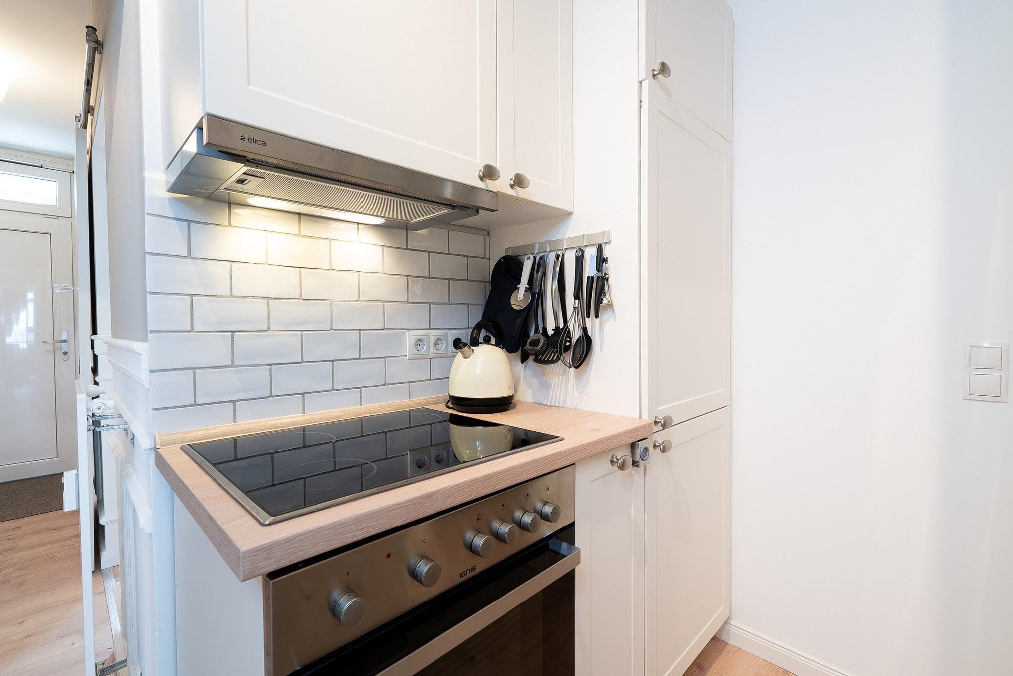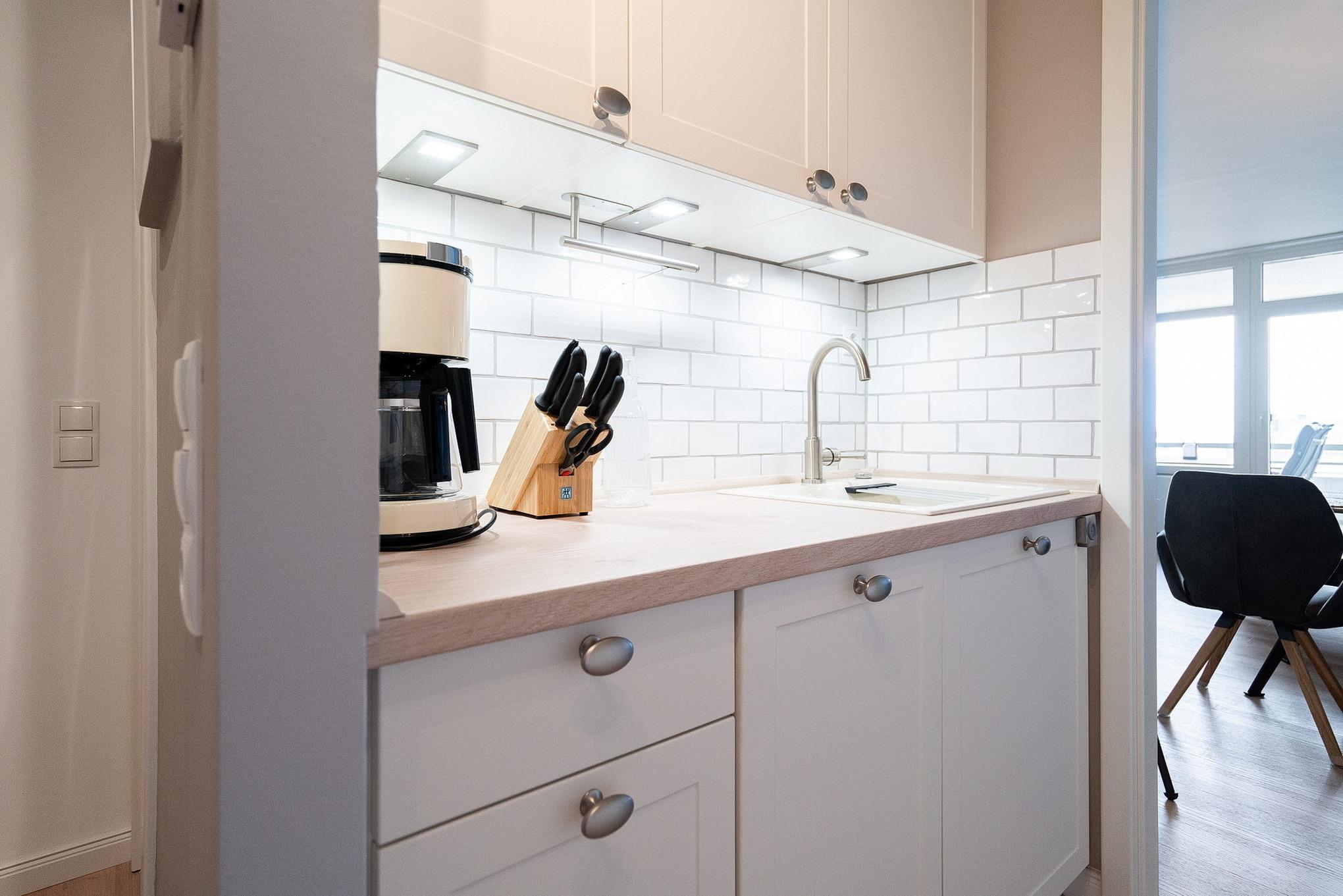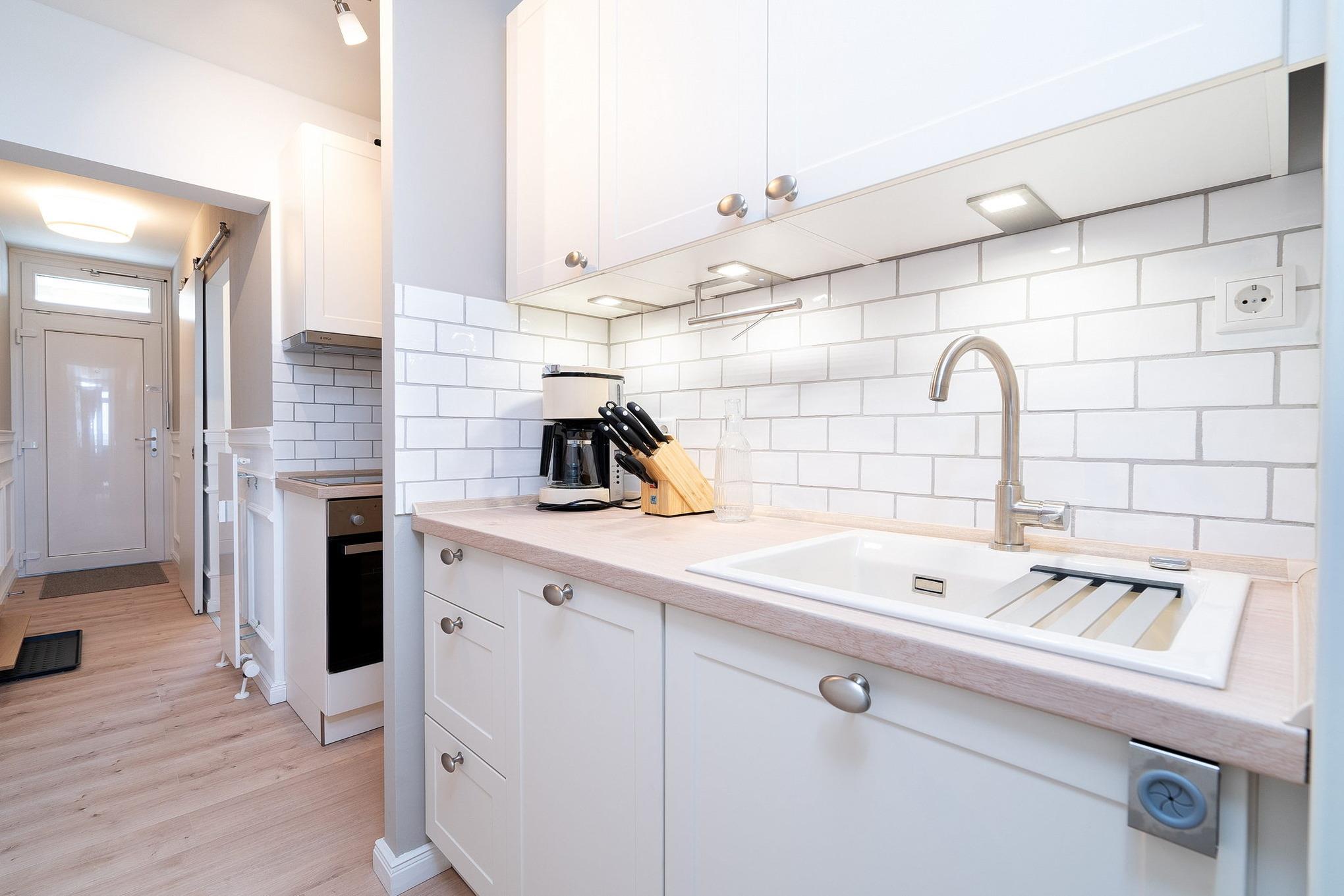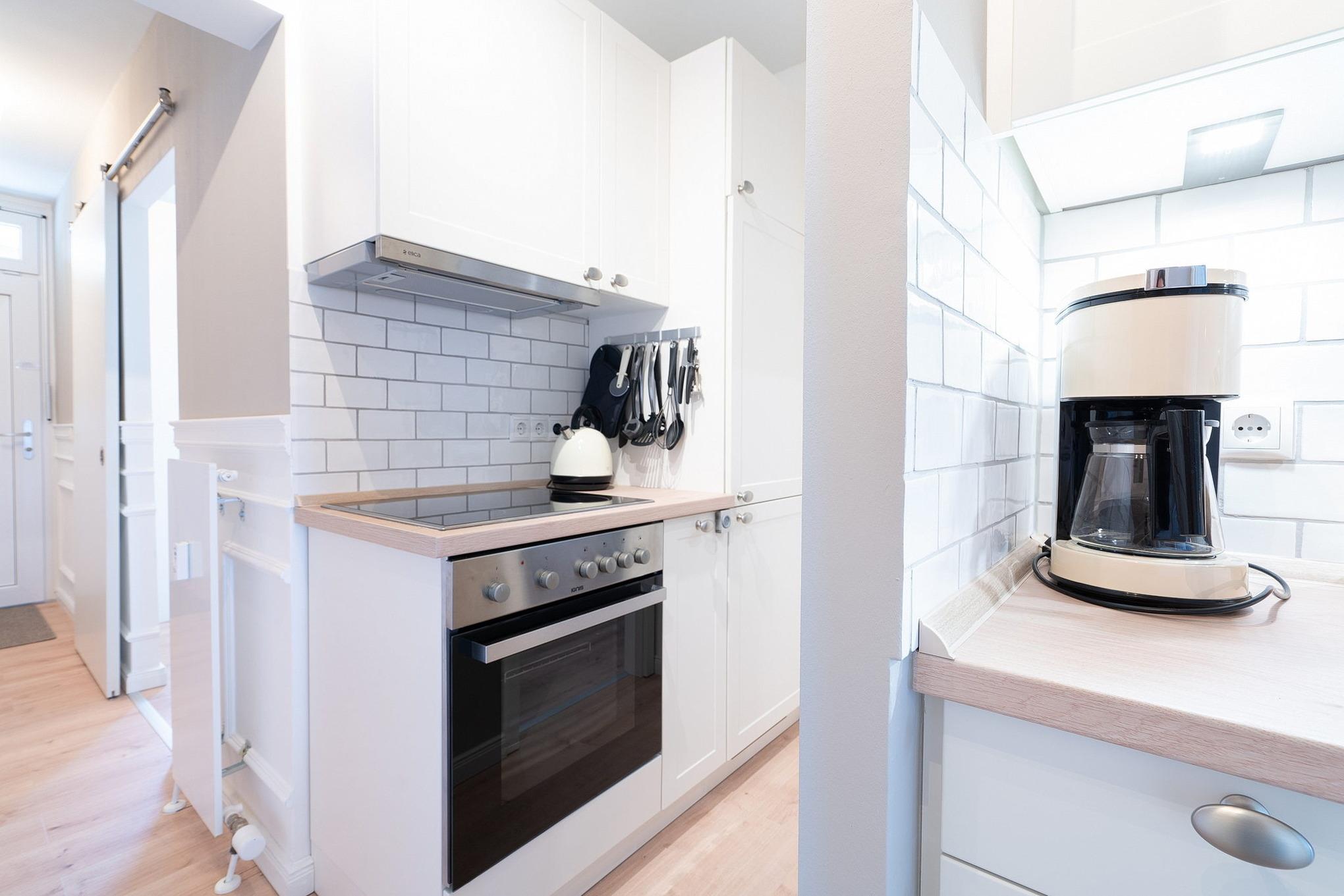 Moderne, Pantry-Küche im Flur. Die Küche ist mit einem 4-Platten Cerankochfeld, einem Backofen, einer Spülmaschine, einem Kühlschrank mit Gefrierschrank (2 Schubladen), einer Kaffeemaschine, einem Toaster und einem Wasserkocher ausgestattet.