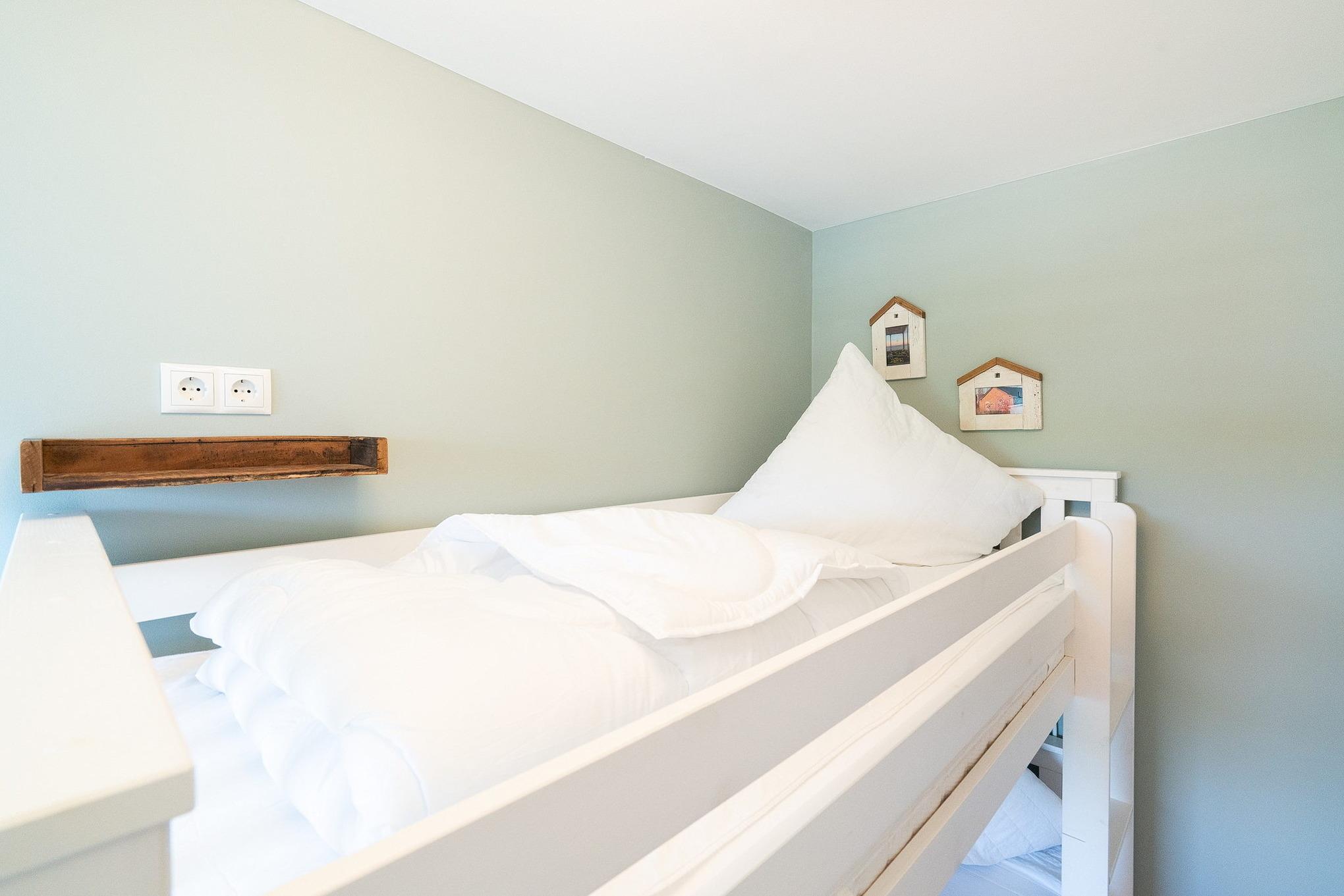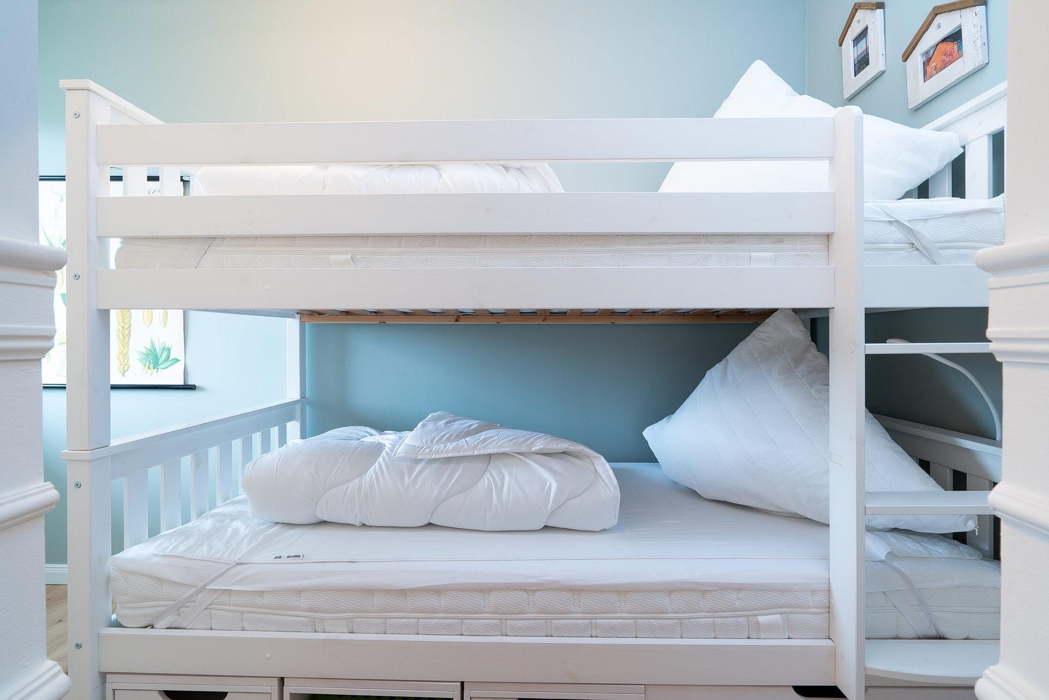 Kleines separates Zimmer mit Etagenbett ( je 90x200cm), kleiner Schrank, Designerfußboden in Holzoptik und Fenster zum Laubengang.