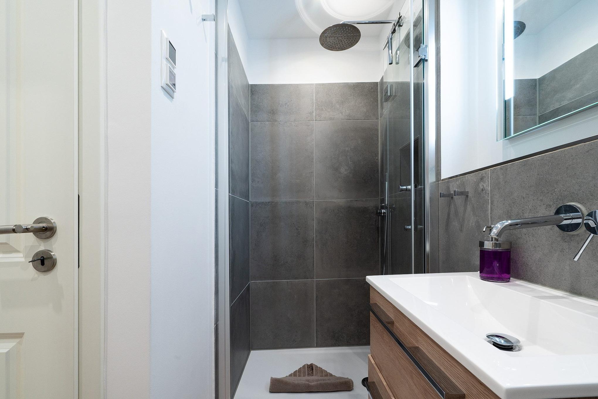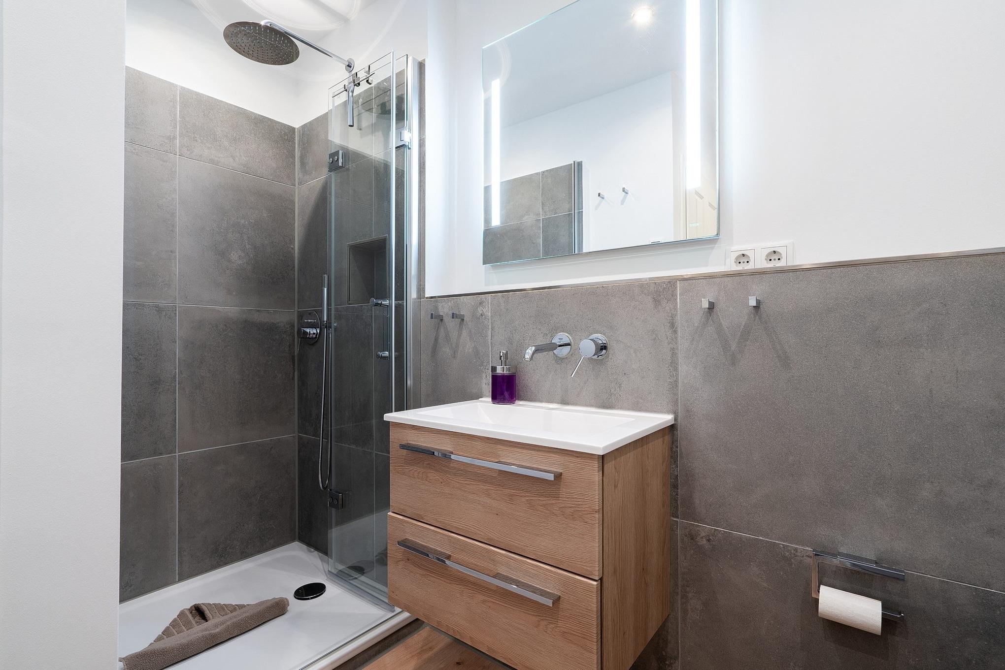 Modernes, kleines Bad mit Dusche, WC und Waschbecken.
