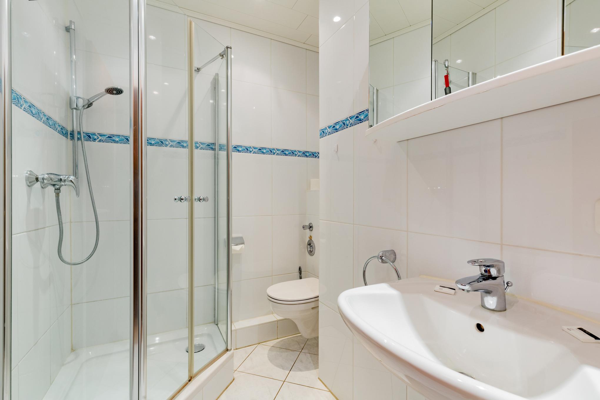 Modernes, hell gefliestes Bad mit Dusche, WC und Waschbecken.
