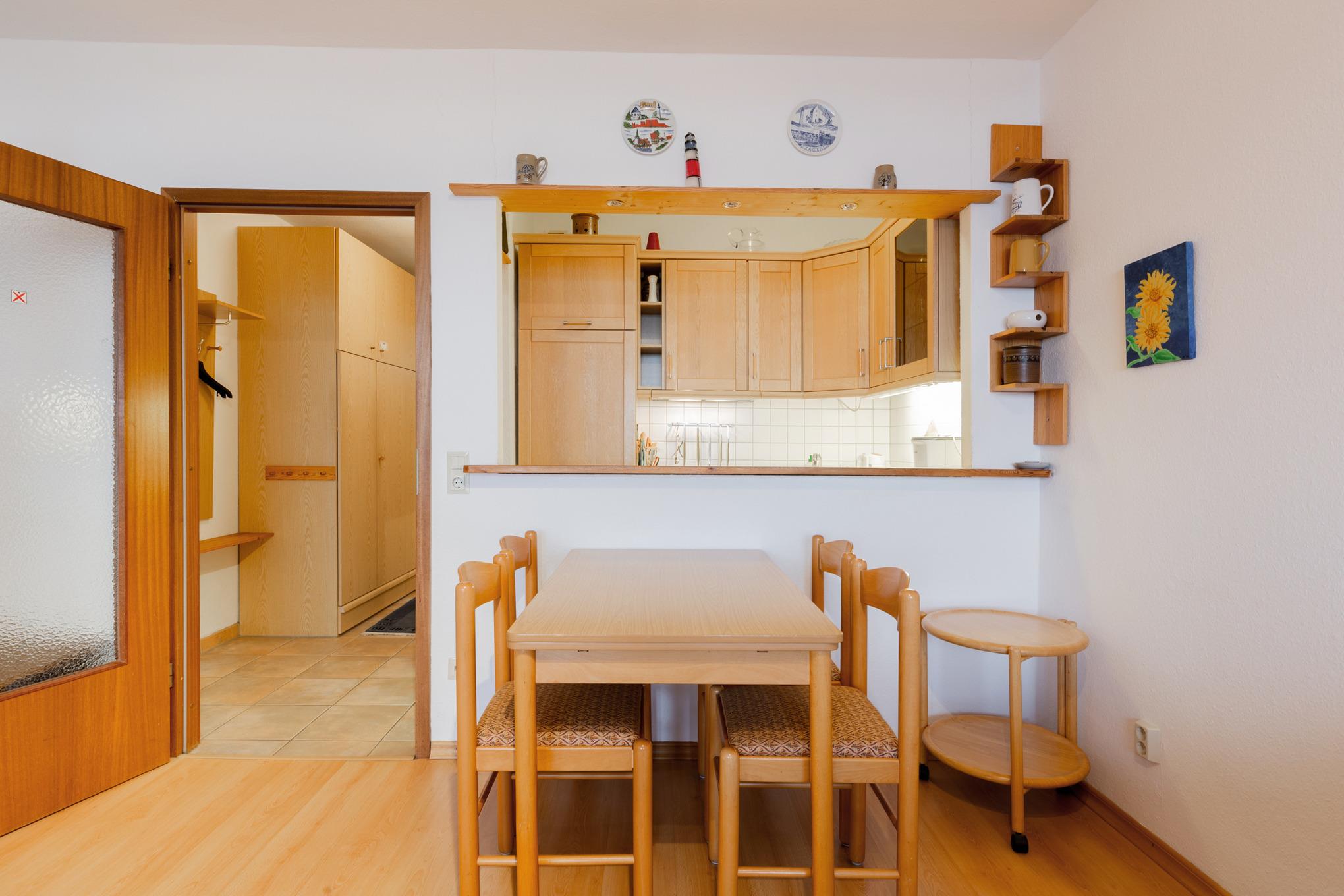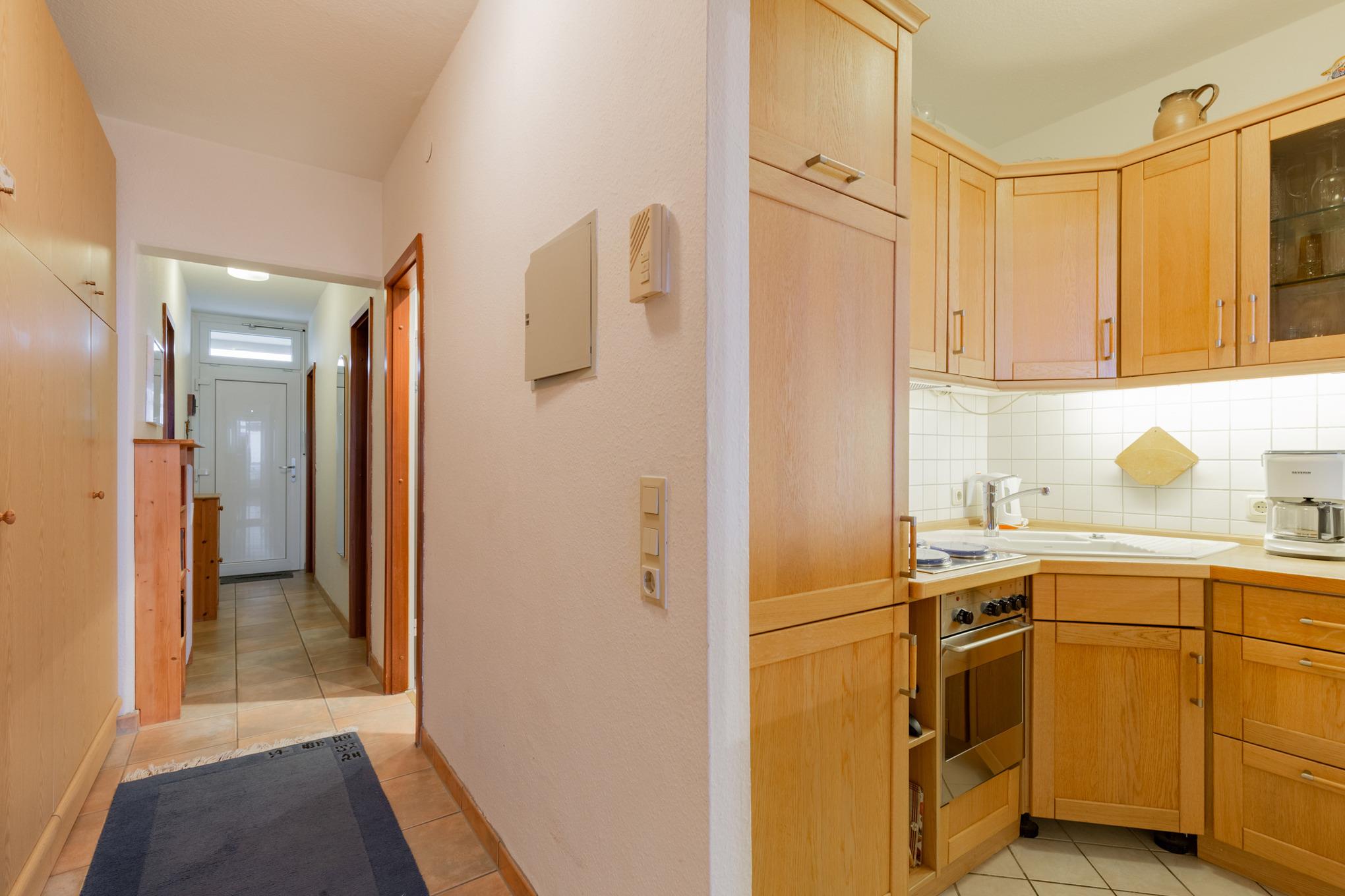 Komplett ausgestattete, zum Wohn- und Esszimmer offen Küche mit 4-Platten E-Herd, Backofen, Kühlschrank mit kleinem 3-Sterne Gefrierfach, Kaffeemaschine, Toaster, Wasserkocher und Eierkocher.