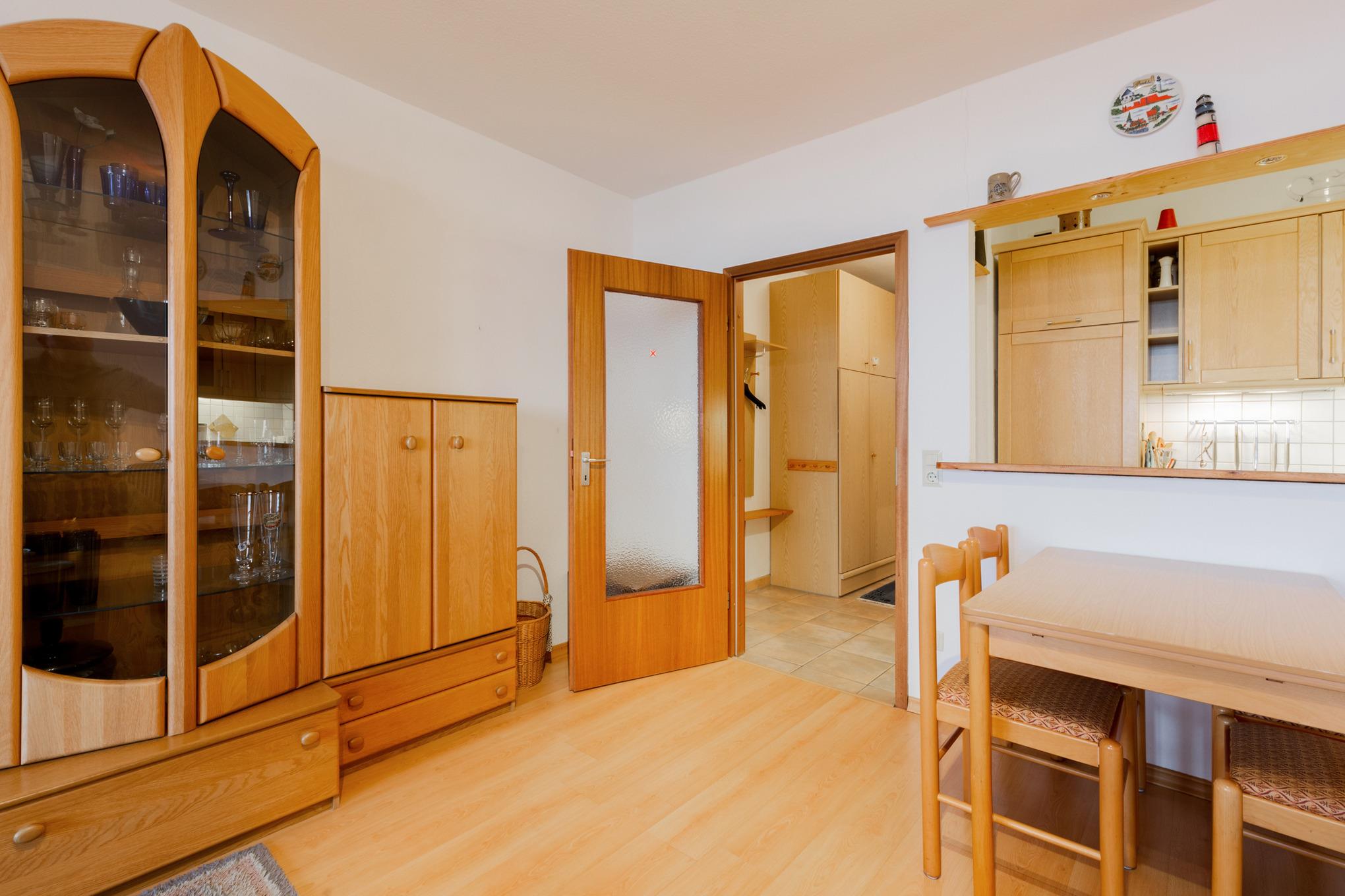 Helles, freundliches Wohn- und Esszimmer mit direktem Zugang zum Balkon. Das Wohn- und Esszimmer ist mit einem Essplatz für 4 Personen, einer Schlafcouch (110x180cm), einem Sessel, einem Couchtisch und einem Wohnzimmerschrank ausgestattet. Zur Unterhaltung stehen ein Fernseher und ein Radio zur Verfügung. Der Boden ist mit Laminat ausgelegt.