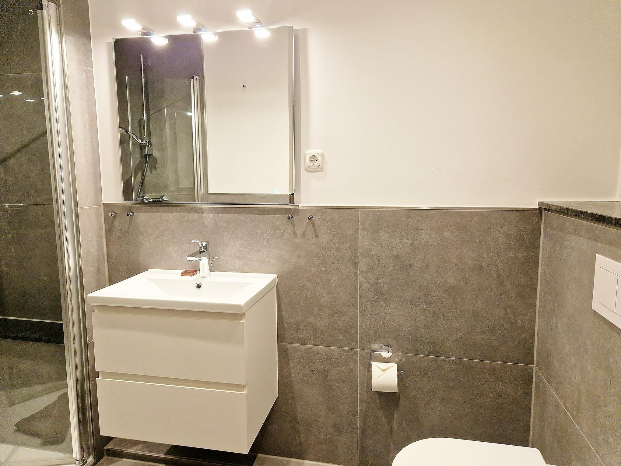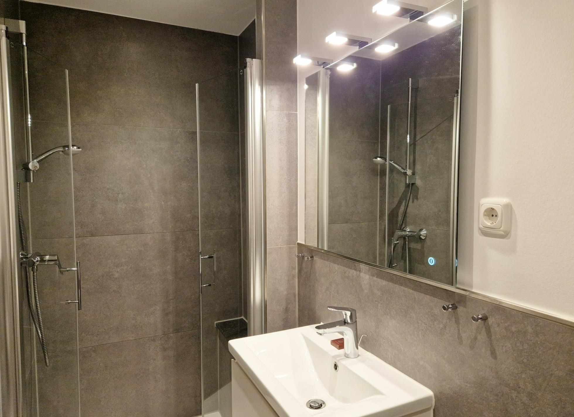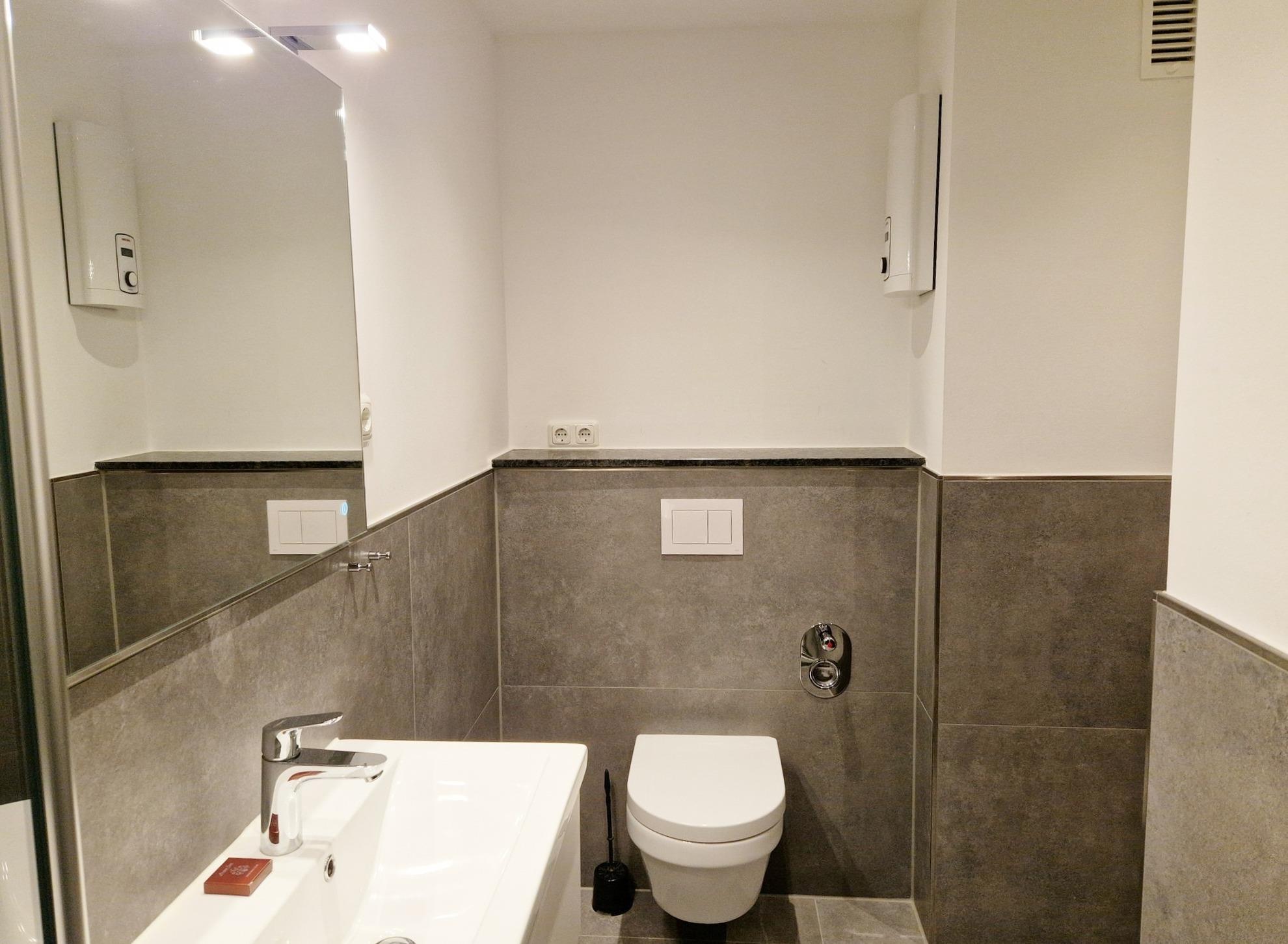Gefliestes Bad mit Dusche, WC und Waschbecken.