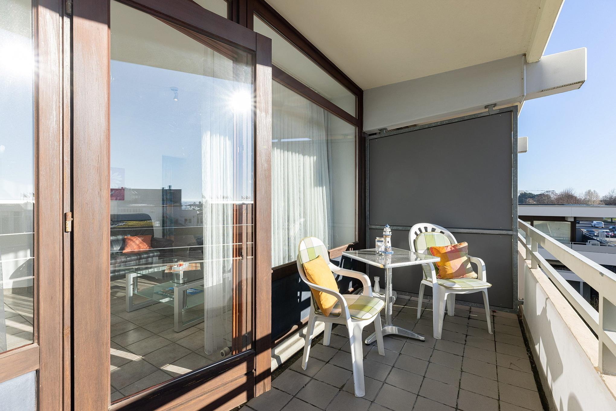 Balkon in südliche Richtung mit Seeblick. Eigener PKW-Stellplatz (max. Höhe 2,00 m), Waschmaschine und Trockner gegen Gebühr.