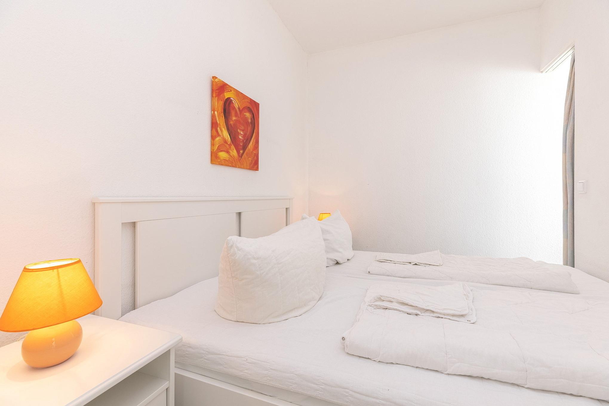 Der Schlafbereich verfügt über ein Doppelbett (2x80x200cm). Der Bereich ist durch Vorhangtüren vom Wohnbereich abgetrennt. Ein Kleiderschrank befindet sich im Flur.