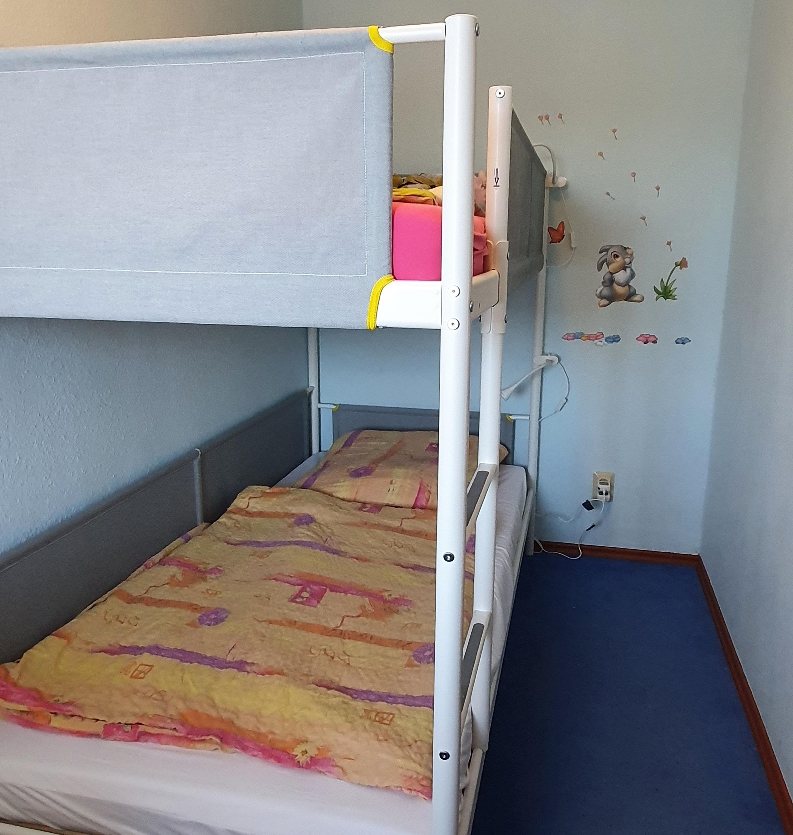 Das kleine Kinderzimmer ist mit einem Etagenbett (2x90x190cm) und einem kleinen Schreibtisch ausgestattet. Das Zimmer lässt sich durch Vorhänge verdunkeln.