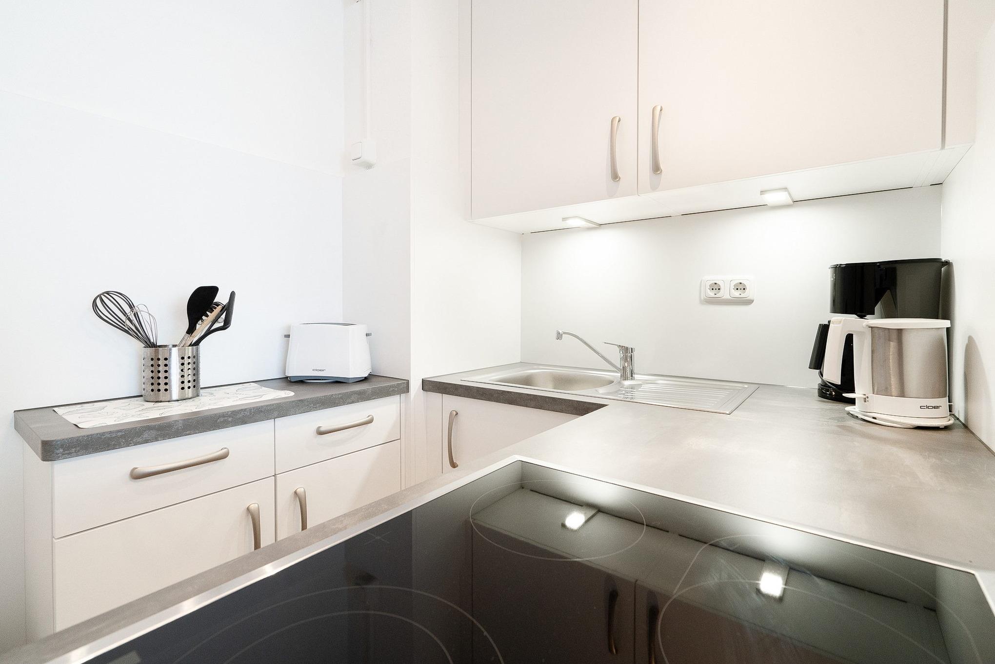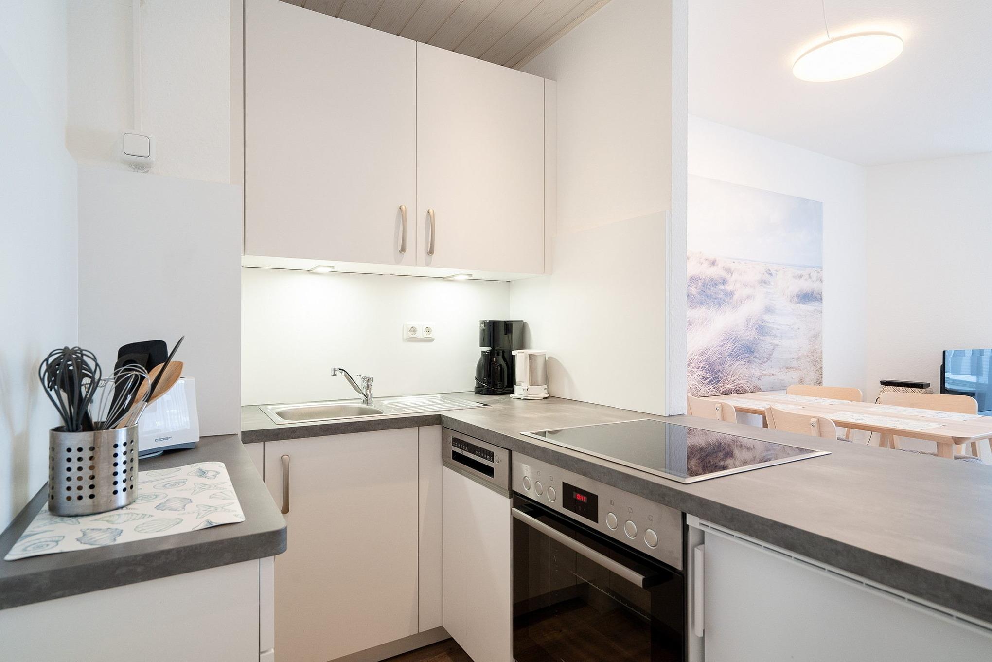 Komplett ausgestattete Küche mit Geschirrspüler, 4 Platten Cerankochfeld, Backofen, Kühlschrank mit 3-Sterne Gefrierfach, Kaffeemaschine, Toaster, Eierkocher und Wasserkocher.