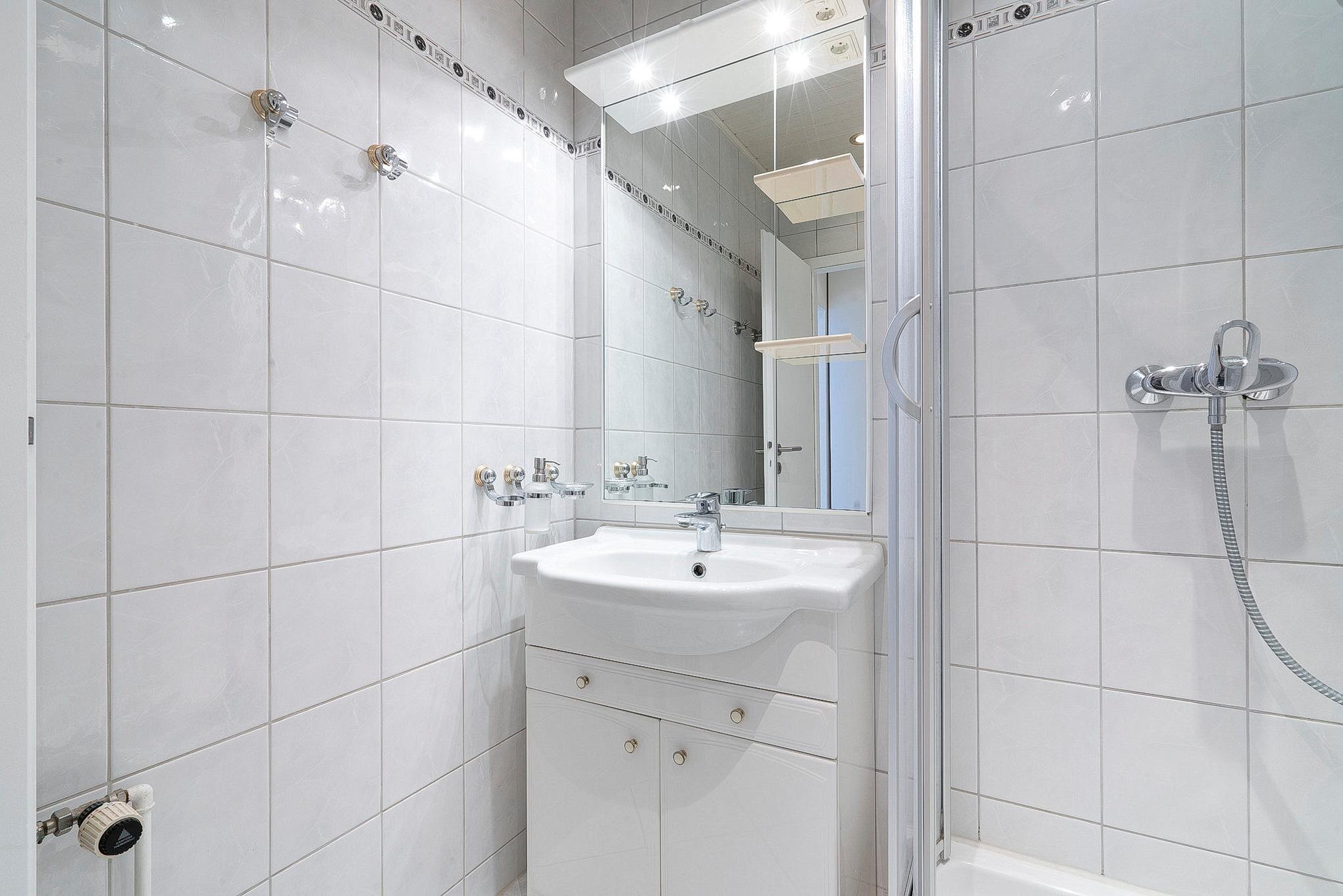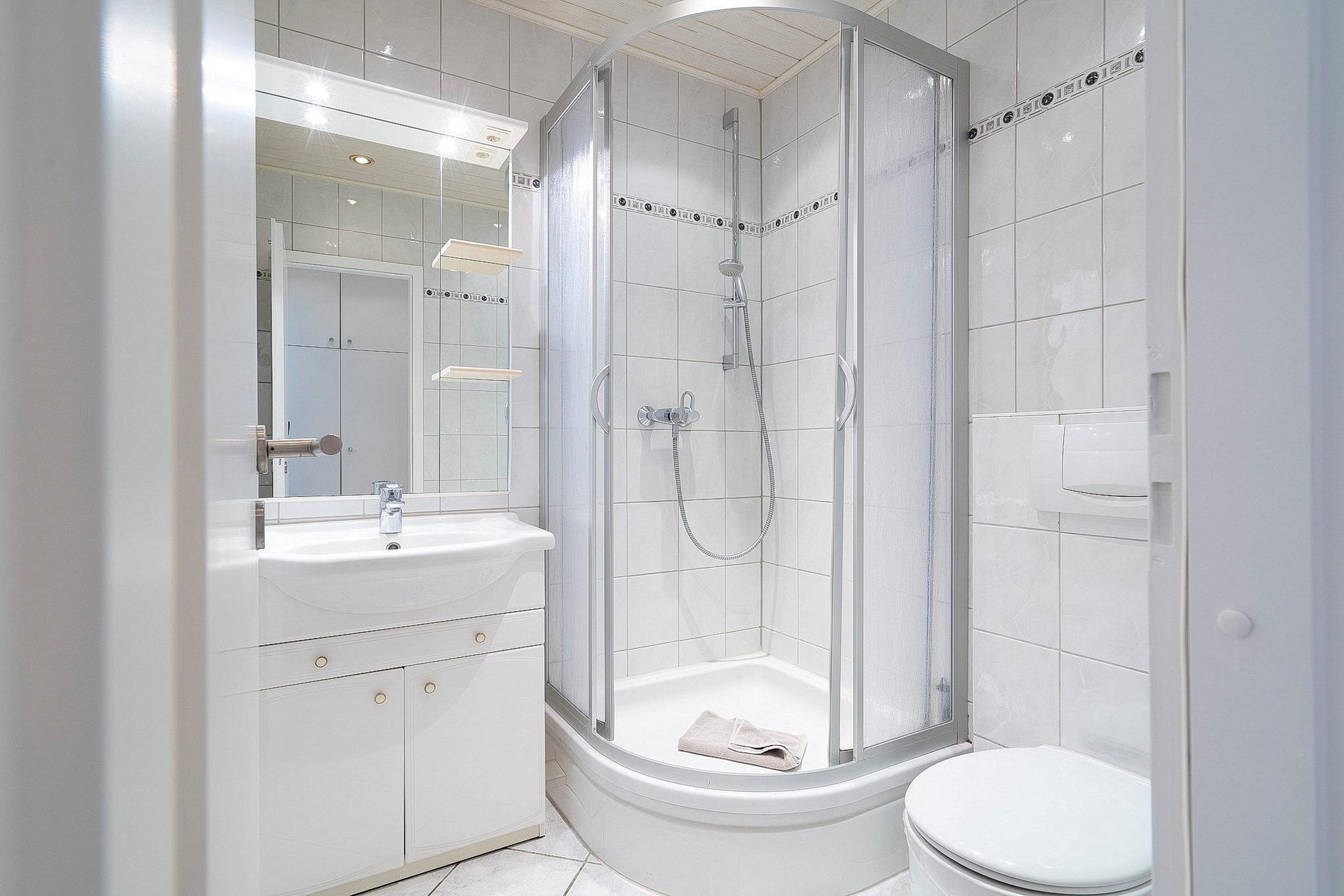 Helles, freundliches gefliestes Badezimmer mit Dusche, Toilette und Waschbecken.