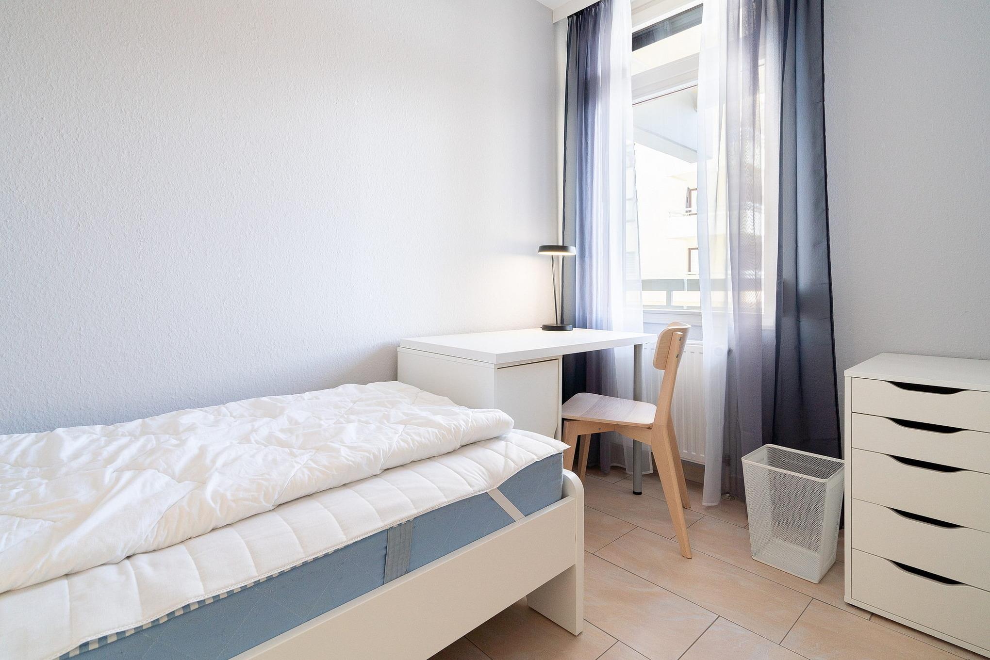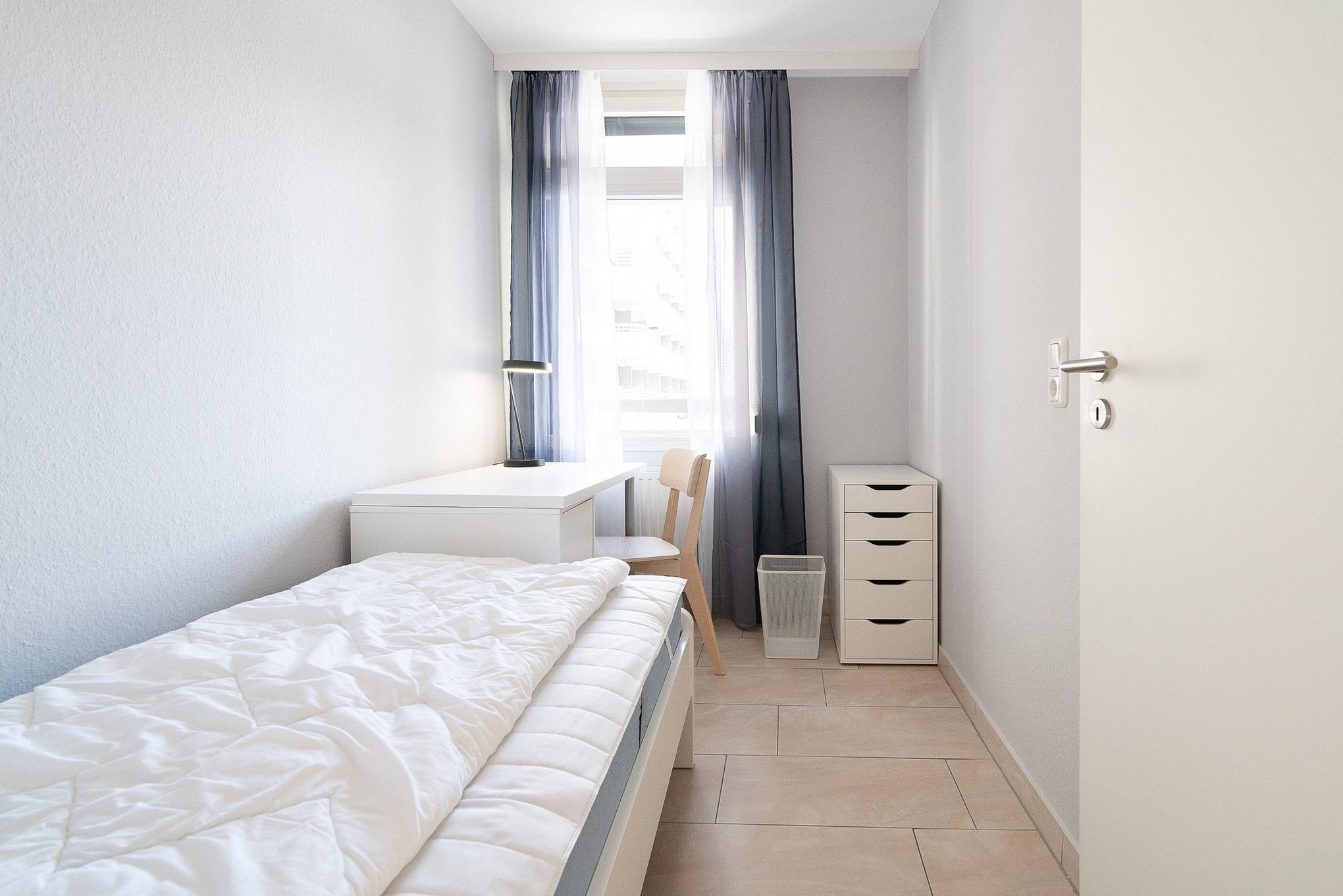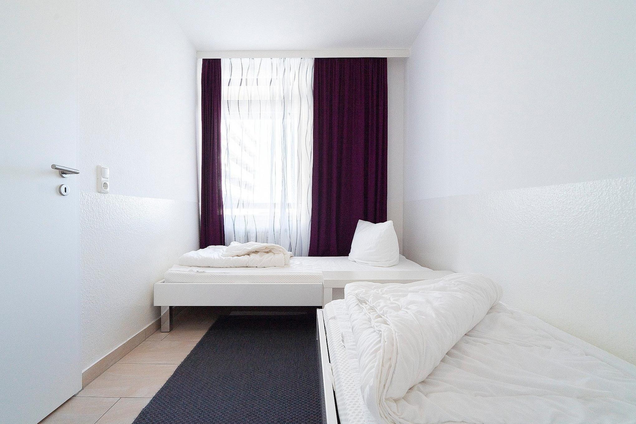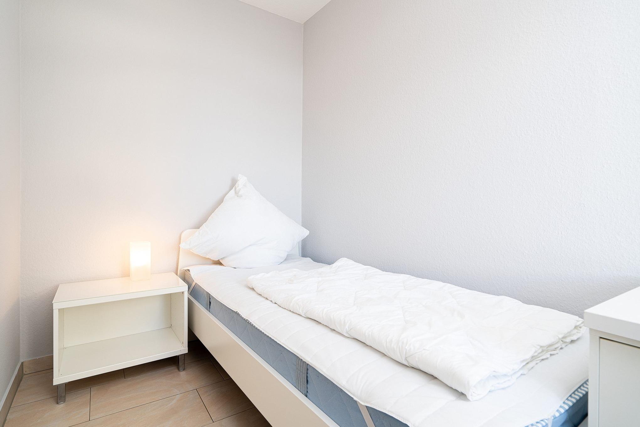 Separates gefliestes Kinderzimmer mit Fenster zum Laubengang. Das Fenster lässt sich durch einen Außenrollladen vollständig verdunkeln. Das Kinderzimmer ist ab 2024 mit einem Einzelbett und einem Schreibtisch ausgestattet.