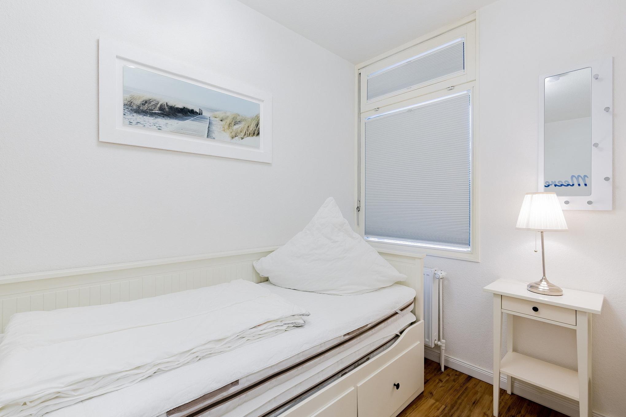 Im Kinderzimmer befindet sich ein ausziehbares Tandembett (jeweils 80x200cm) und eine moderne Kommode. Der Raum ist mit Designer-Planken ausgelegt und lässt sich durch ein Innenrollo verdunkeln.