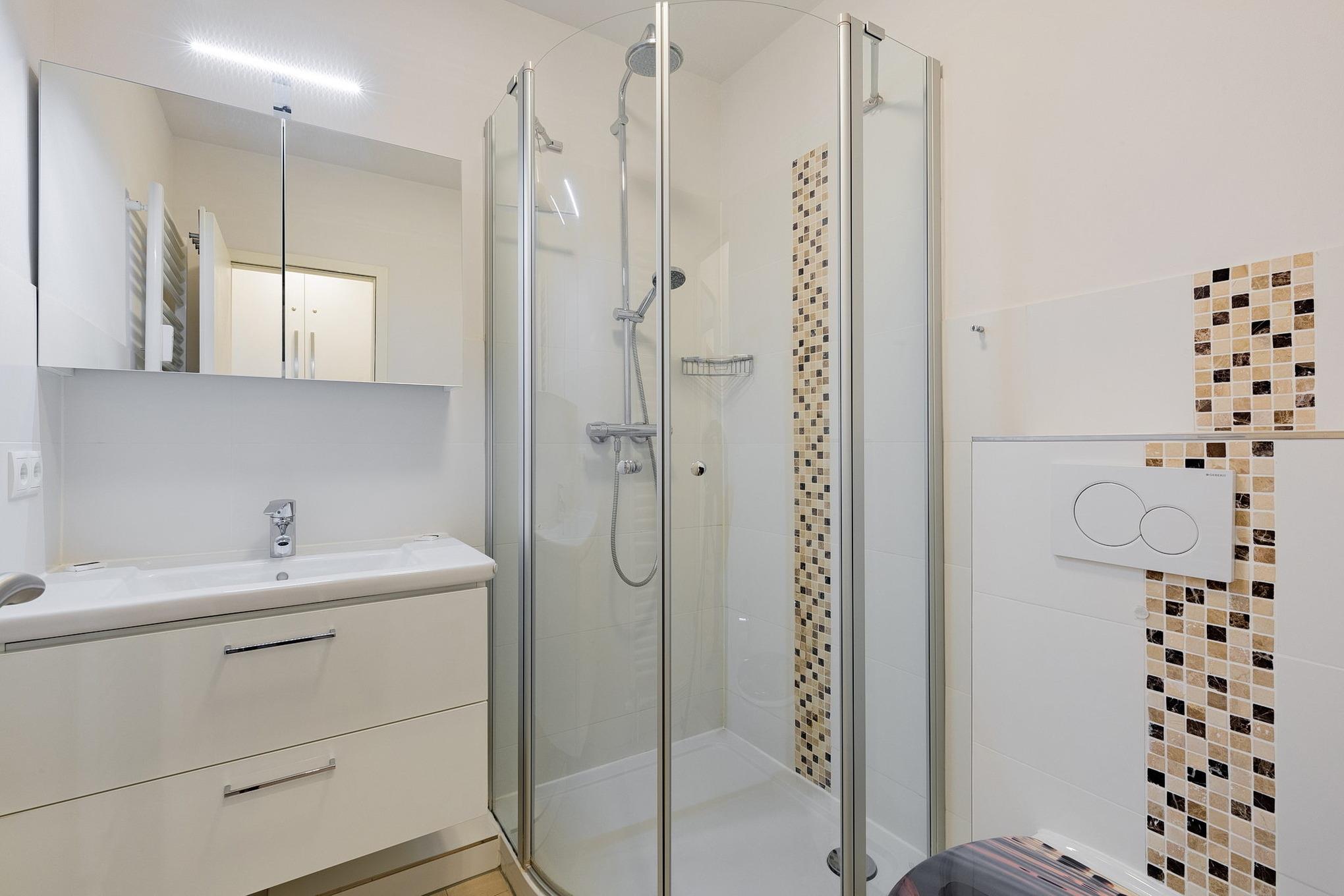 Das moderne, hell geflieste Badezimmer verfügt über eine Dusche, ein WC und ein Waschbecken.