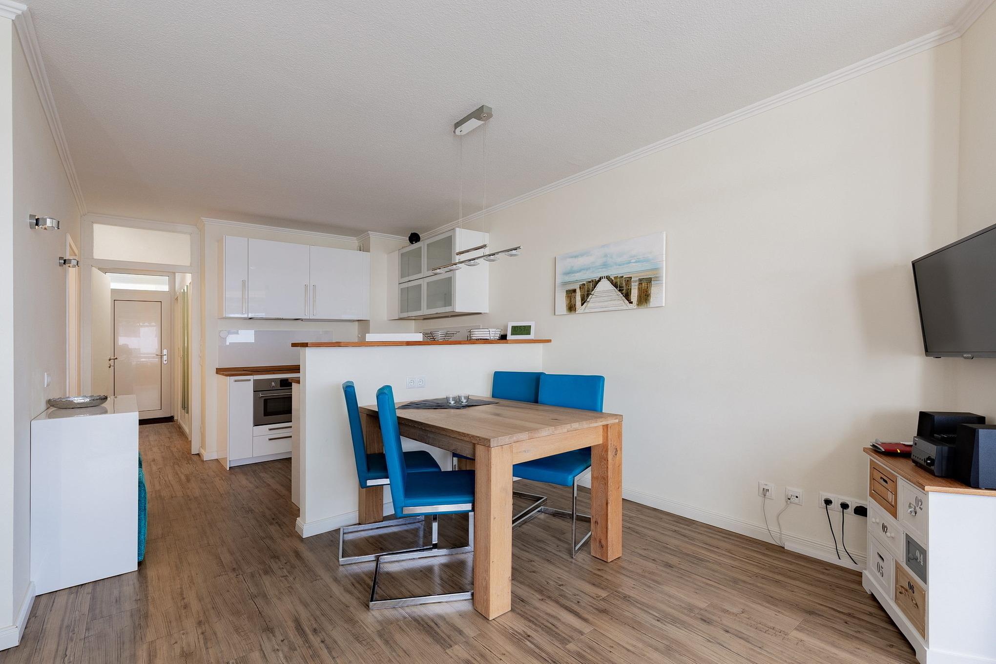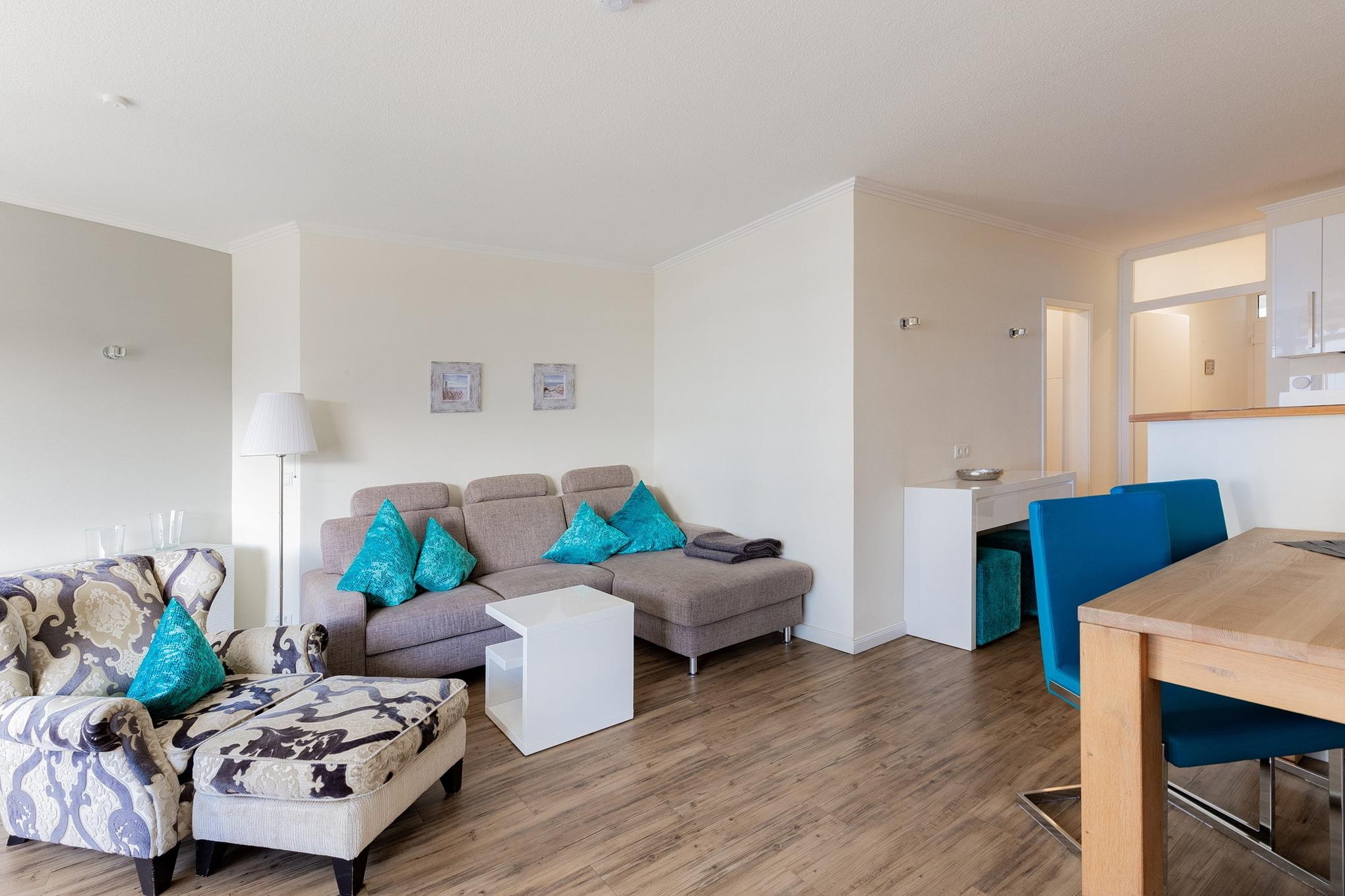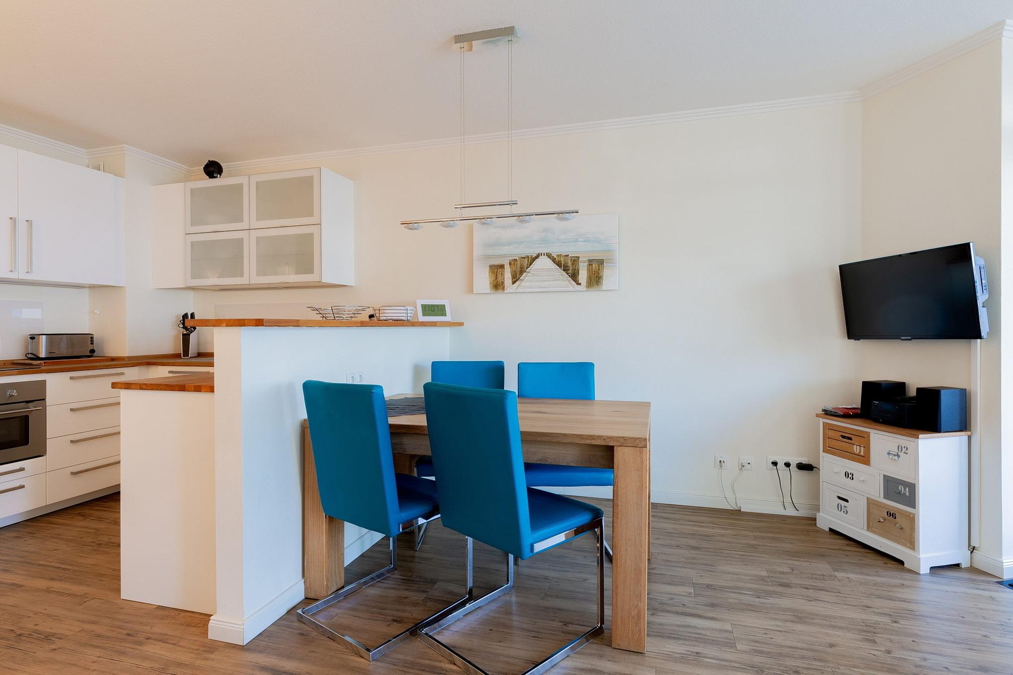Das helle, moderne Wohn- und Esszimmer ist mit einer Eckcouch, einem Sessel sowie einem Esstisch mit 4 Stühlen ausgestattet und mit Designer-Planken ausgelegt. Zur Unterhaltung stehen ein Flachbildfernseher mit integriertem DVD-Player und eine Mini-Stereoanlage zur Verfügung