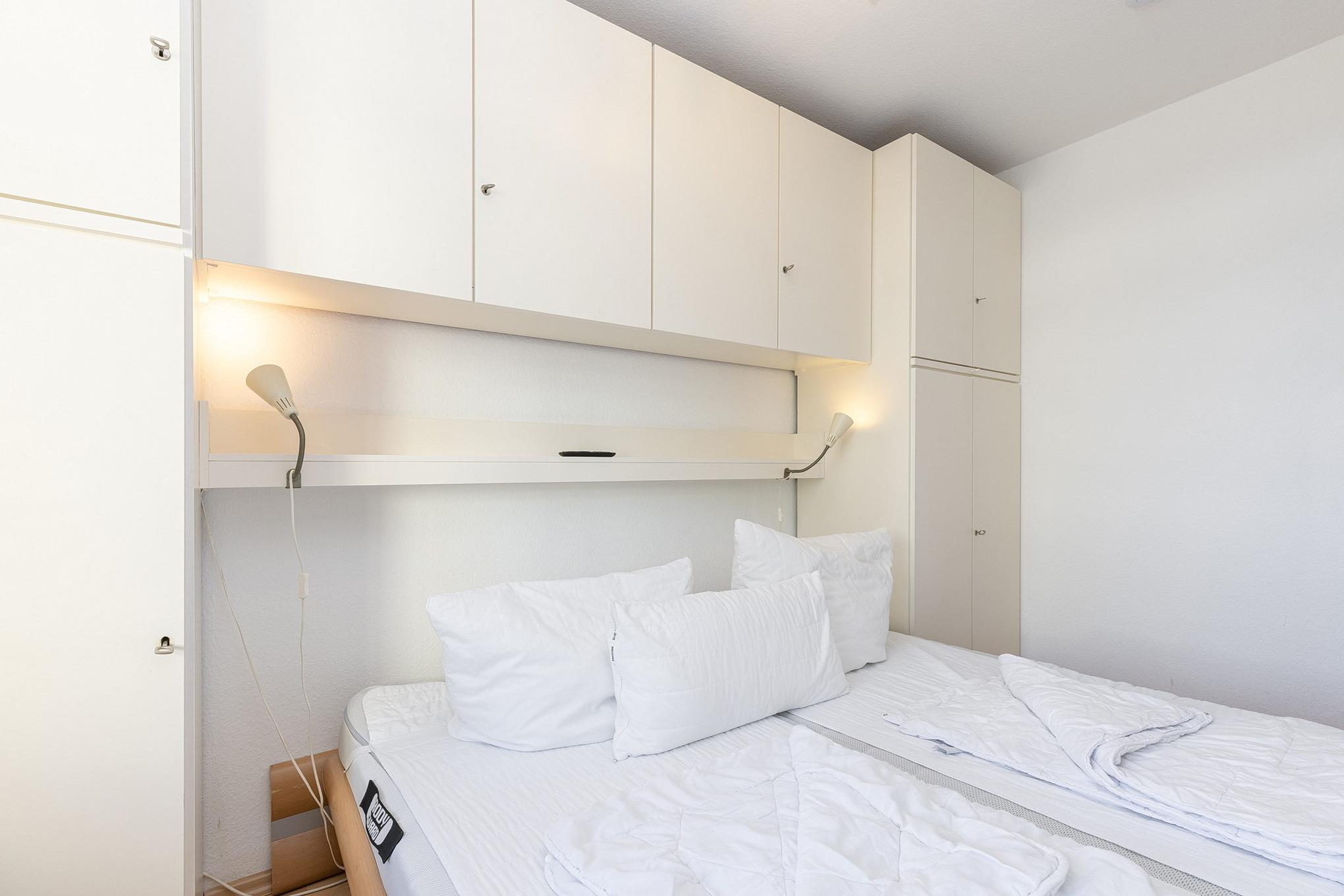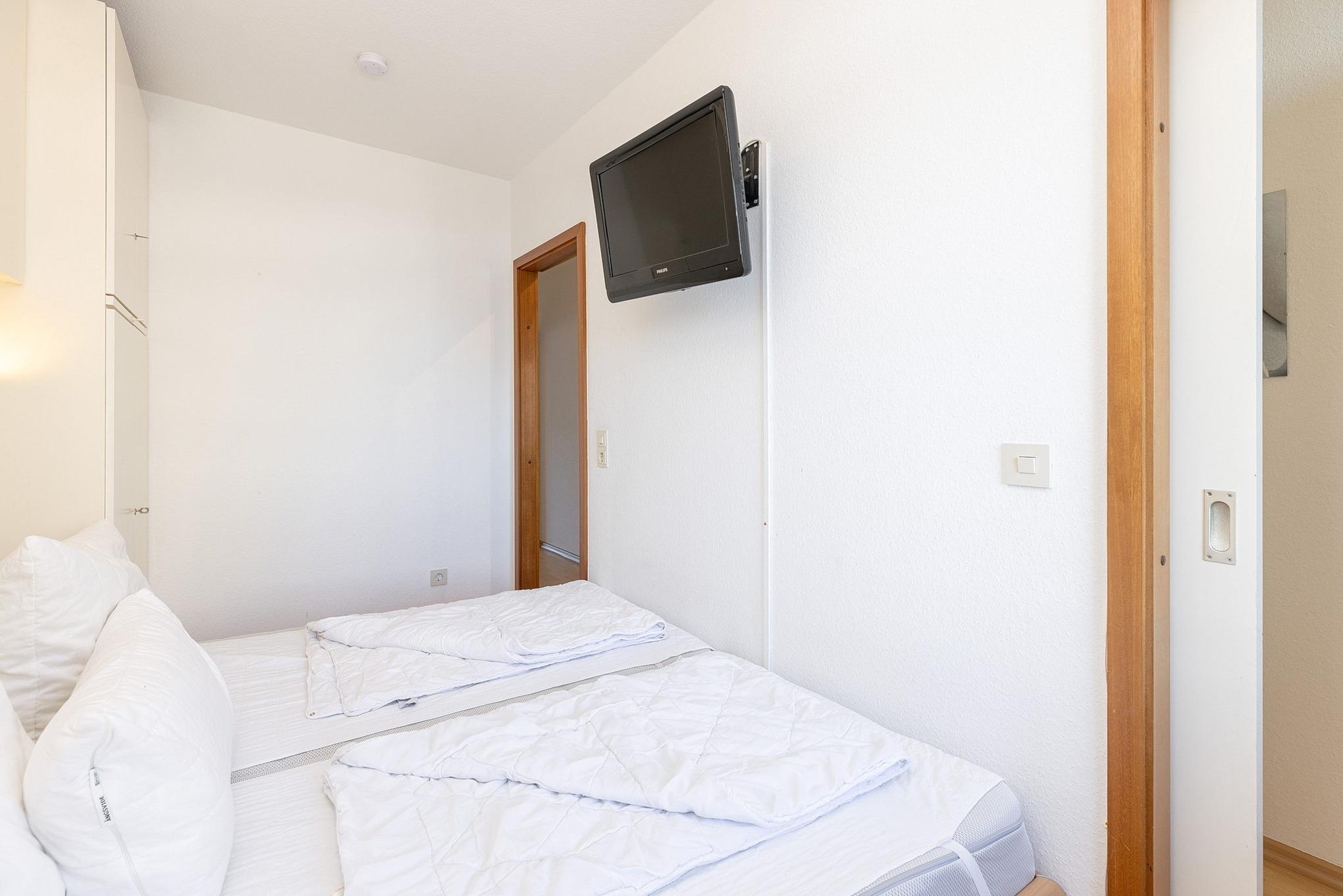 Kleines Schlafzimmer mit Fenster zum Laubengang (Rollo). Ausgestattet mit einem Doppelbett (2x90x200cm), je 1 Kleiderschrank auf beiden Seiten, Laminatfußboden, Fernseher.