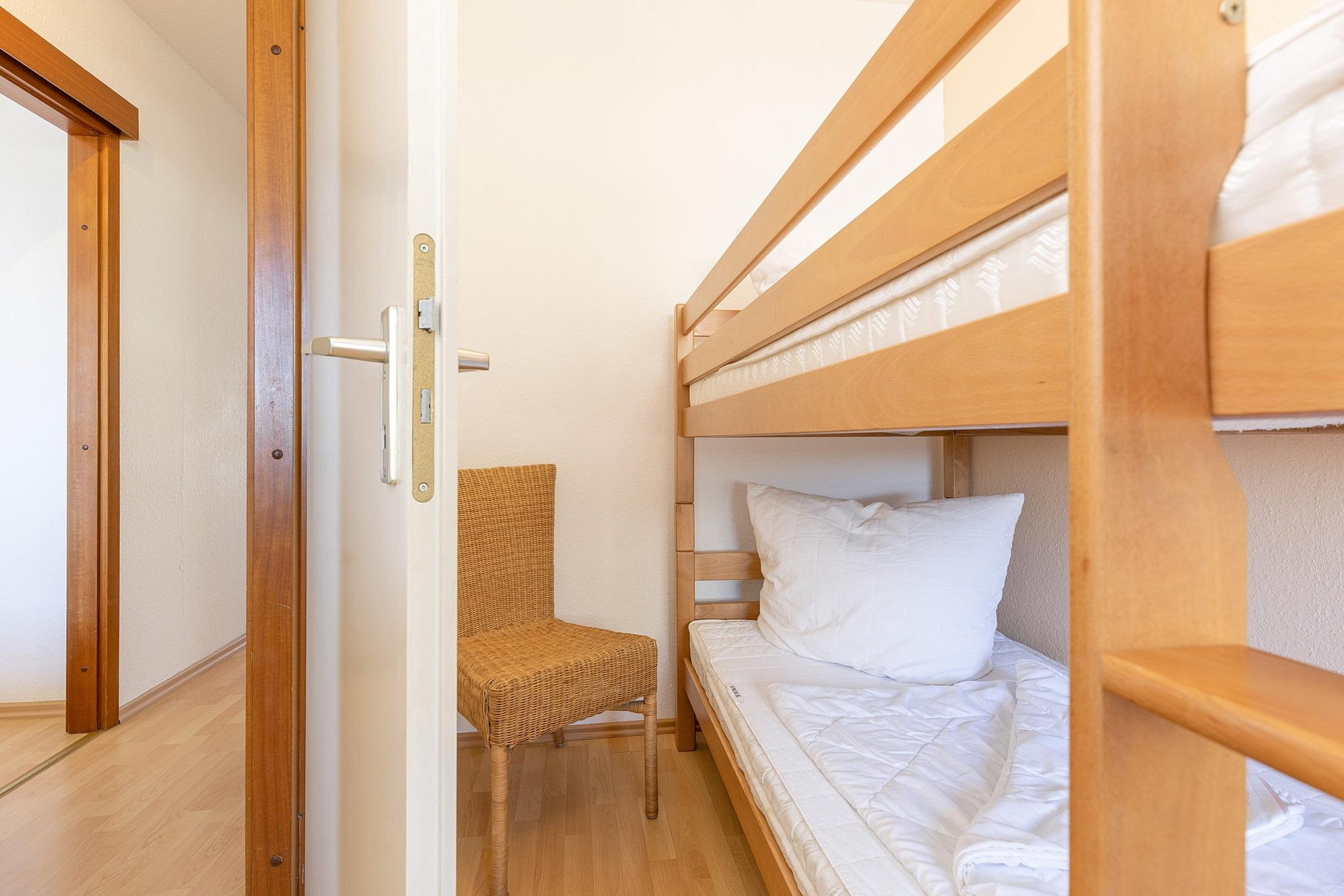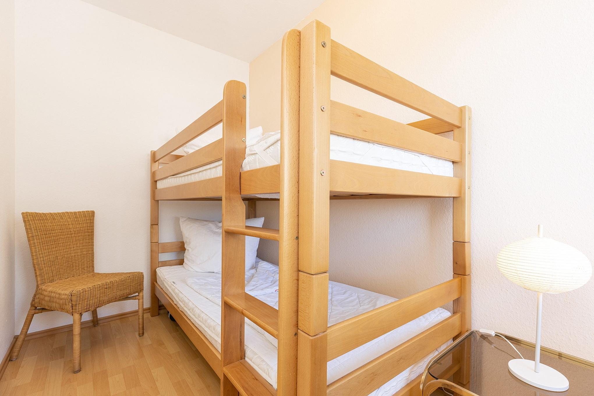 Kleines Kinderzimmer mit Fenster zum Laubengang (Rollo). Ausgestattet mit einem Etagenbett (90 x 200cm). Laminatfußboden.