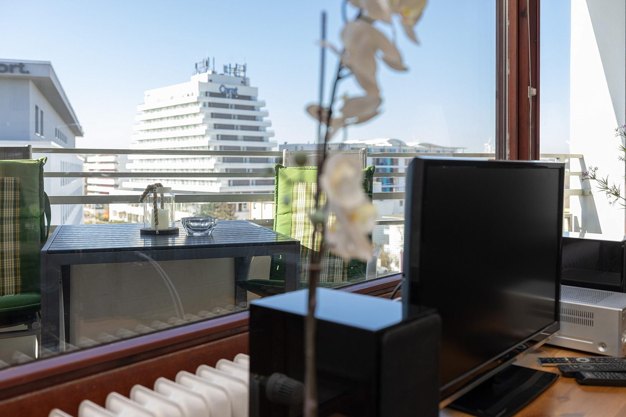 Balkon (mit Markise) in westliche Richtung mit Blick auf das Meer, Tiefgaragen-Stellplatz neben dem Eingang (max. 1,90m Höhe), Wäschetrockner und Waschmaschine gegen Gebühr im Haus. Kostenloses W-Lan.