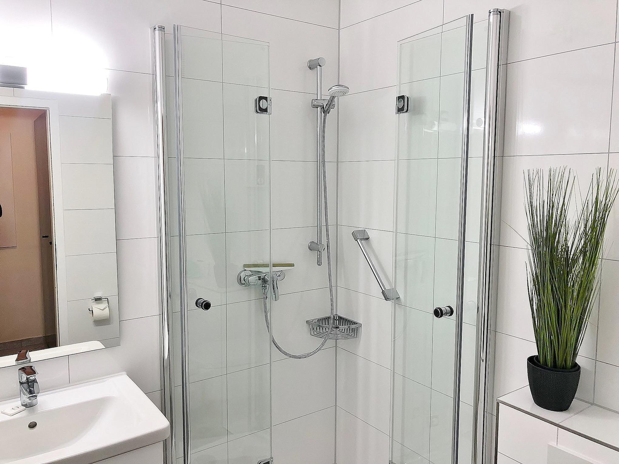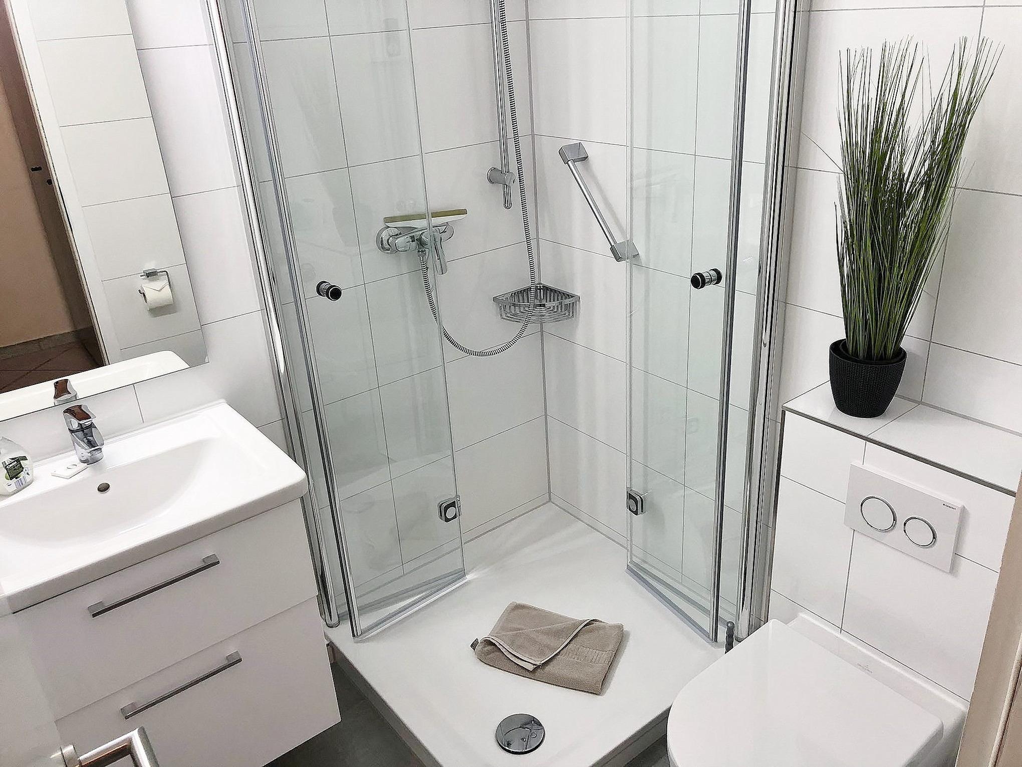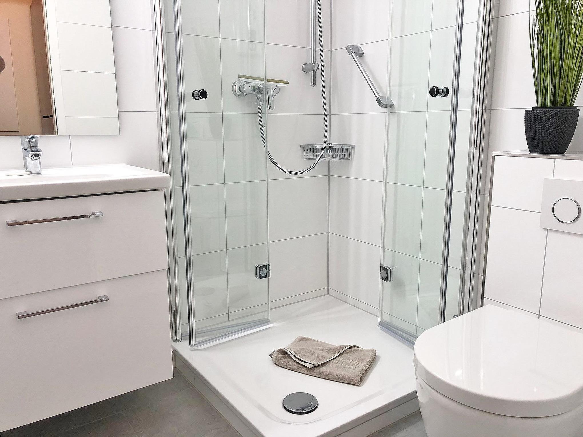 Hell gefliestes Bad mit Dusche, WC und Waschbecken.