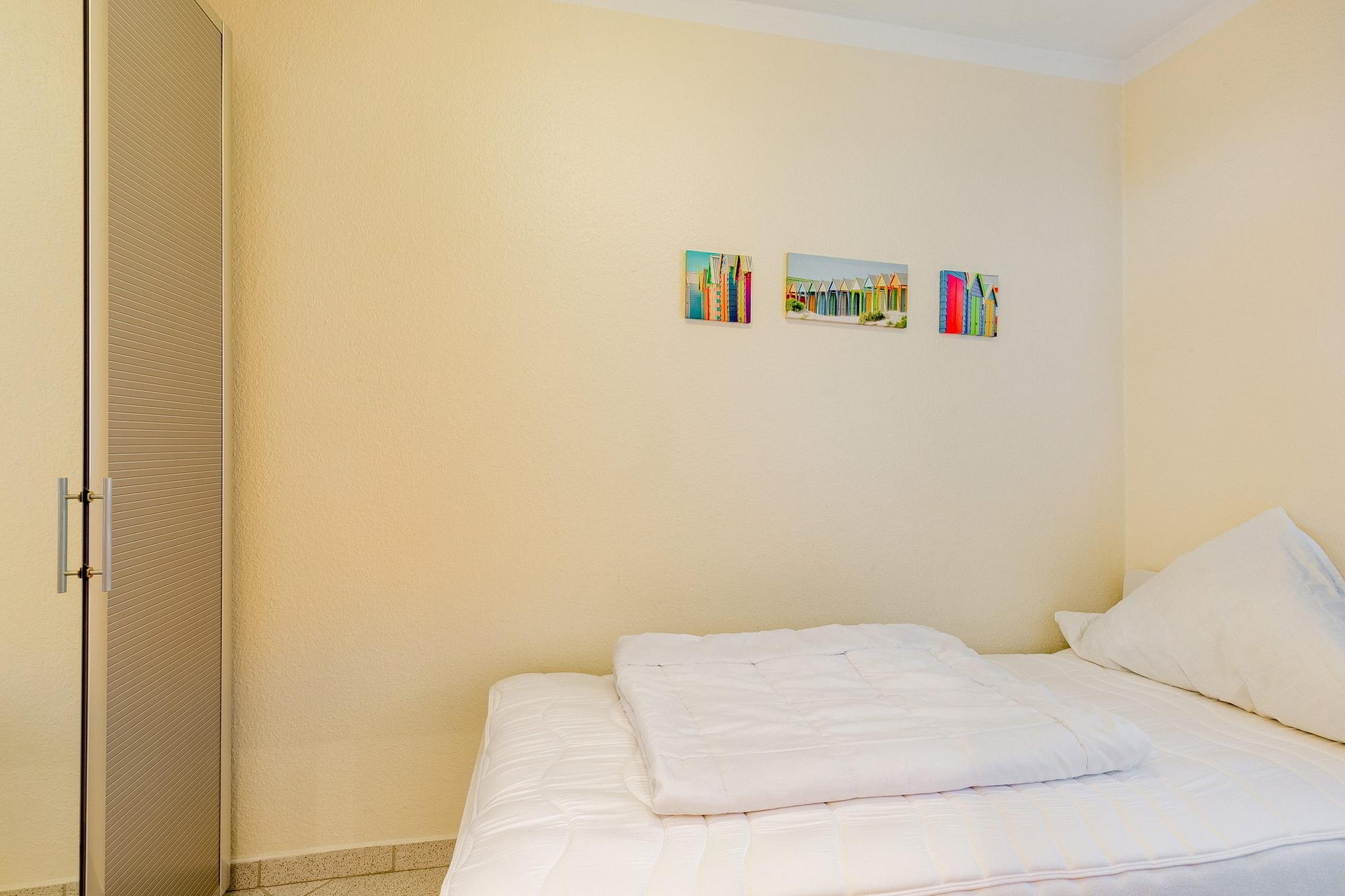 Hell gefliestes, separates Schlafzimmer mit einem Bett (90x190cm), einem Kleiderschrank und einer kleinen Kommode. Das Zimmer lässt sich durch einen Vorhang etwas verdunkeln.