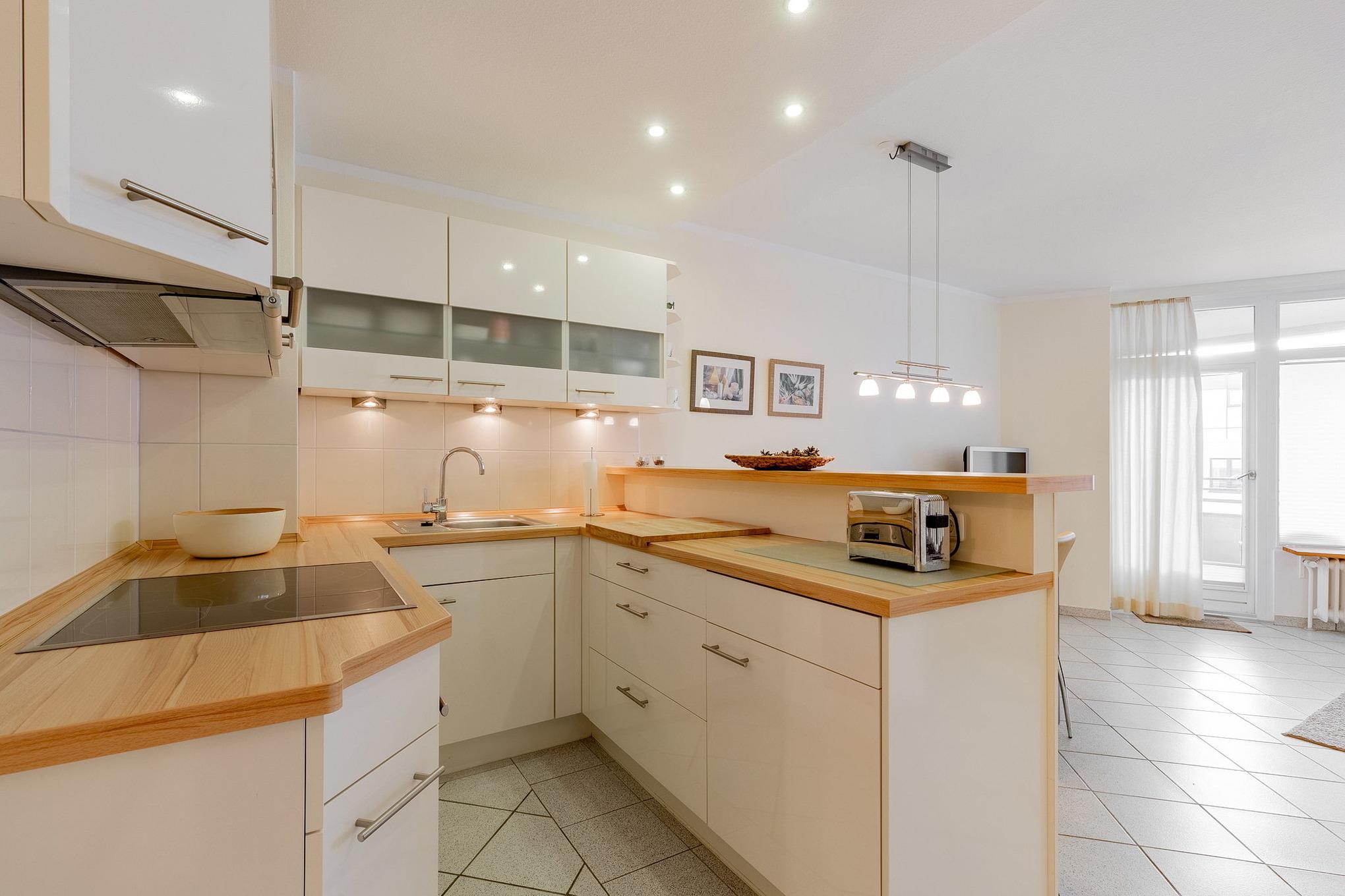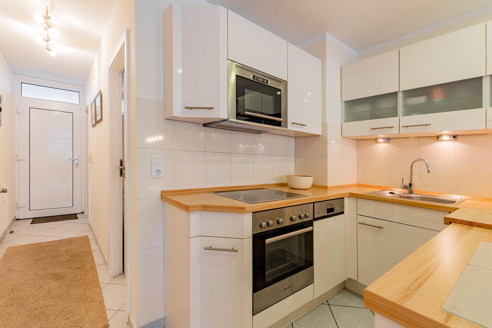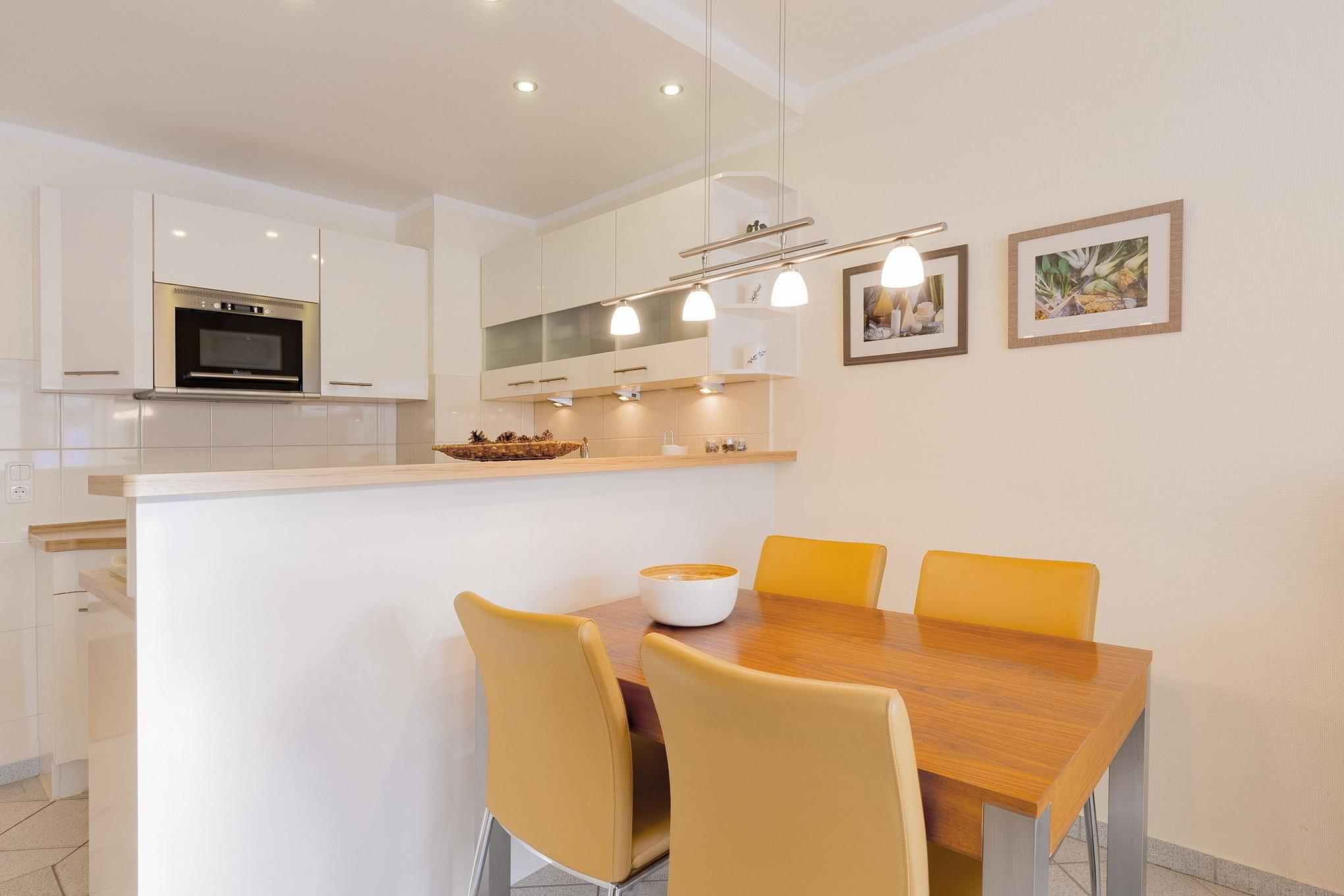 Moderne, zum Wohn- und Esszimmer offene, komplett eingerichtete Küche mit 4 Platten Cerankochfeld, Backofen, Spülmaschine, Kühlschrank mit kleinem 3-Sterne Gefrierfach, Mikrowelle, Toaster, Wasserkocher und Kaffeemaschine.