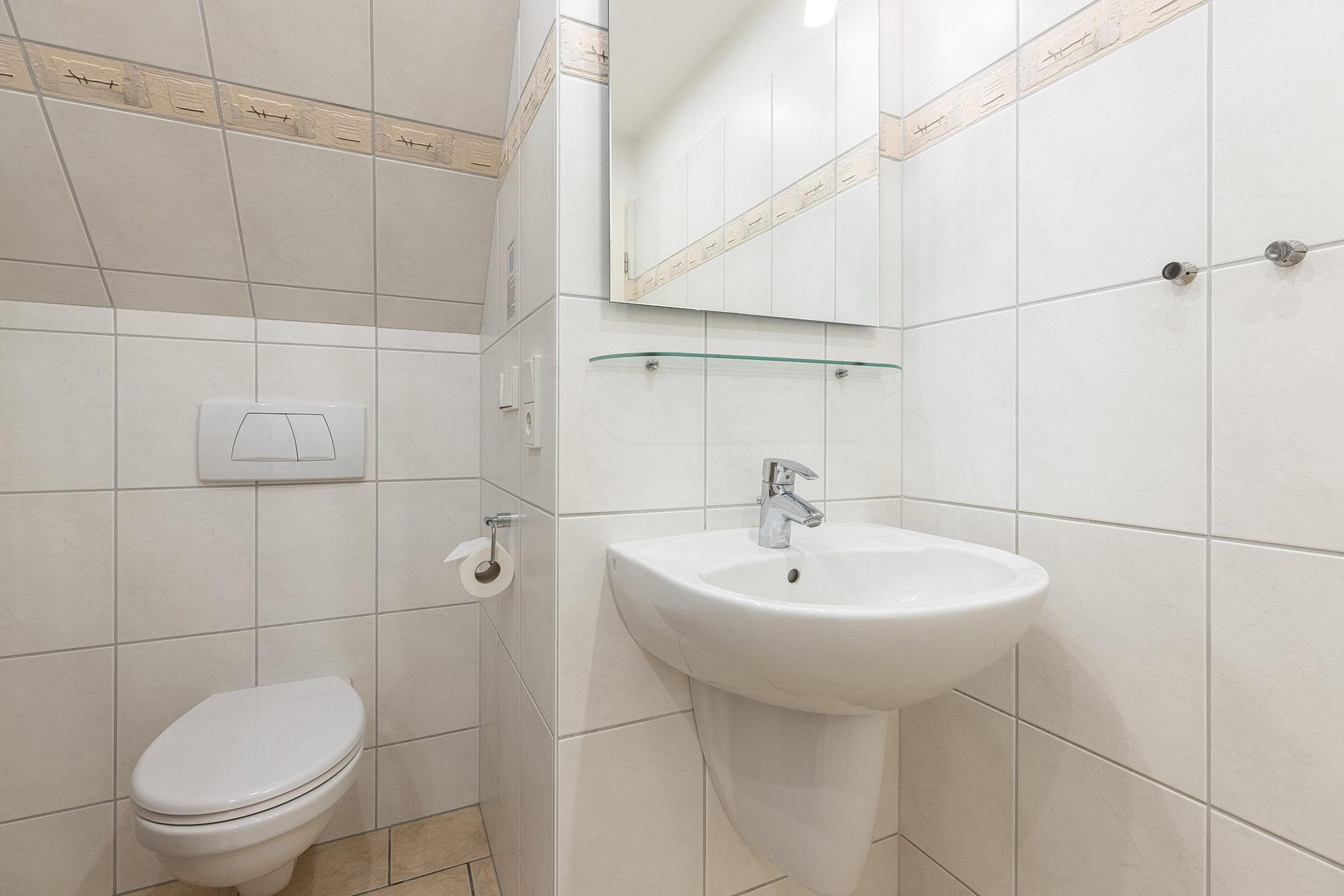 Modernes, hell gefliestes Bad im 1.OG. Das Bad ist mit einer Whirlpool-Badewanne, einem Waschbecken und einem WC ausgestattet. Die Fußbodenheizung sorgt für angenehm warme Füße.