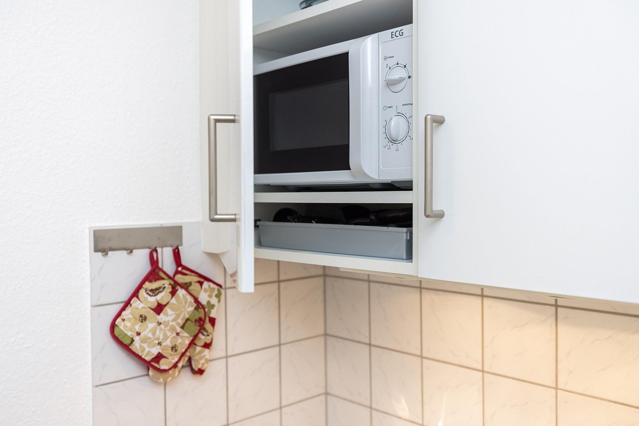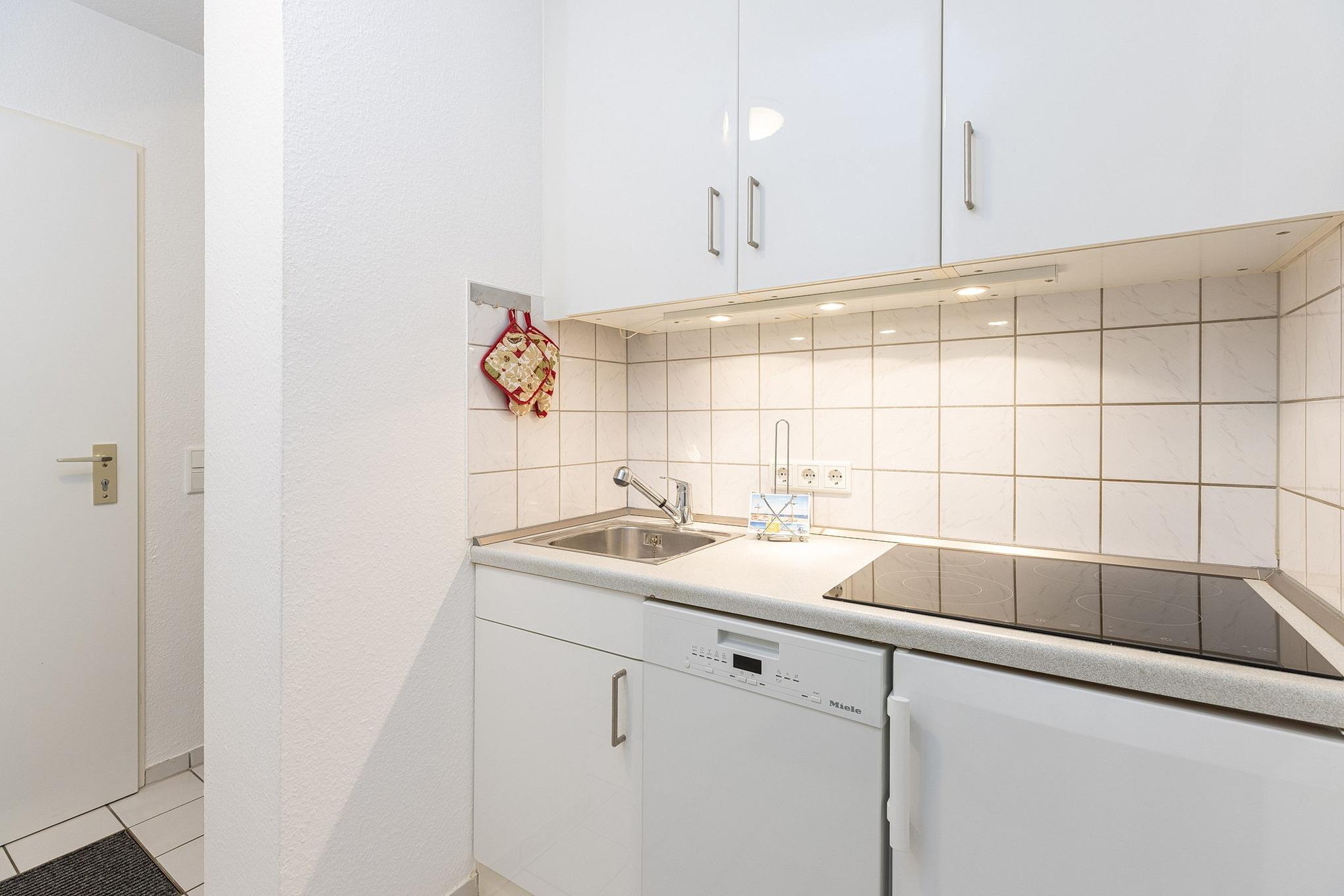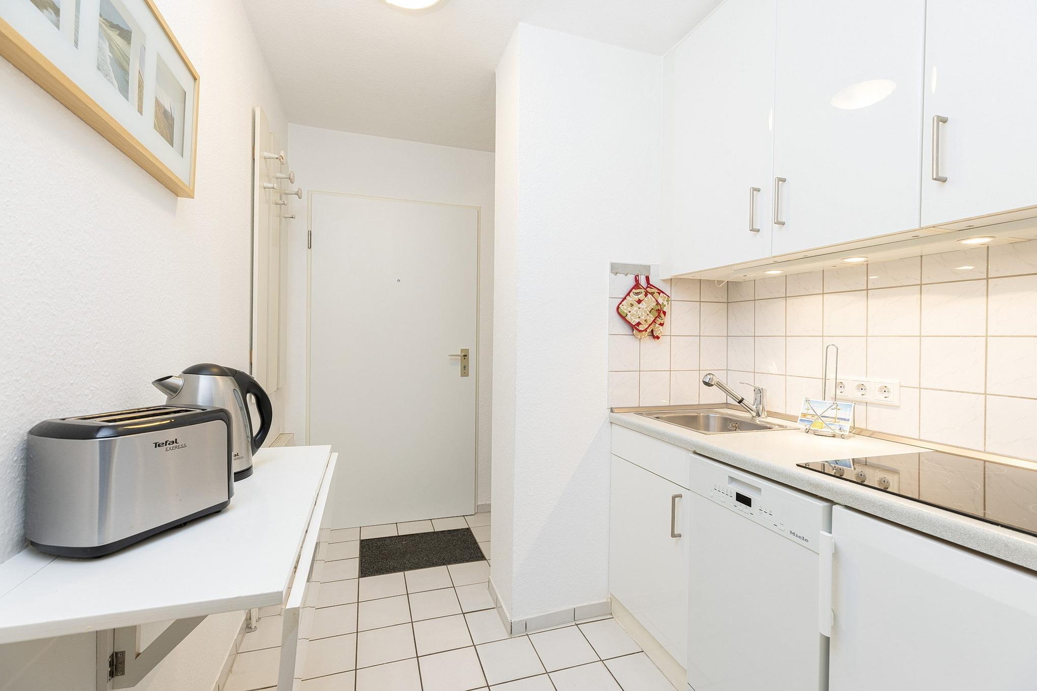 Moderne, komplett ausgestattete Pantry-Küche im EG. Die Pantry-Küche ist mit einem 4-Platten Cerankochfeld, einer Spülmaschine, einem Kühlschrank mit kleinem 3-Sterne Gefrierfach, einer Mikrowelle, einem Wasserkocher, einem Toaster und einer Kaffeemaschine ausgestattet.