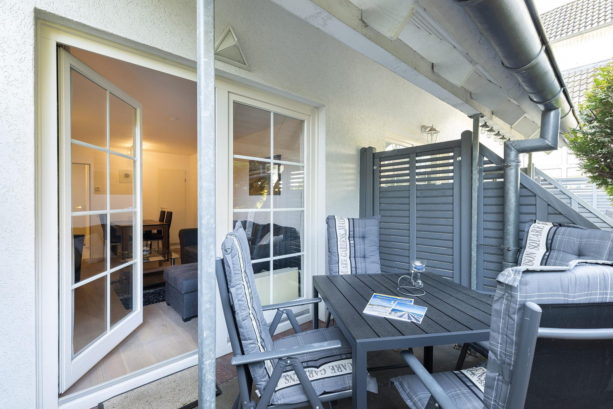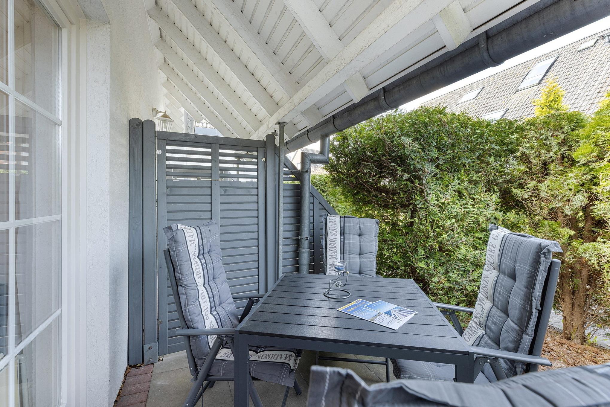 Terrasse in nord-westliche Richtung, Fahrrad-Abstellfläche im Freien hinter dem Gebäude. Kostenloser Strandkorb am Strand Nähe Seebrücke Richtung Grömitzer Welle im Zeitraum vom 15. April bis 20. September, unbegrenzte W-Lan Nutzung inklusive.