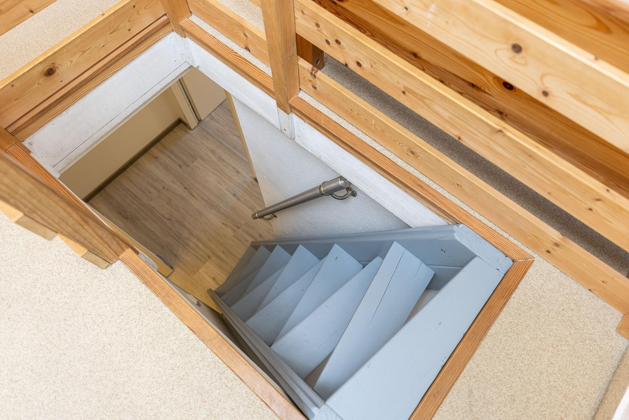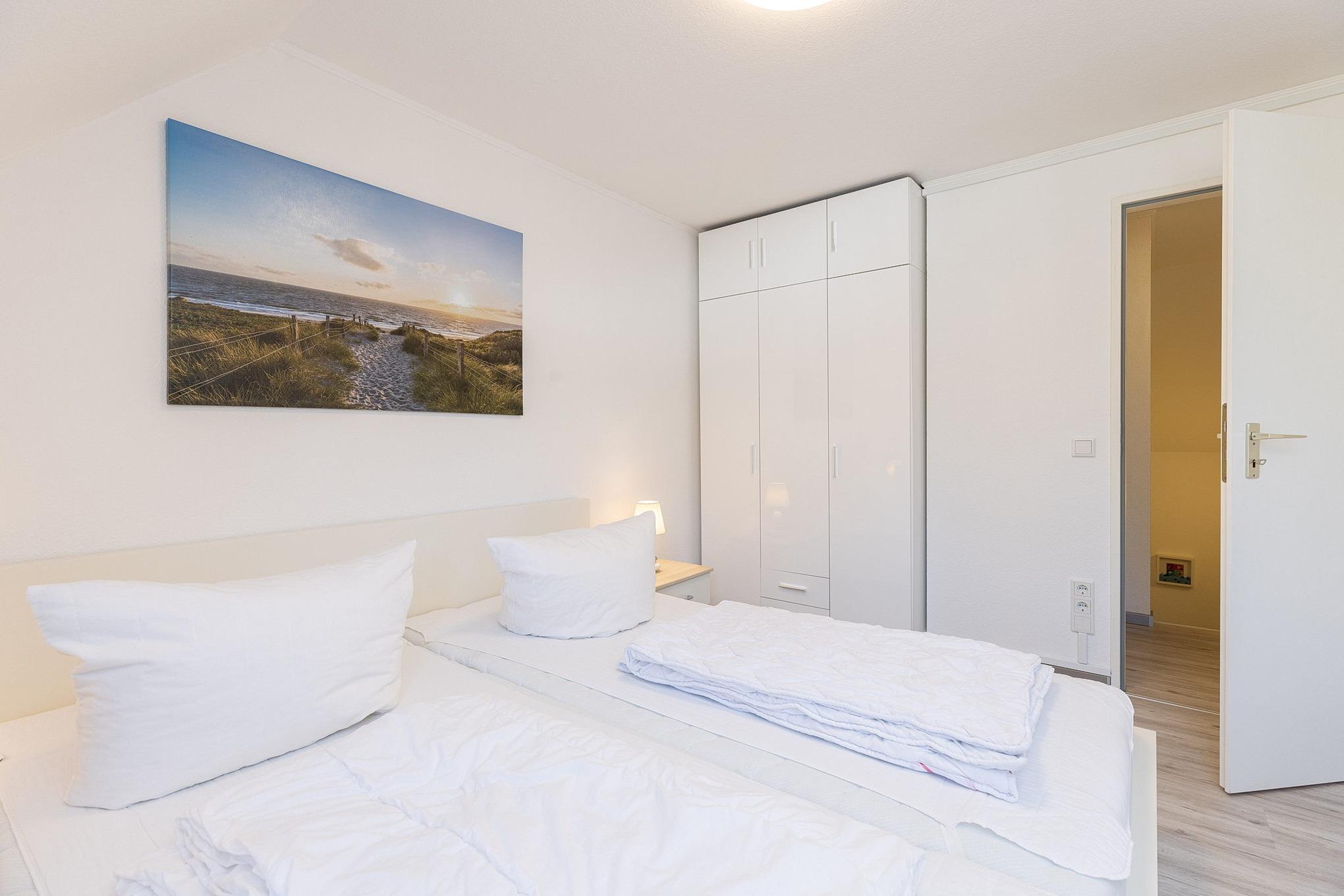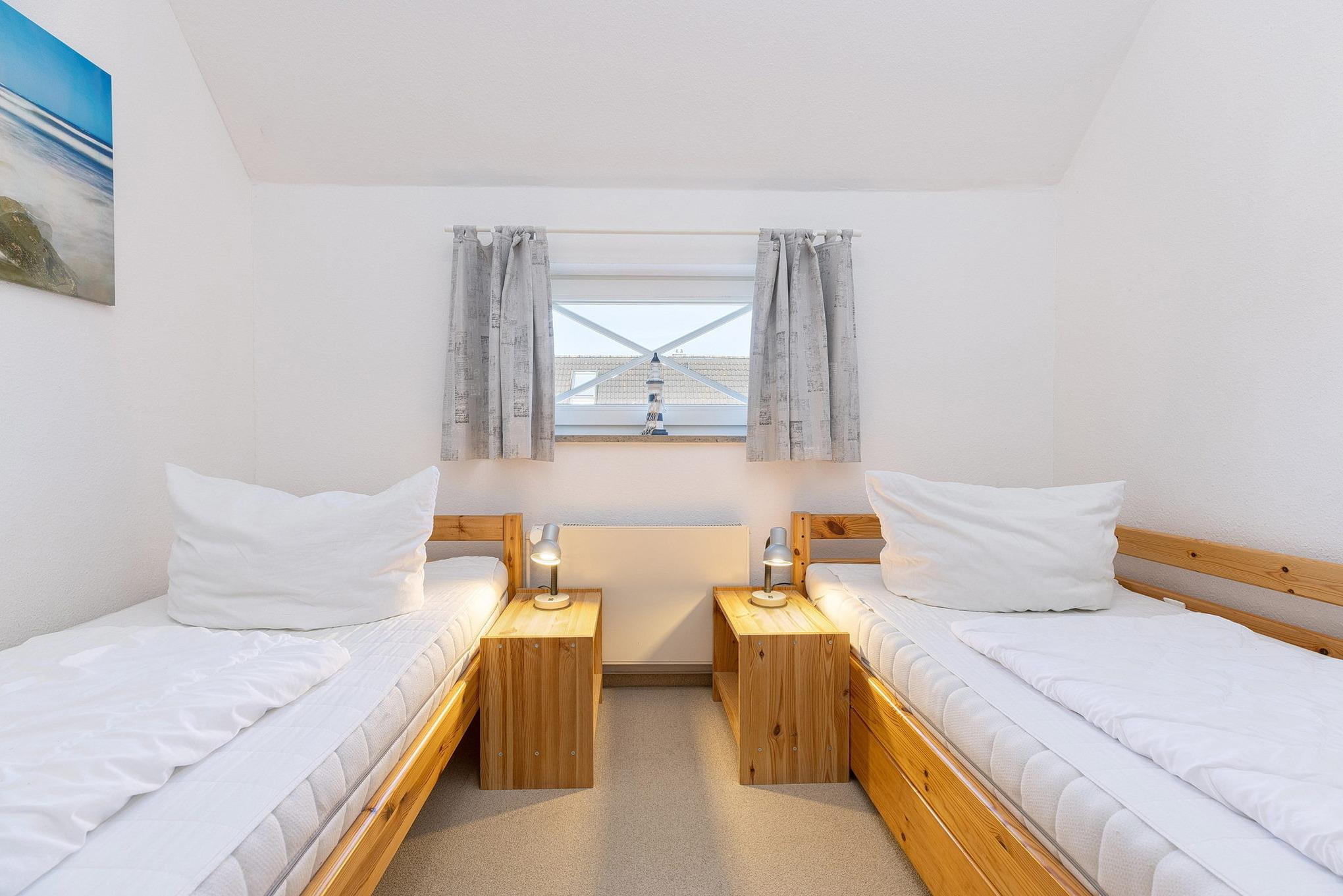 Das Schlafzimmer im 2. OG ist über eine steile und sehr geräuscharme Raumspartreppe erreichbar. Das Schlafzimmer ist mit 2 getrennten Betten (90x200cm), zwei Nachttischen, einem Kleiderschrank und einer Kommode ausgestattet. Das Zimmer ist mit Teppichboden ausgelegt. Das Fenster lässt sich durch einen blickdichten Vorhang verdunkeln.