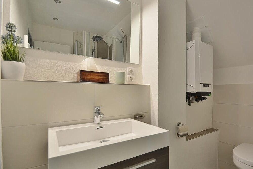 Modernes Bad mit Regendusche, WC und Waschbecken.