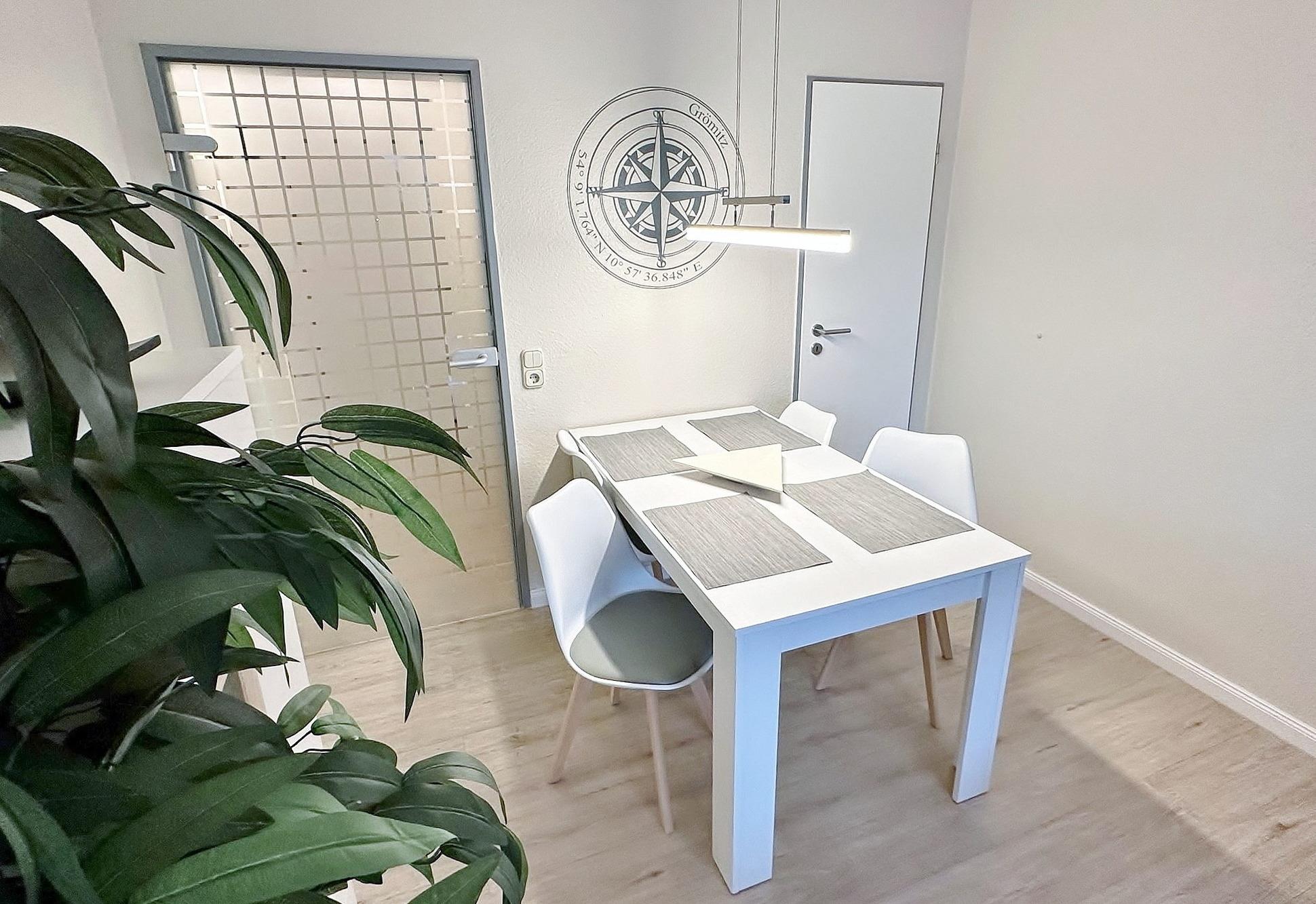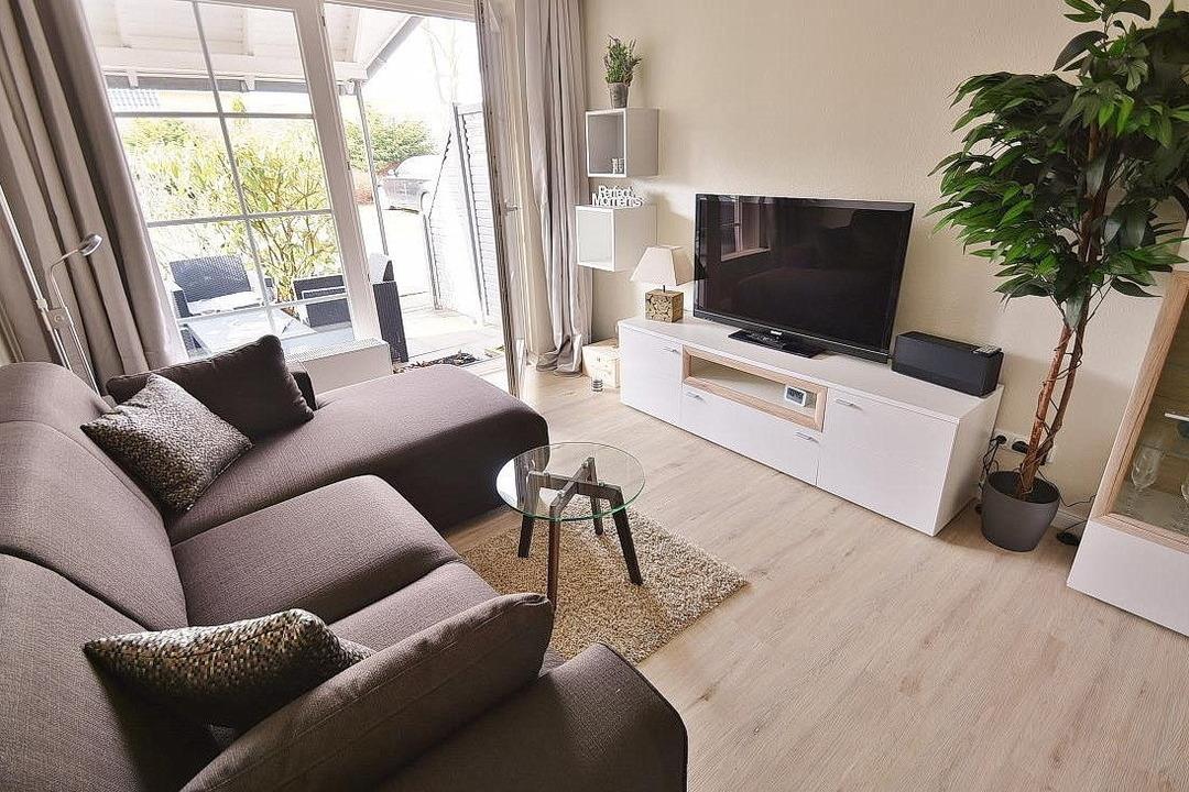 Modernes helles Wohn- und Esszimmer mit direktem Zugang zur Terrasse. Der Wohnbereich ist mit einer gemütlichen Eckcouch, einem Couchtisch, einem Sideboard sowie einem Essplatz für 4 Personen ausgestattet. Zur Unterhaltung stehen ein 46-Zoll-Flachbild-Fernseher und eine Bluetooth-/CD Stereoanlage zur Verfügung. Der Raum ist mit Designerplanken ausgelegt.