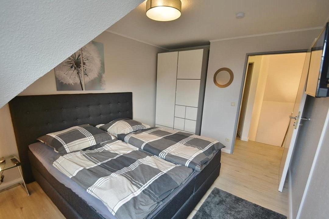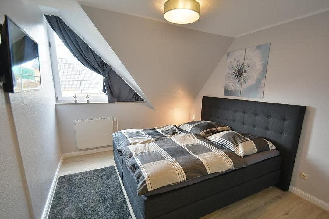 Helles freundliches Schlafzimmer mit Boxspringbett (180x200cm) und einem Kleiderschrank. Auch im Schlafzimmer steht ein Fernseher zur Verfügung. Der Raum ist mit Designerplanken ausgelegt und lässt sich durch einen Vorhang verdunkeln.