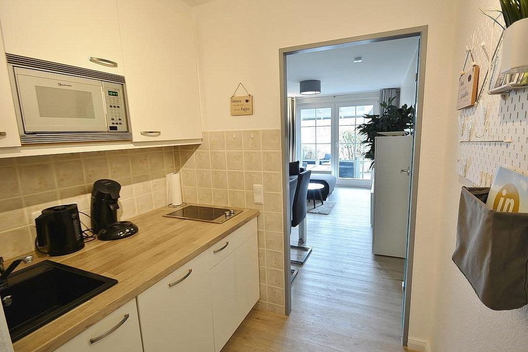 Komplett ausgestattete Küchenzeile mit 2 Platten-Cerankochfeld, Spülmaschine und Mikrowelle. Außerdem stehen eine Kaffeemaschine, ein Wasserkocher und ein Toaster zur Verfügung.