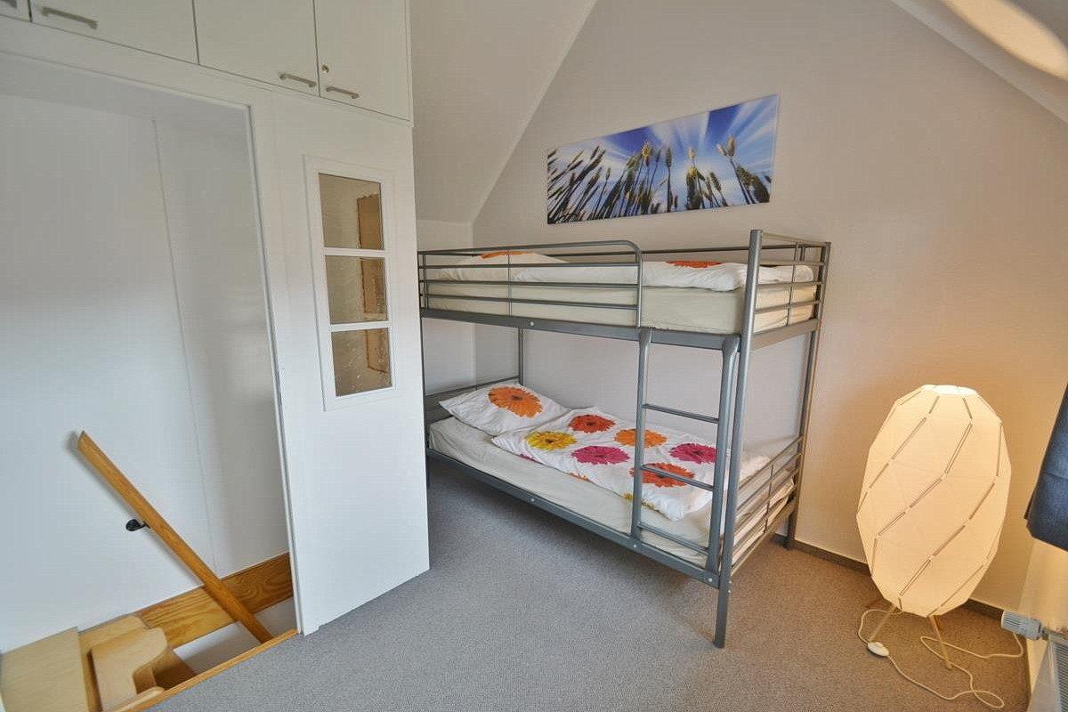 Das Kinderzimmer liegt in der 2. Etage und ist über eine Raumspartreppe erreichbar. Das Zimmer ist mit einem Etagenbett (2x90x200cm) sowie einem begehbaren Kleiderschrank ausgestattet. Der Raum ist mit Teppichboden ausgelegt und lässt sich durch Vorhänge verdunkeln.