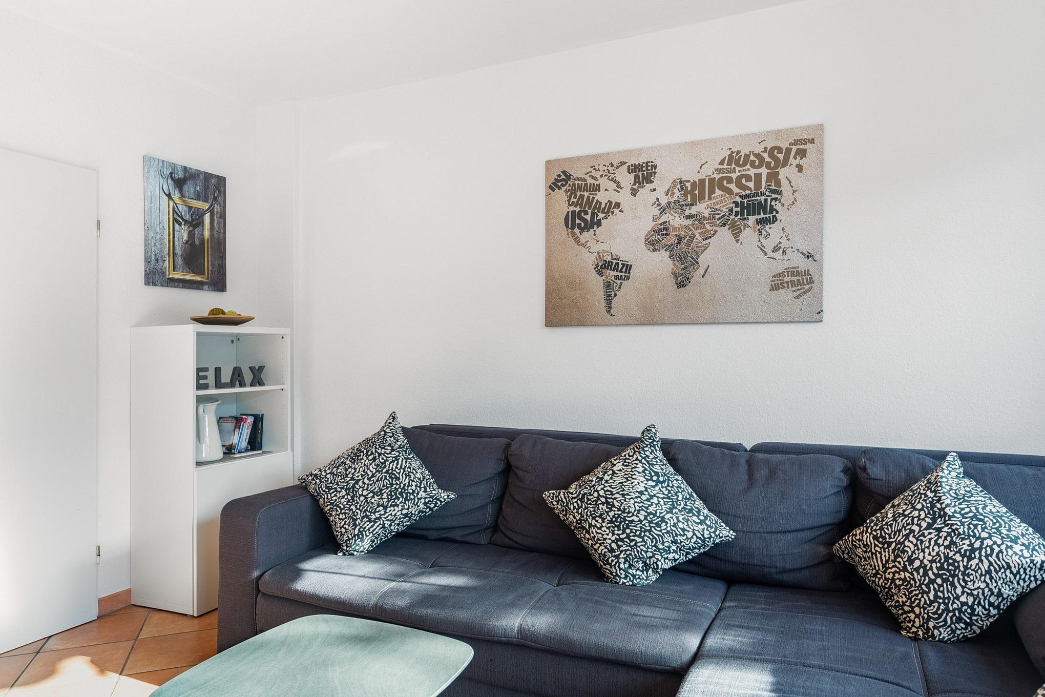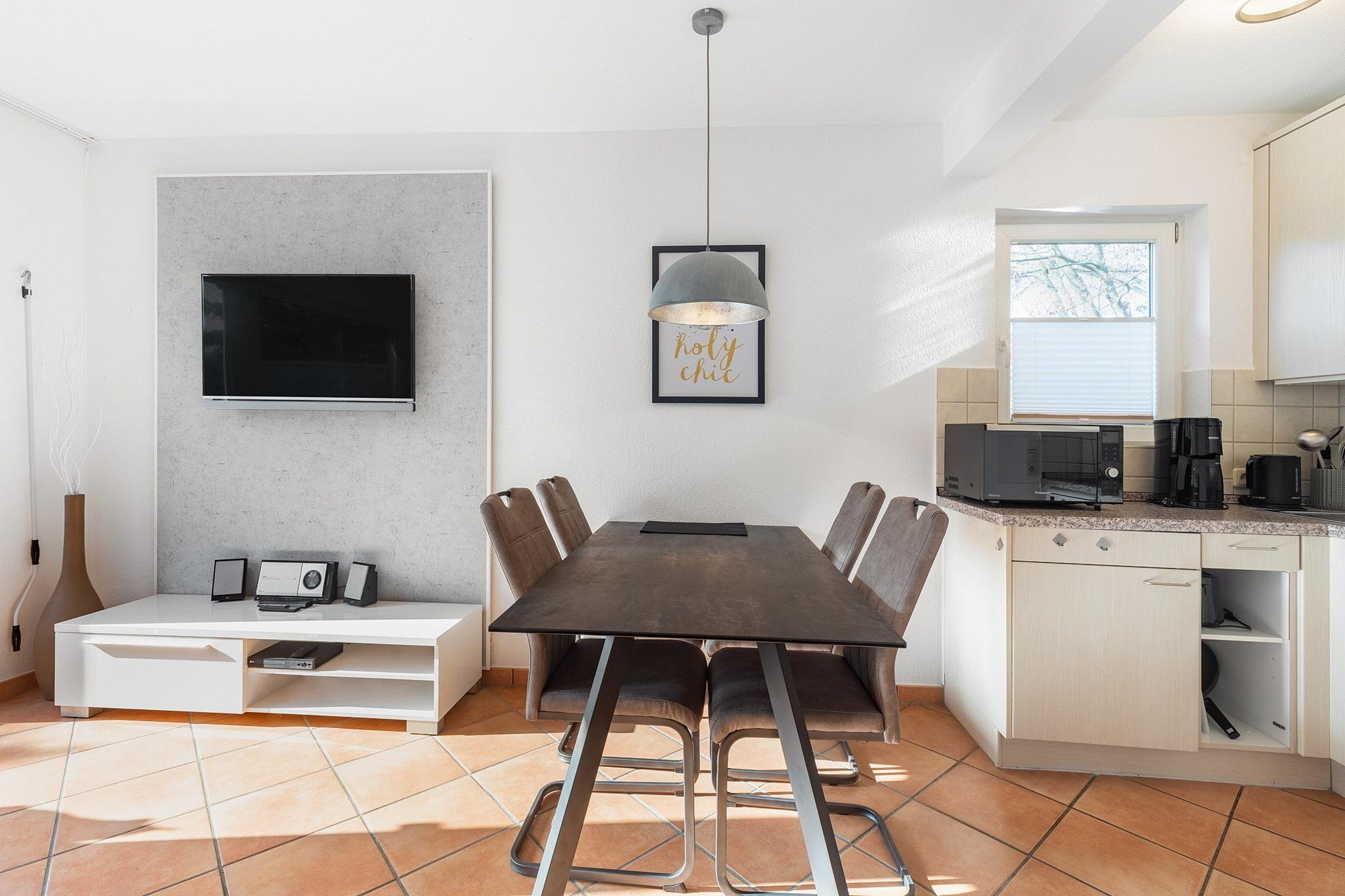 Helles gefliestes Wohn- und Esszimmer im Erdgeschoss mit einem Essplatz für 4 Personen, einer Eckcouch, Couchtisch und einer Kommode. Sat-TV, DVD-Player und eine Mini-Stereoanlage mit CD-Player stehen für die Unterhaltung bereit.