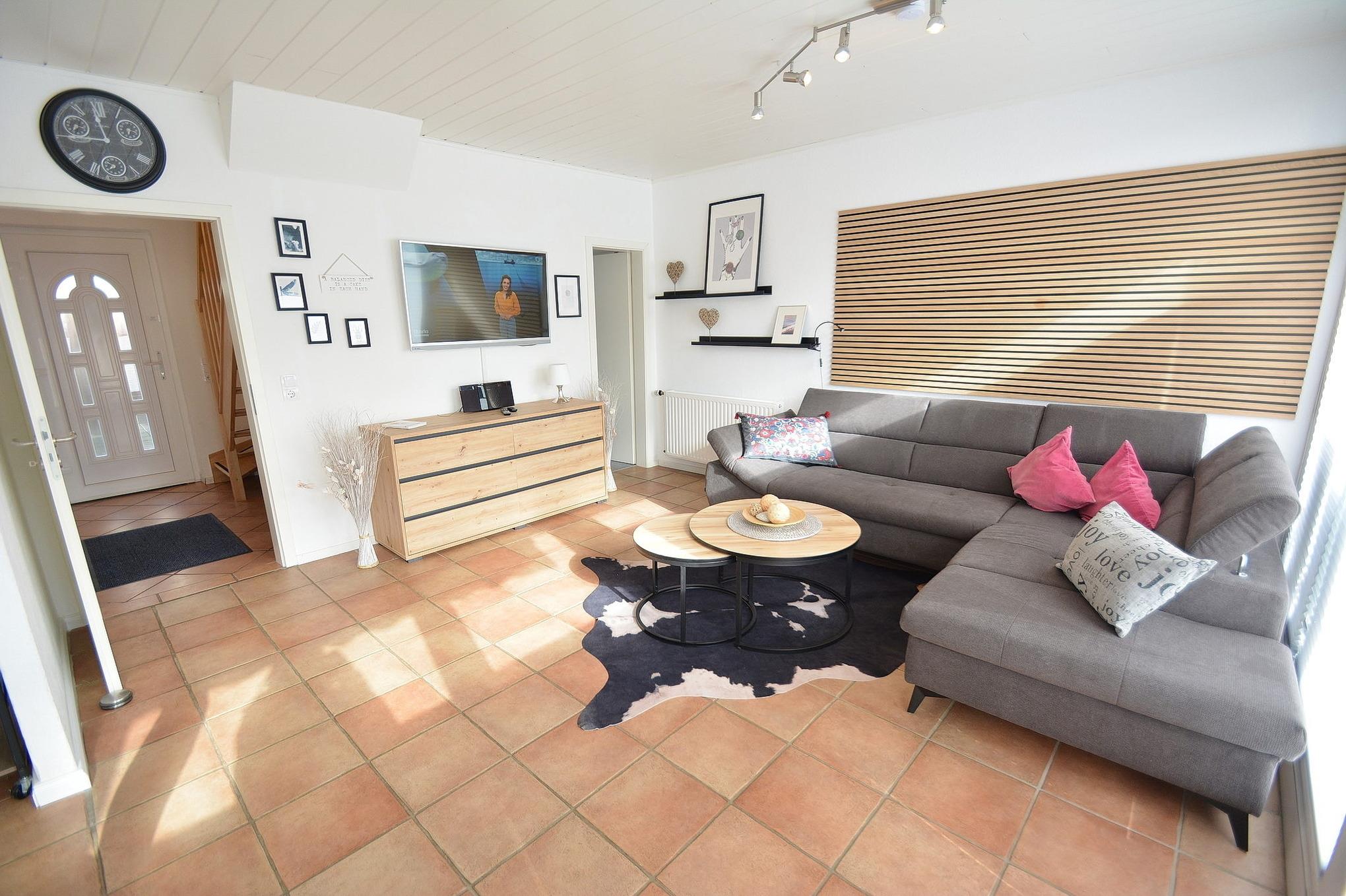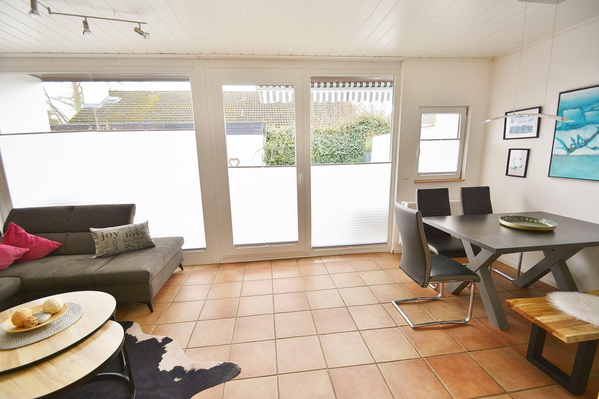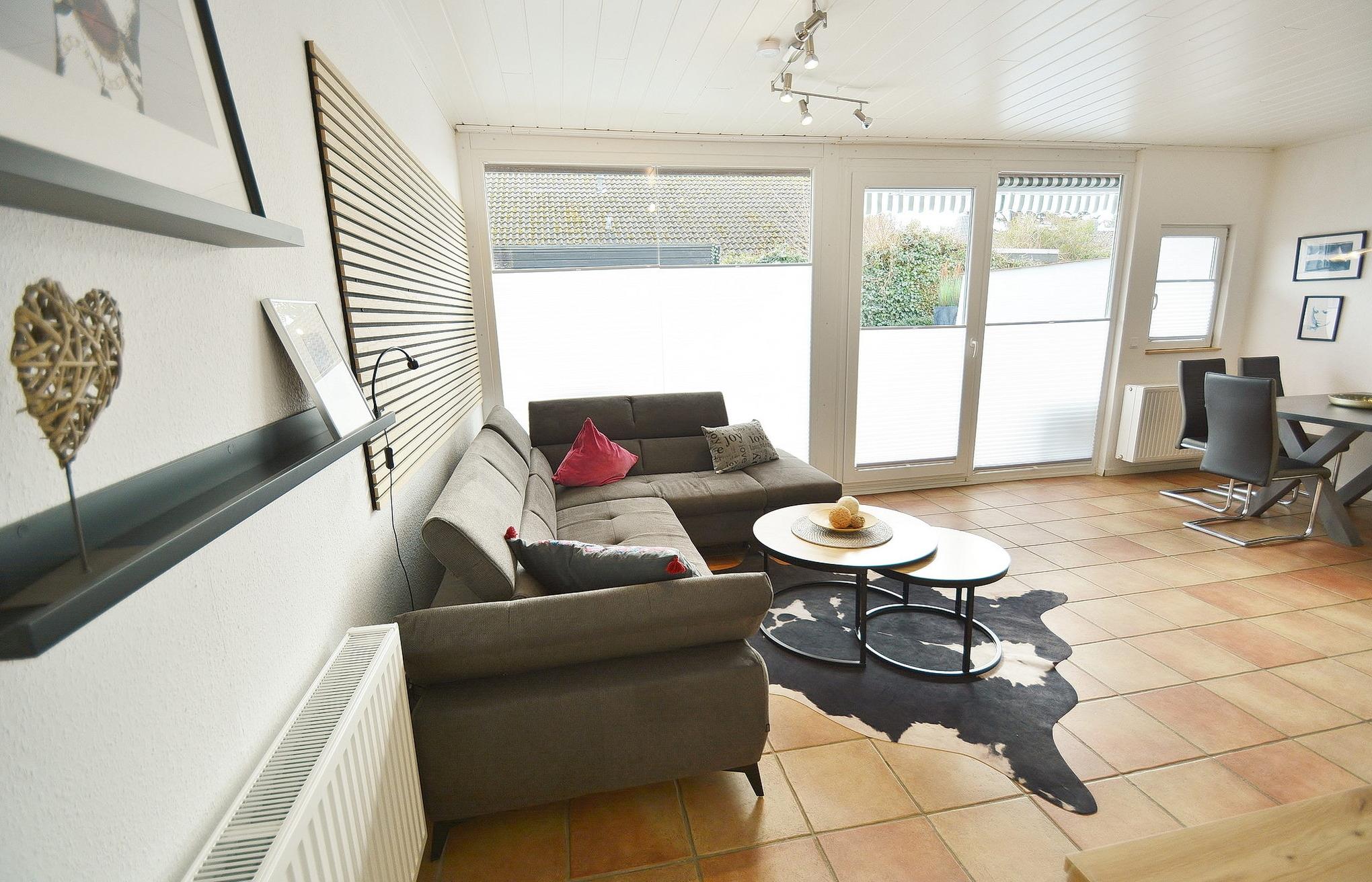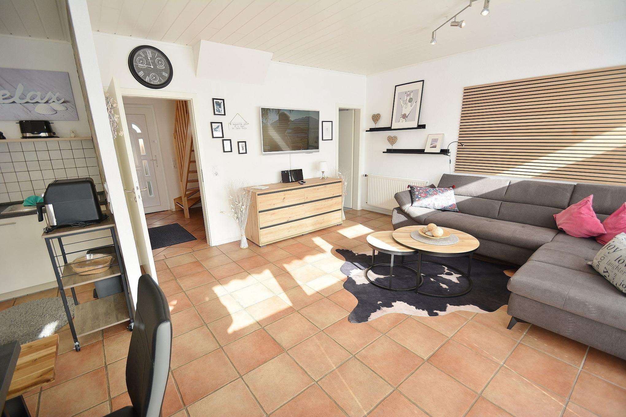 Das große, modern ausgestattete und geflieste Wohn- und Esszimmer befindet sich im Erdgeschoss. Das Zimmer ist mit einer Couch, einem Essplatz für 5 Personen, Sat-TV und Radio ausgestattet.