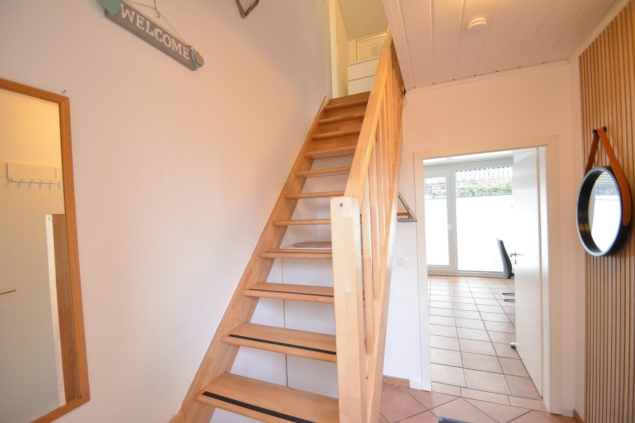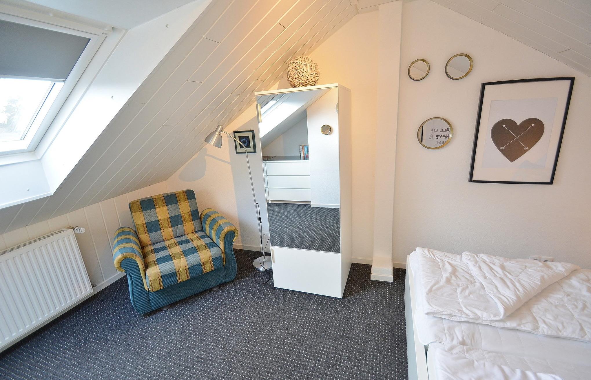 Das Kinderzimmer ist mit 2 Einzelbetten und einem Kleiderschrank ausgestattet und befindet sich im Obergeschoss (bitte beachten Sie, dass die Treppe steil ist). Das Zimmer ist mit Teppichboden ausgelegt, am Dachfenster befindet sich ein Verdunklungsrollo.