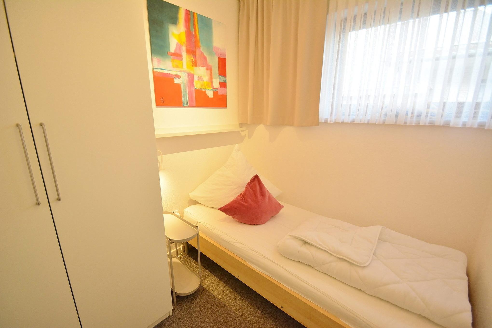Im Erdgeschoss befindet sich ein Gästezimmer mit Einzelbett (80x200cm) und Kleiderschrank. Das Zimmer ist mit Teppichboden ausgelegt. Das Fenster lässt sich durch einen Vorhang verdunkeln.