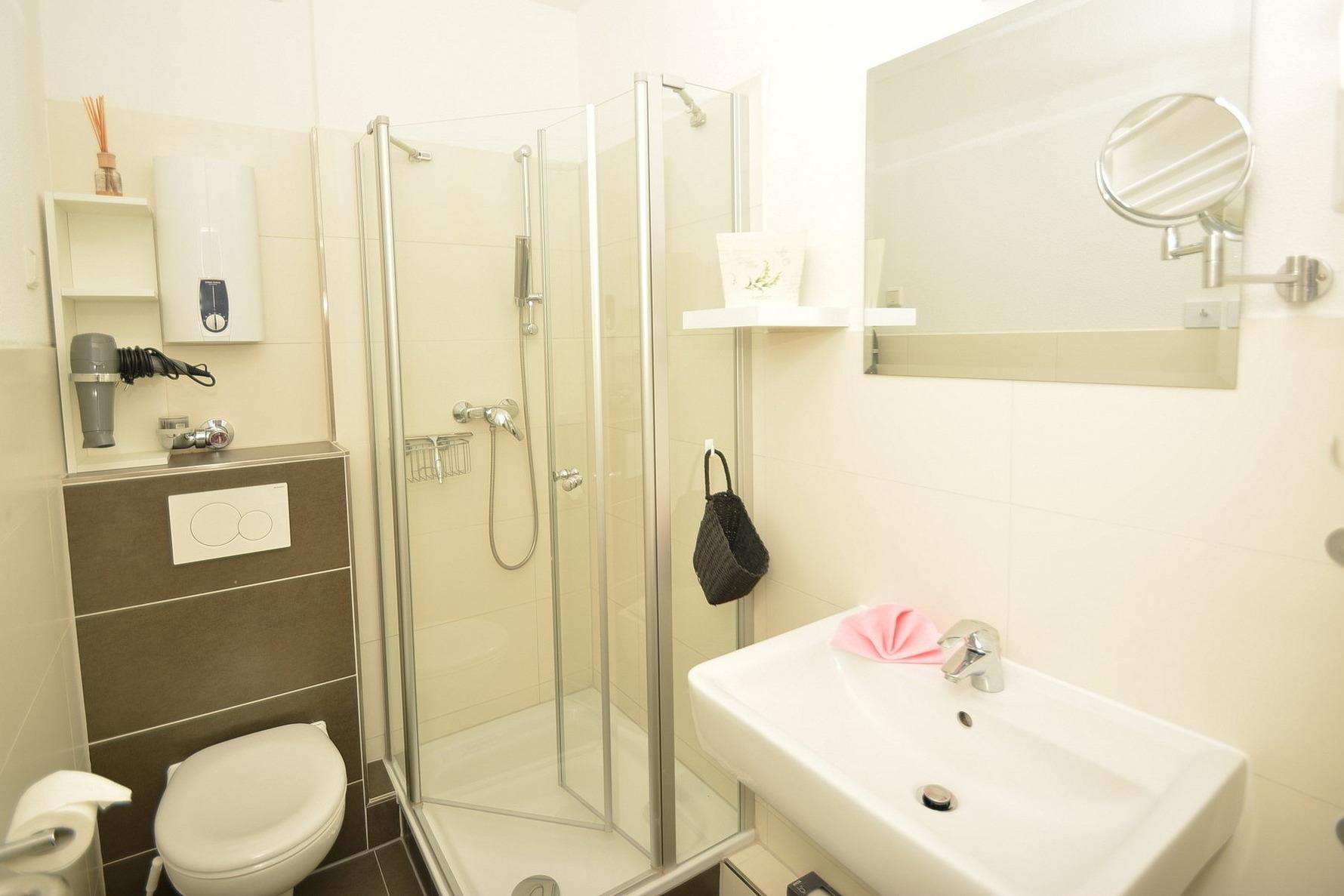 Modernes, hell gefliestes Bad mit Dusche, WC und Waschbecken.