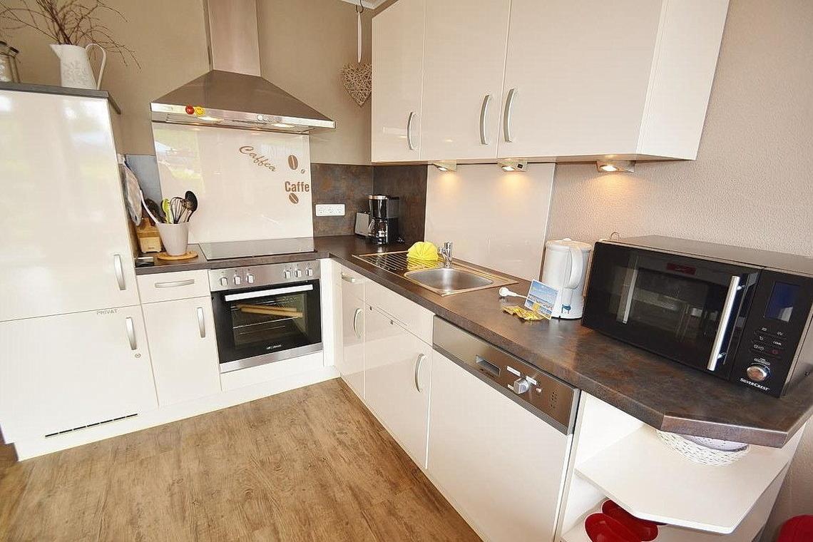 Moderne, komplett eingerichtete, zum Wohn- und Esszimmer offene Küche. Die Küche ist mit einem 4-Platten Cerankochfeld, einem Kühlschrank mit kleinem 3-Sterne Gefrierfach, einem Backofen sowie einer Spülmaschine ausgestattet. Des Weiteren stehen eine Mikrowelle, eine Kaffeemaschine, ein Toaster, ein Wasserkocher und ein Eierkocher zur Verfügung.