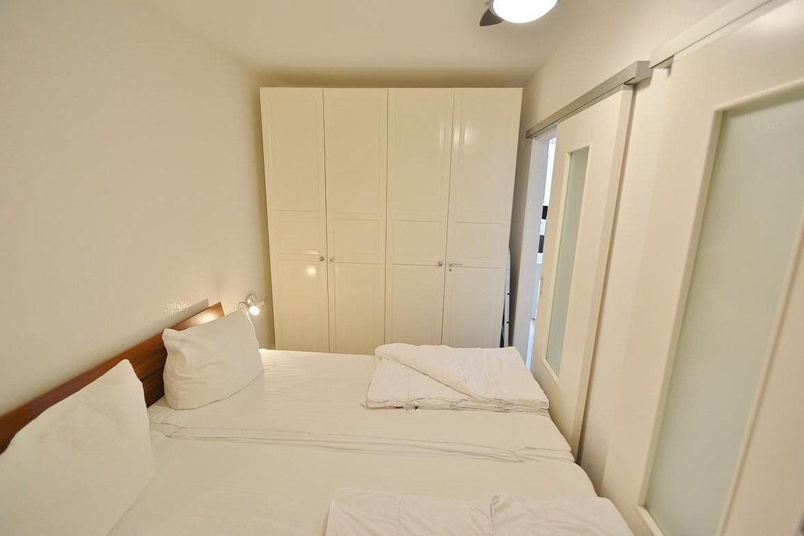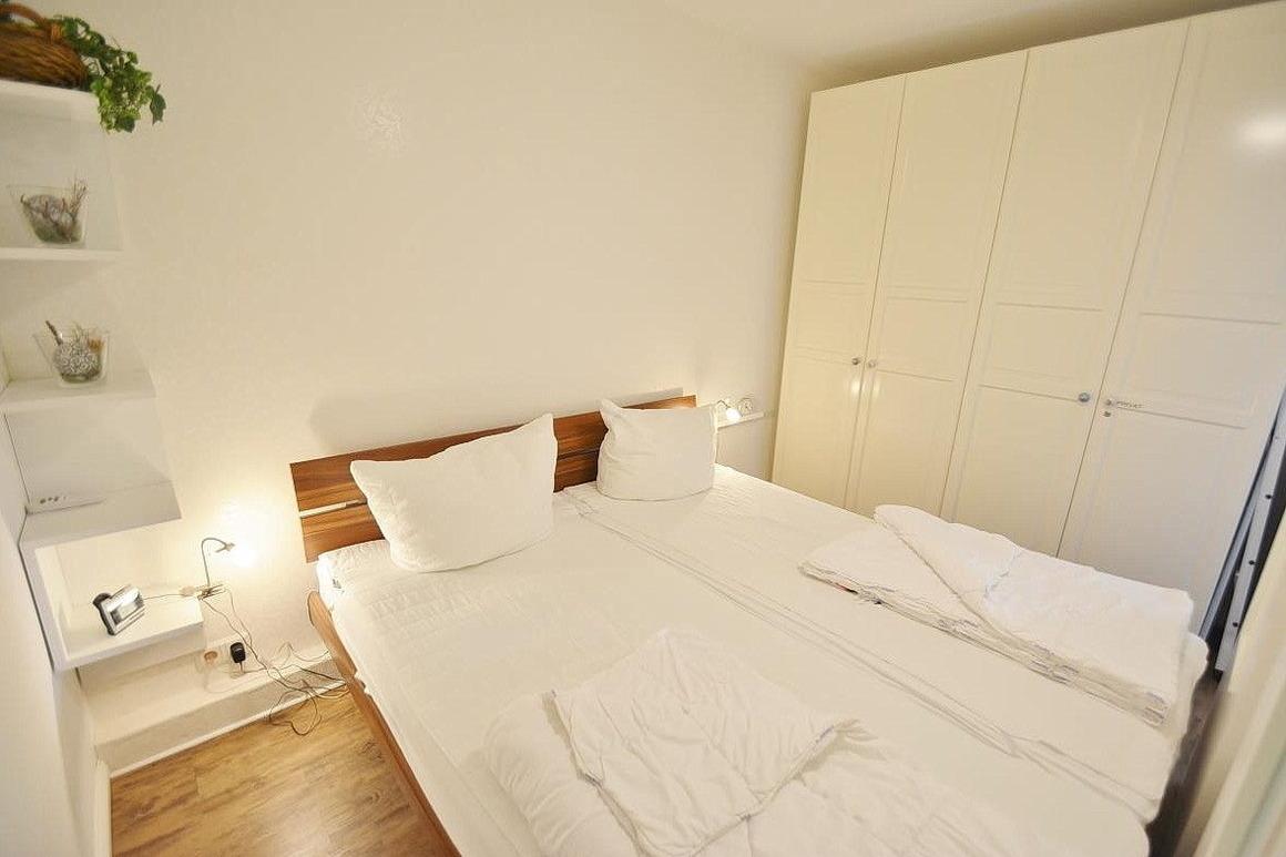 Modern eingerichtetes, kleines, innenliegendes Schlafzimmer mit einem Doppelbett (2x 90x200cm), einem Kleiderschrank sowie einem Deckenventilator. Das Schlafzimmer ist mit Designer-Vinylboden ausgelegt.