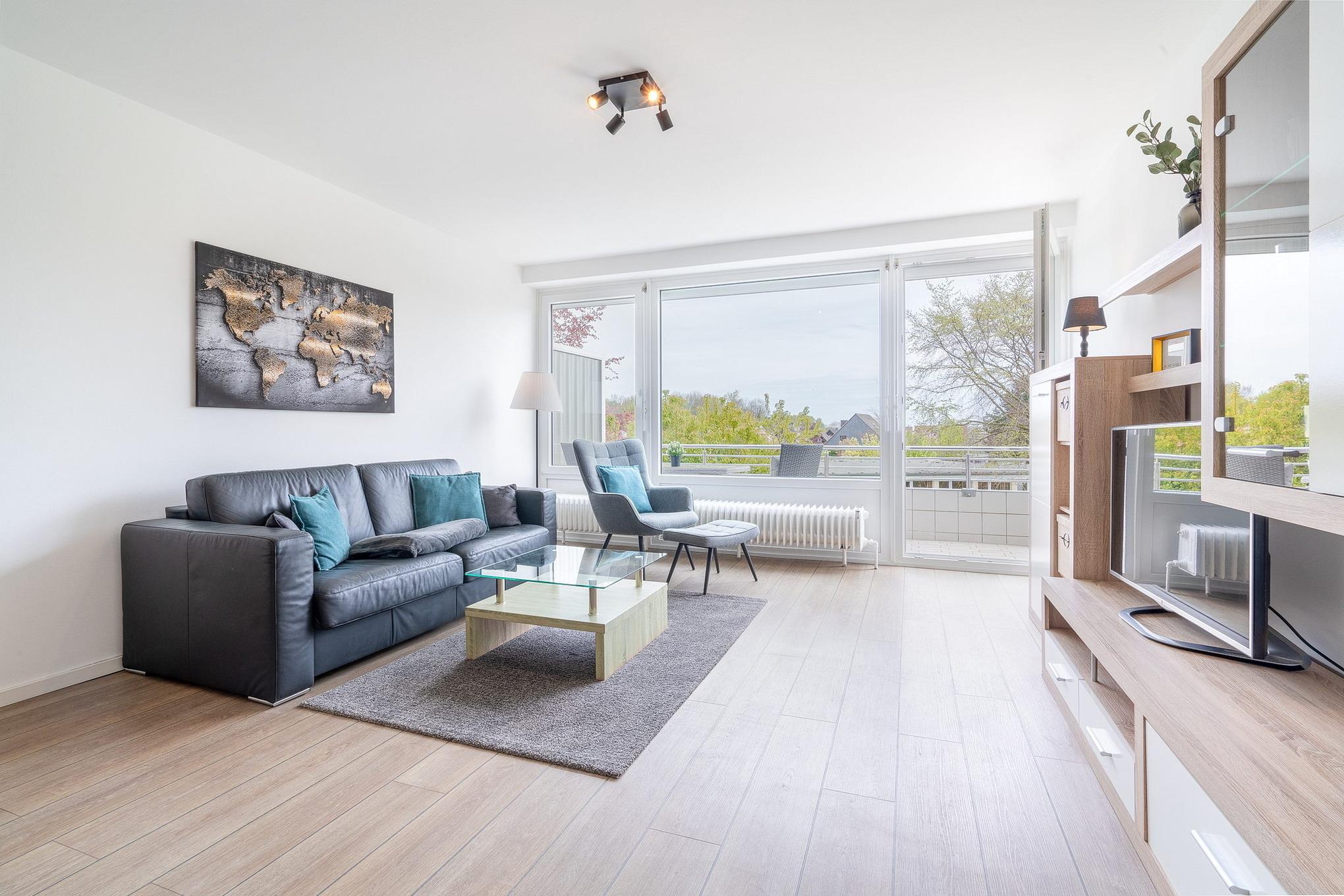 Modern ausgestattetes Wohn- und Esszimmer mit direktem Zugang zum Balkon. Das Wohn- und Esszimmer ist mit einer Couch, einem Sessel, einem Couchtisch, einer Wohnschrankwand und einem Essplatz ausgestattet. Zur Unterhaltung steht ein Flachbildfernseher und eine Mini-Stereoanlage zur Verfügung. Das Zimmer ist mit Designer-Planken ausgelegt, das Fenster lässt sich durch Lamellen etwas verdunkeln.