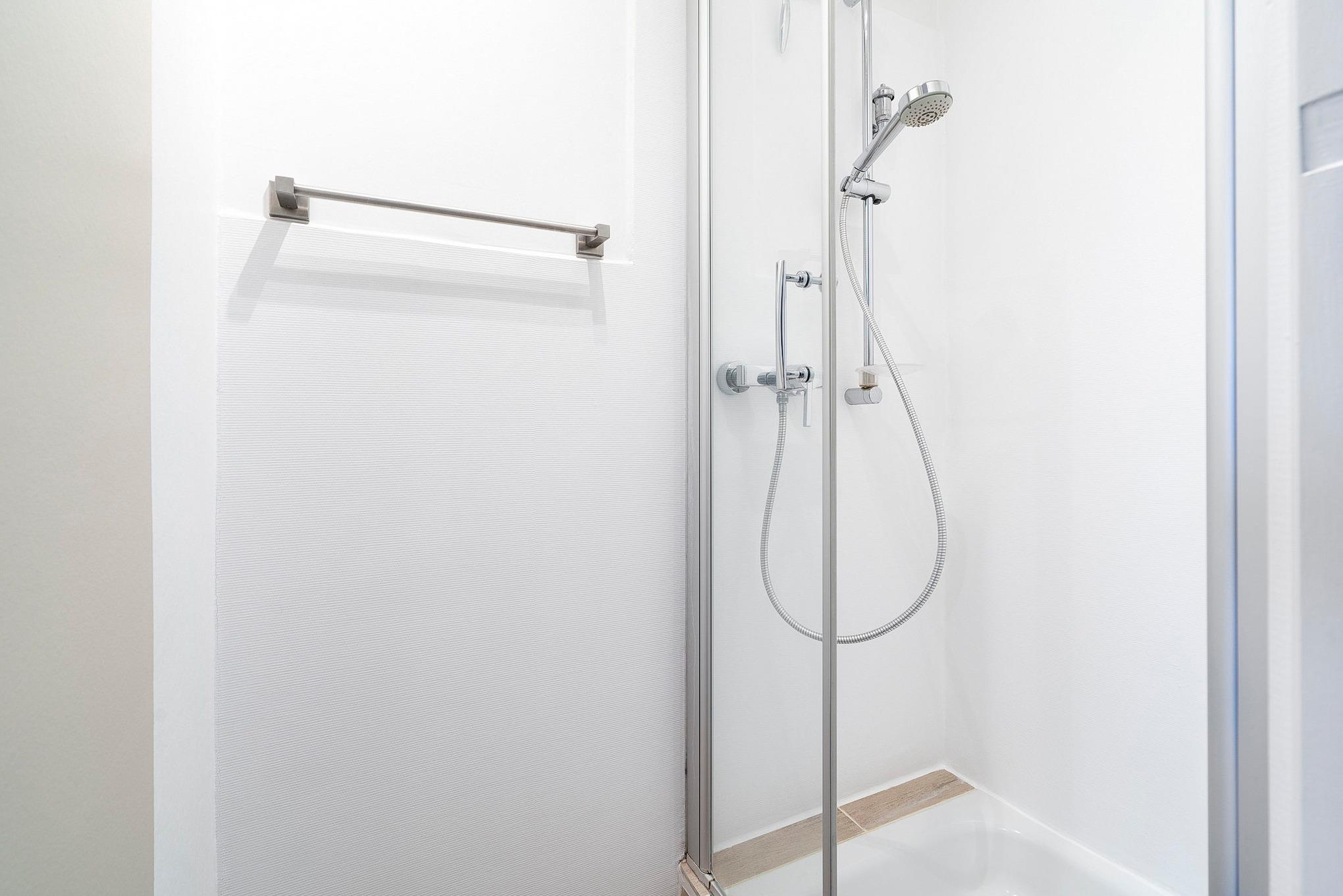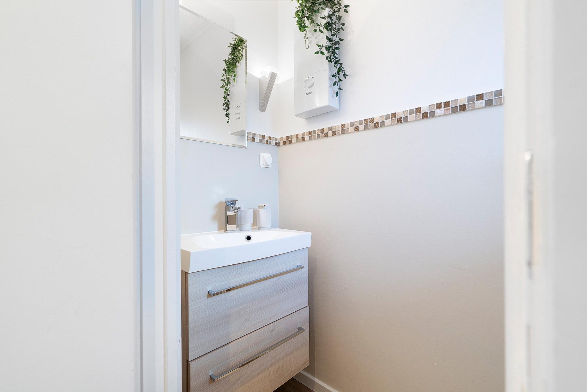 Innenliegendes modernes, hell gefliestes, kleines Bad mit Dusche und Waschbecken. Separates kleines WC mit Tageslicht.