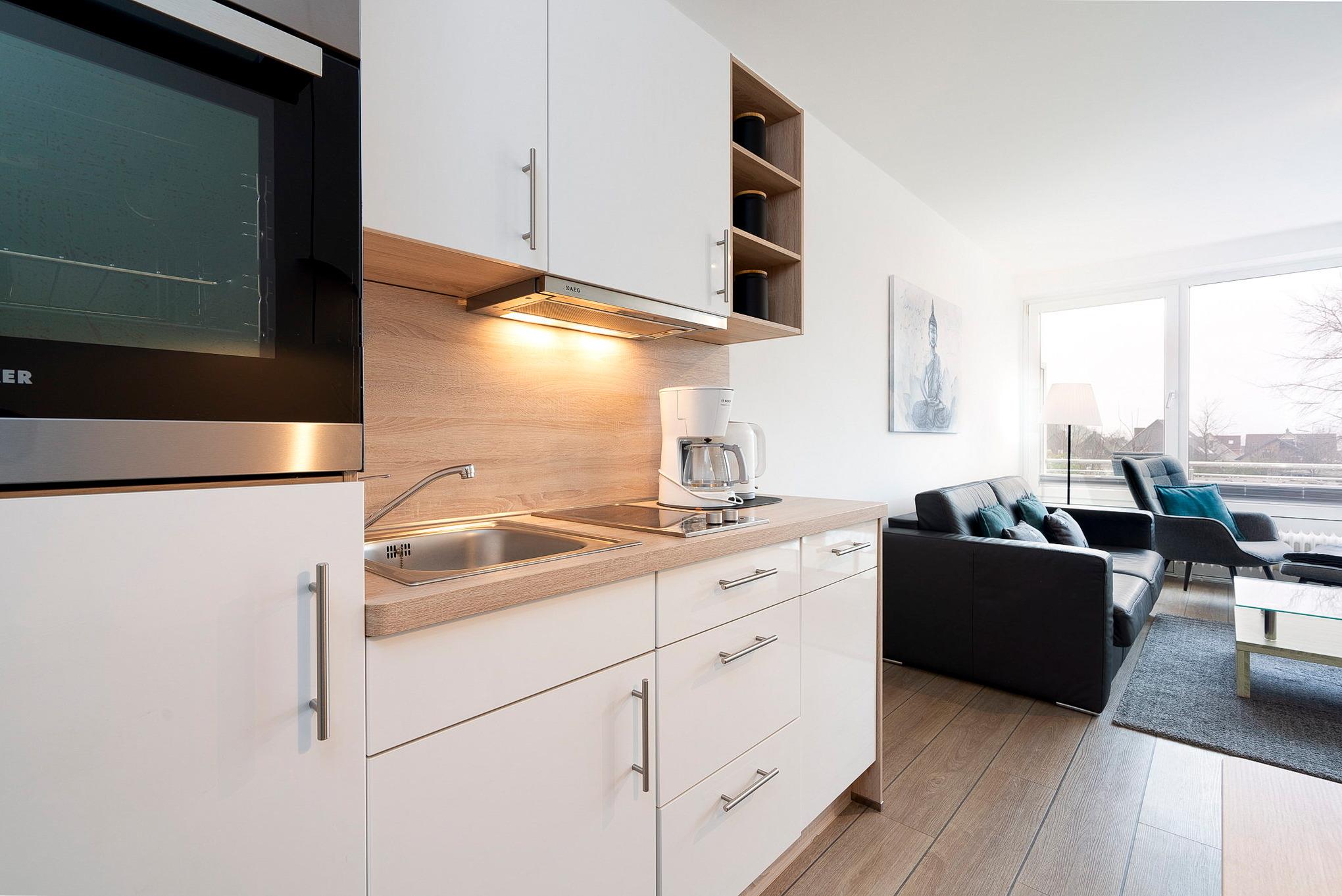 Moderne, komplett eingerichtete, zum Wohn- und Esszimmer offen Küche. Zur Verfügung steht ein 2-Platten Cerankochfeld, ein Backofen, ein Kühlschrank mit kleinem 3-Sterne Gefrierfach, eine Spülmaschine, eine Kaffeemaschine und ein Toaster.