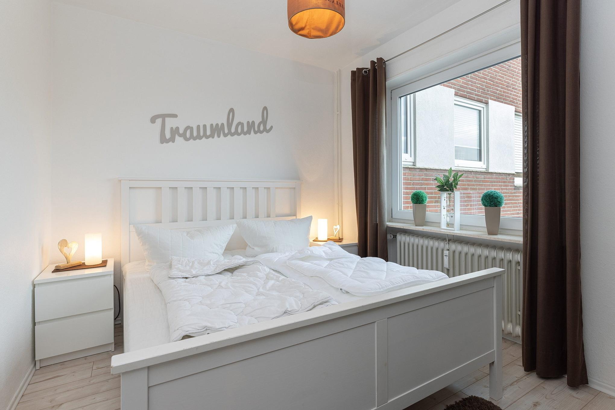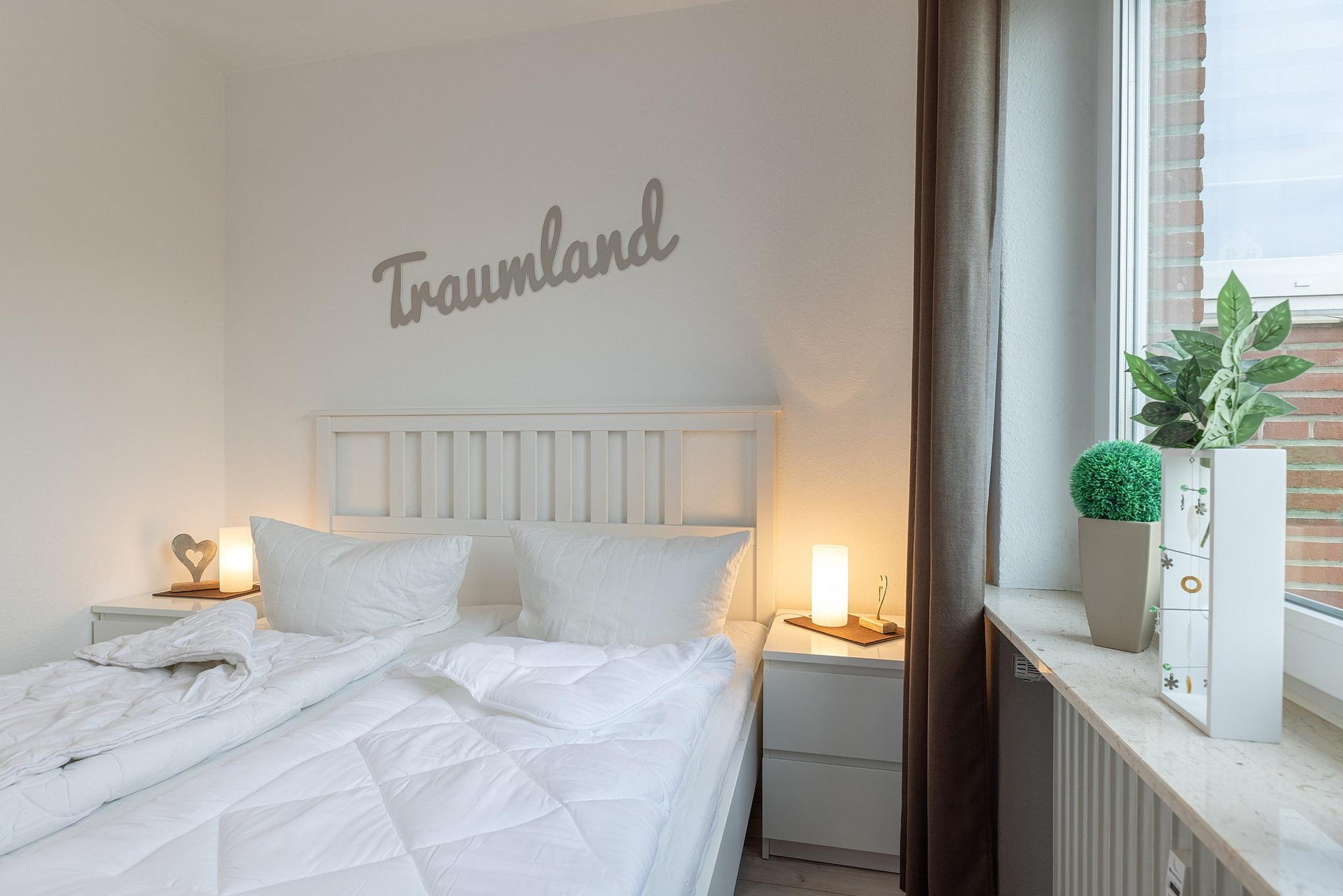 Das kleine freundliche Schlafzimmer ist ausgestattet mit einem Doppelbett (2x70x200cm) und einem kleinen Kleiderschrank.