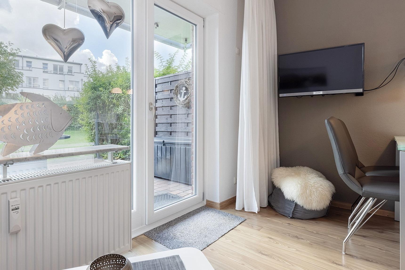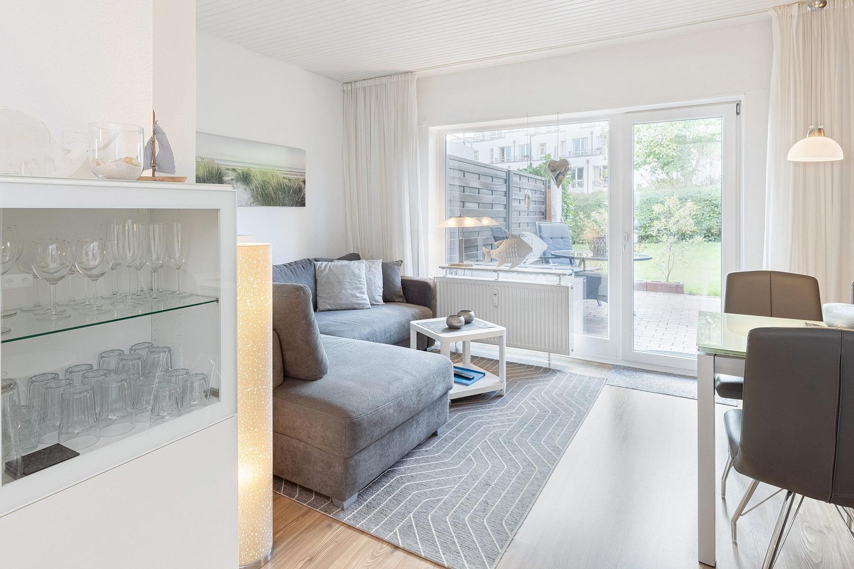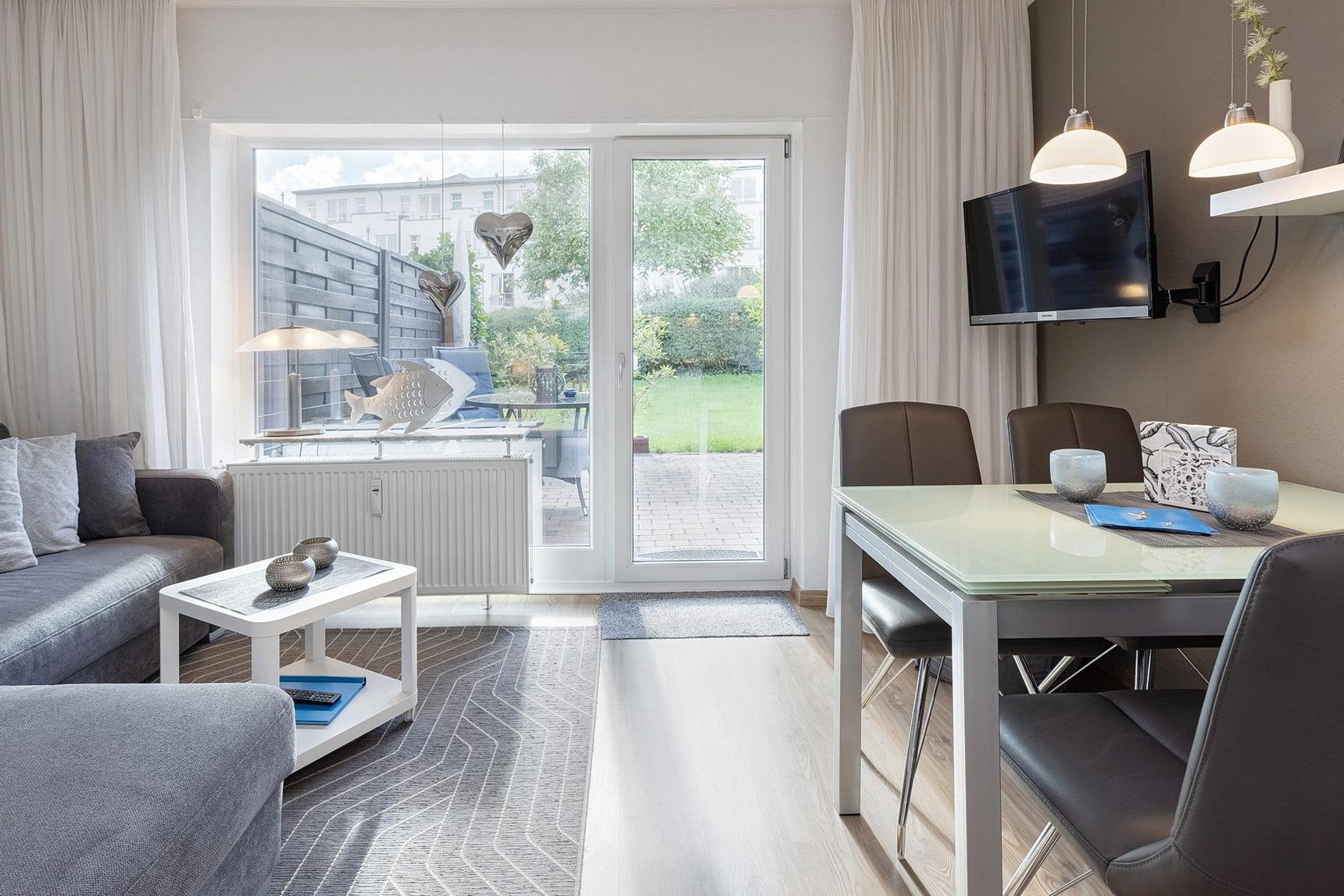 Der helle moderne Wohnbereich mit direktem Zugang zur Terrasse verfügt über eine gemütliche Schlafcouch (140x200cm), sowie einen Essplatz für 4 Personen. Zur Unterhaltung stehen ein Flachbild-TV und eine Mini-Stereo-Anlage mit diversen Quellen wie Radio, CD, USB und Bluetooth zur Verfügung. Außerdem verfügt die Wohnung über ein Telefon. Der Boden ist mit Laminatboden ausgelegt, die Fenster lassen sich durch einen Außenrollladen verdunkeln.