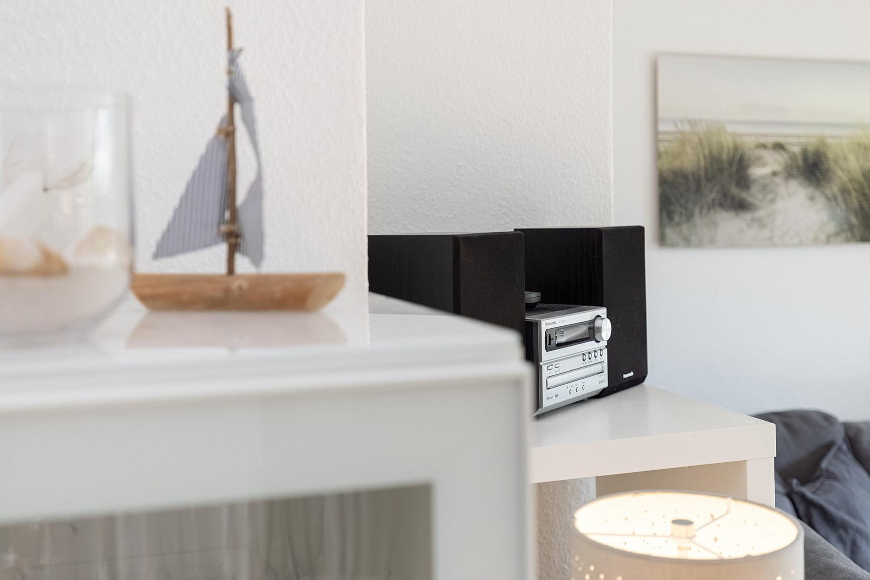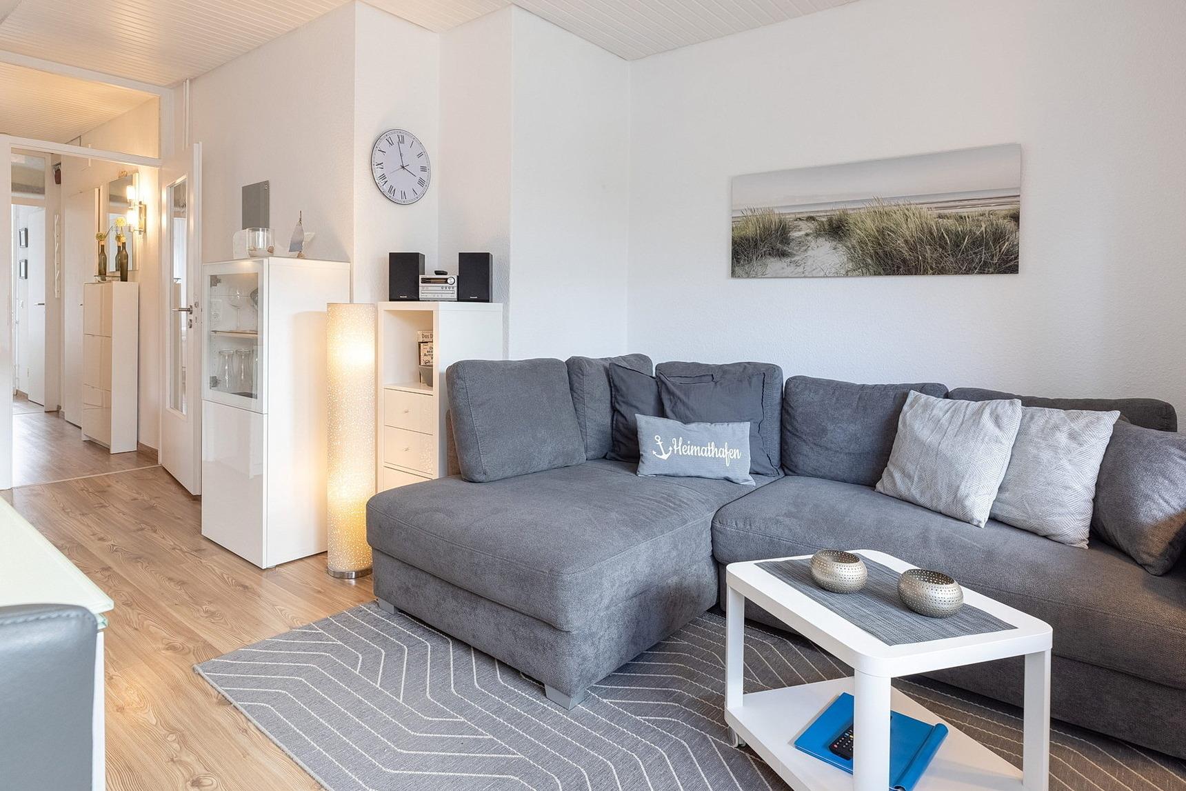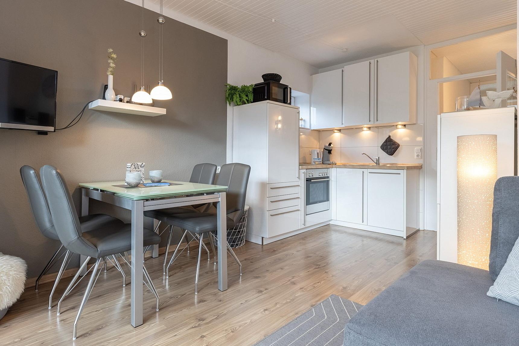 Der helle moderne Wohnbereich mit direktem Zugang zur Terrasse verfügt über eine gemütliche Schlafcouch (140x200cm), sowie einen Essplatz für 4 Personen. Zur Unterhaltung stehen ein Flachbild-TV und eine Mini-Stereo-Anlage mit diversen Quellen wie Radio, CD, USB und Bluetooth zur Verfügung. Außerdem verfügt die Wohnung über ein Telefon. Der Boden ist mit Laminatboden ausgelegt, die Fenster lassen sich durch einen Außenrollladen verdunkeln.