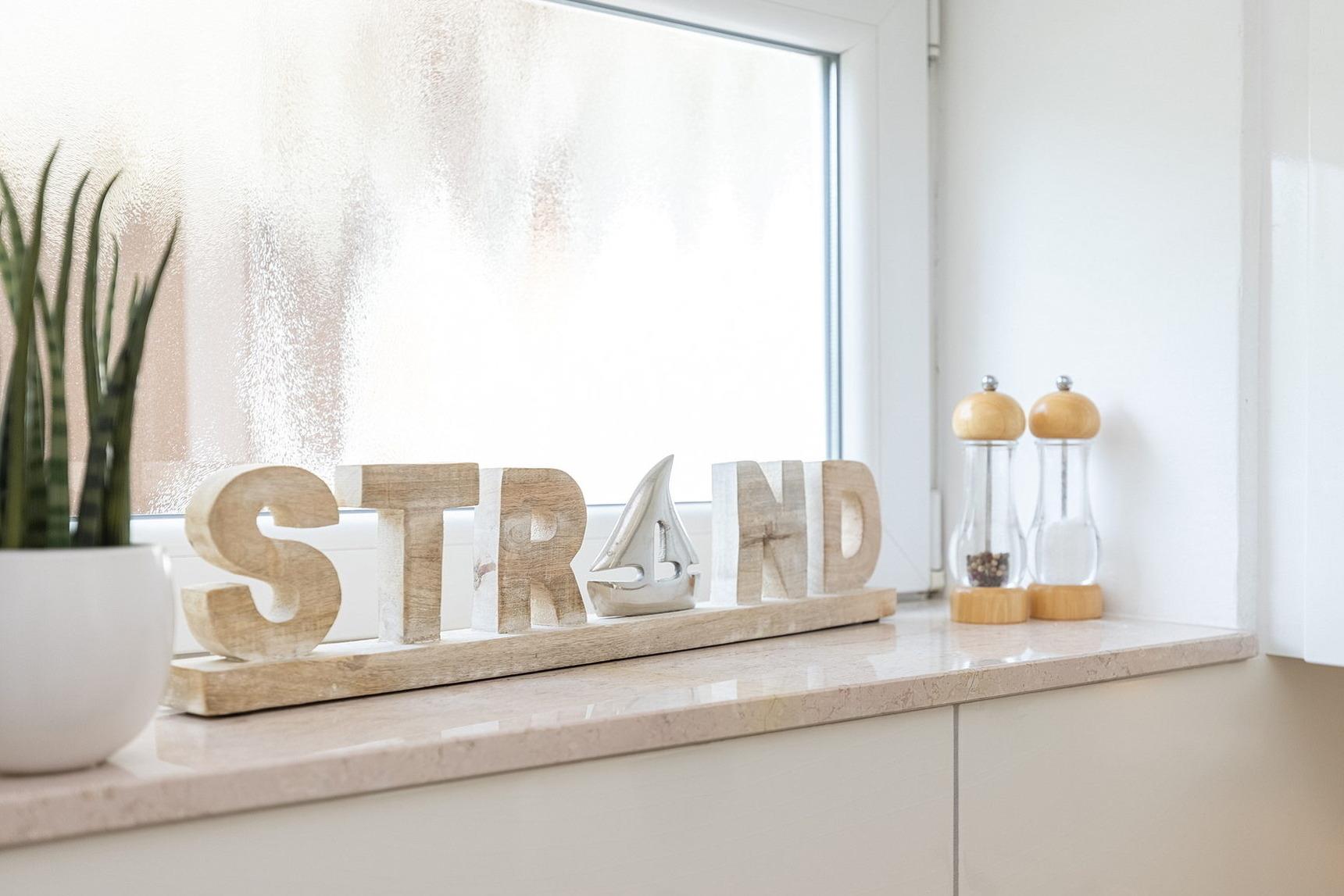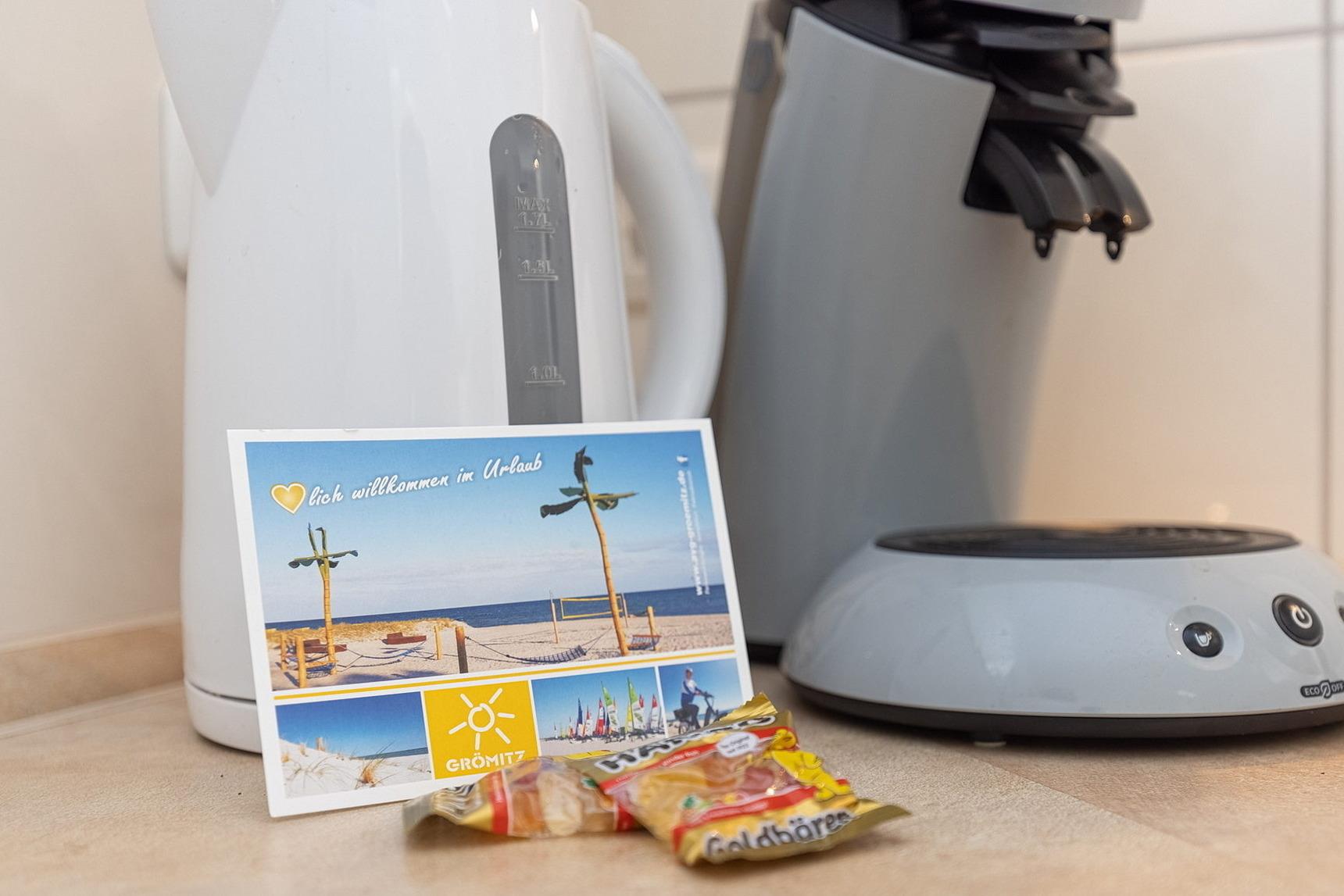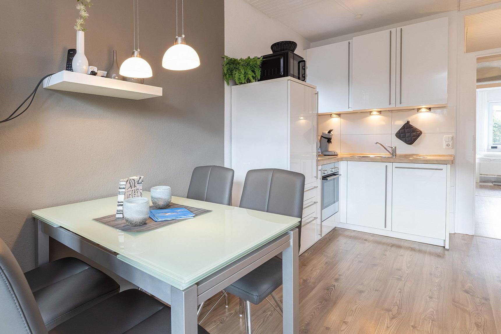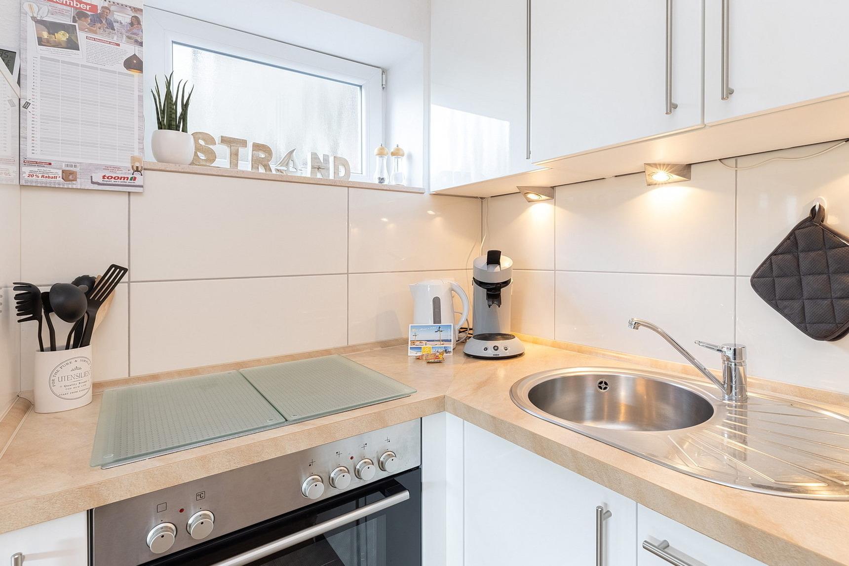 Moderne hochwertige zum Wohnbereich offene komplett ausgestattete Küche mit Kühlschrank mit 3-Sterne-Gefrierfach, Spülmaschine, Mikrowelle, Backofen und 4-Platten-Cerankochfeld. Außerdem stehen eine Kaffeemaschine, ein Wasserkocher und ein Toaster zur Nutzung bereit.