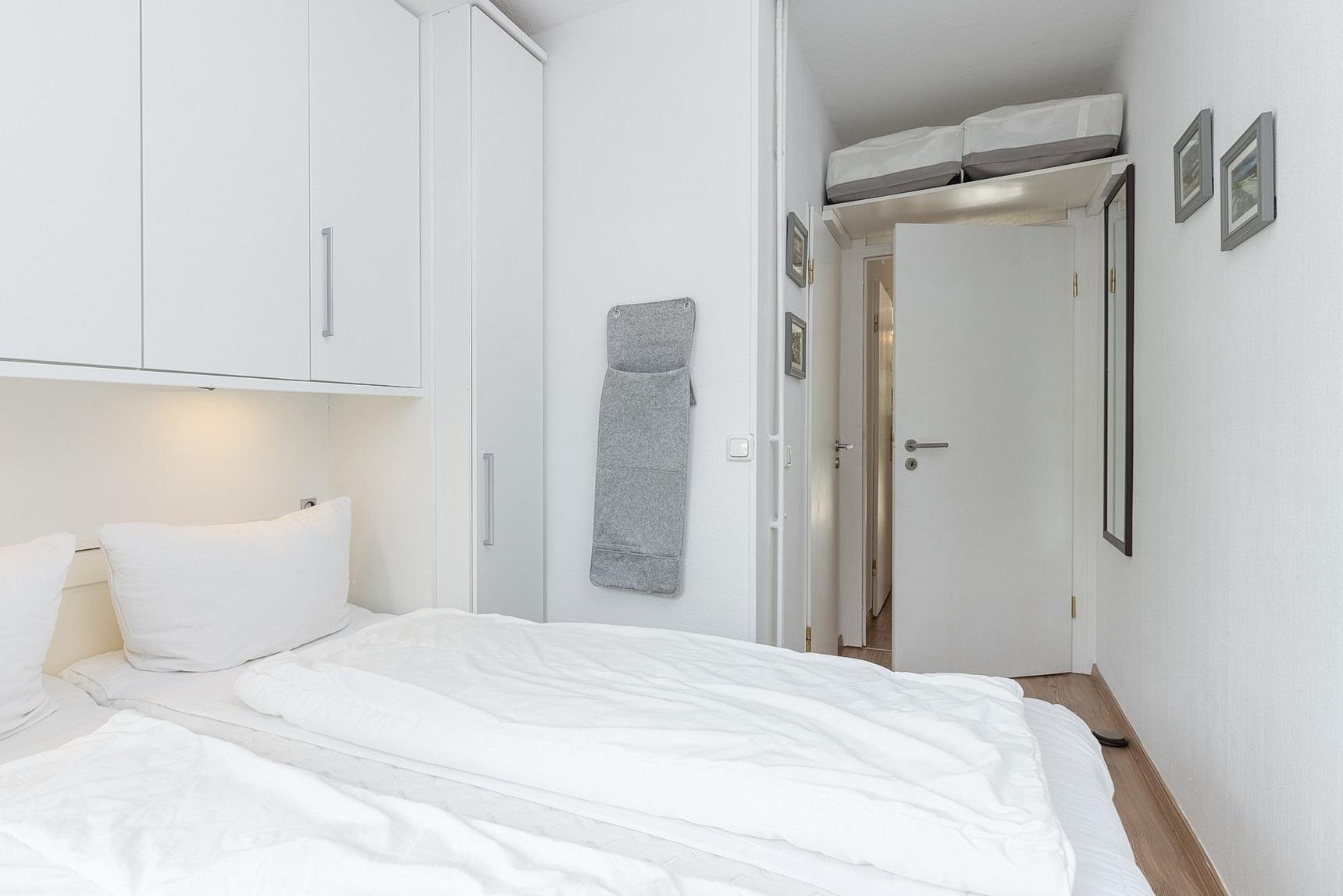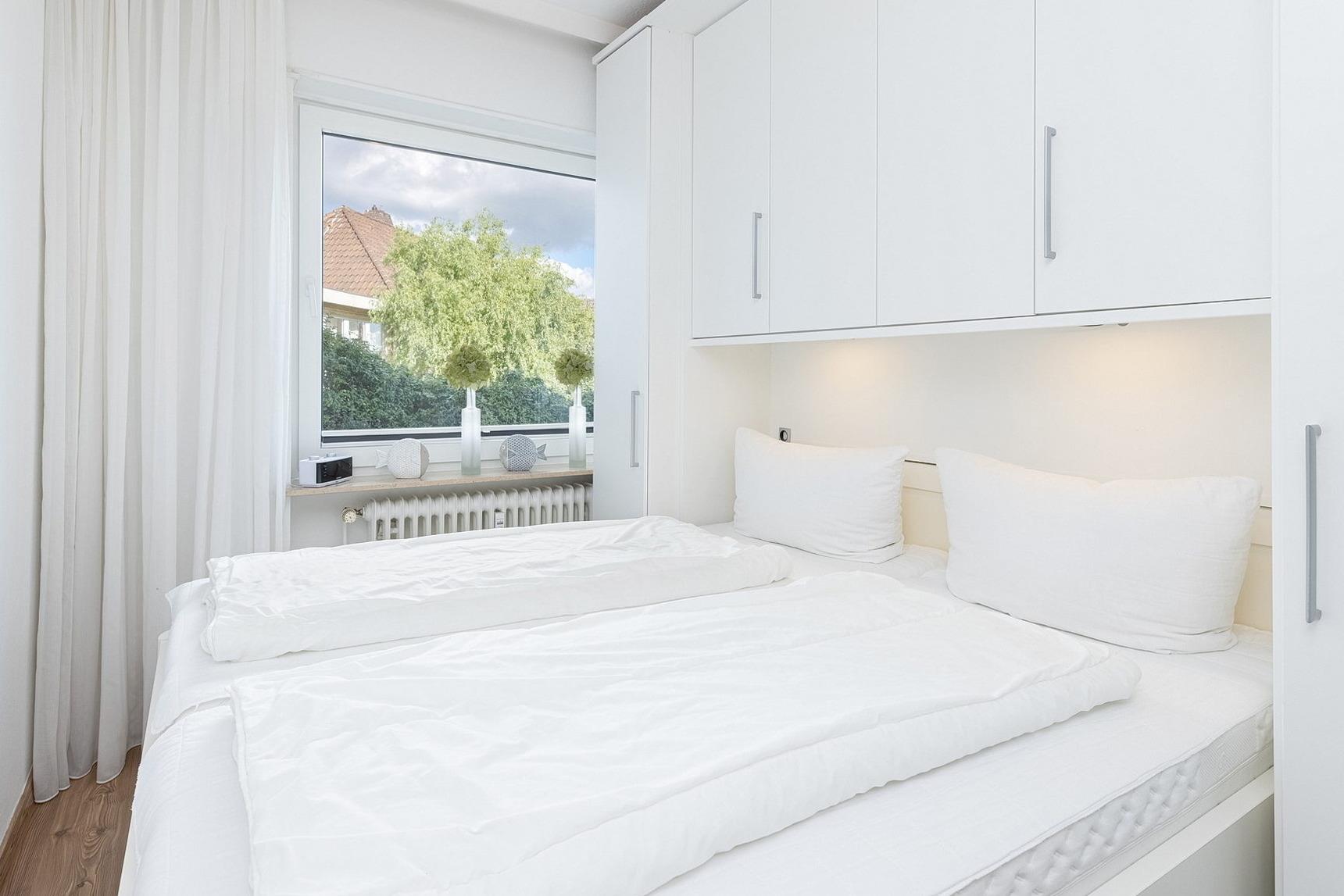 Das kleine freundliche Schlafzimmer ist ausgestattet mit einem Doppelbett (2x80x200cm) und einem Kleiderschrank. Das Fenster lässt sich durch einen Außenrollladen verdunkeln.