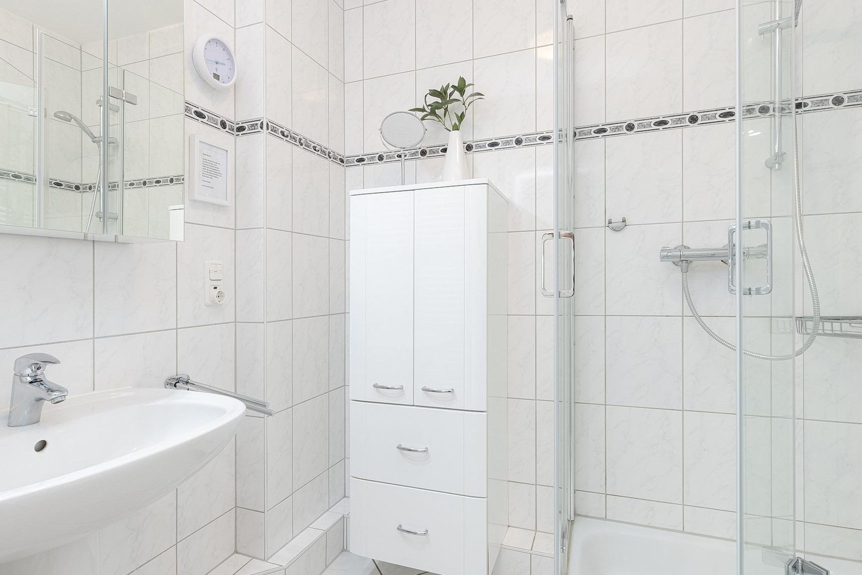 Hell gefliestes Bad mit Dusche, WC und Waschbecken.