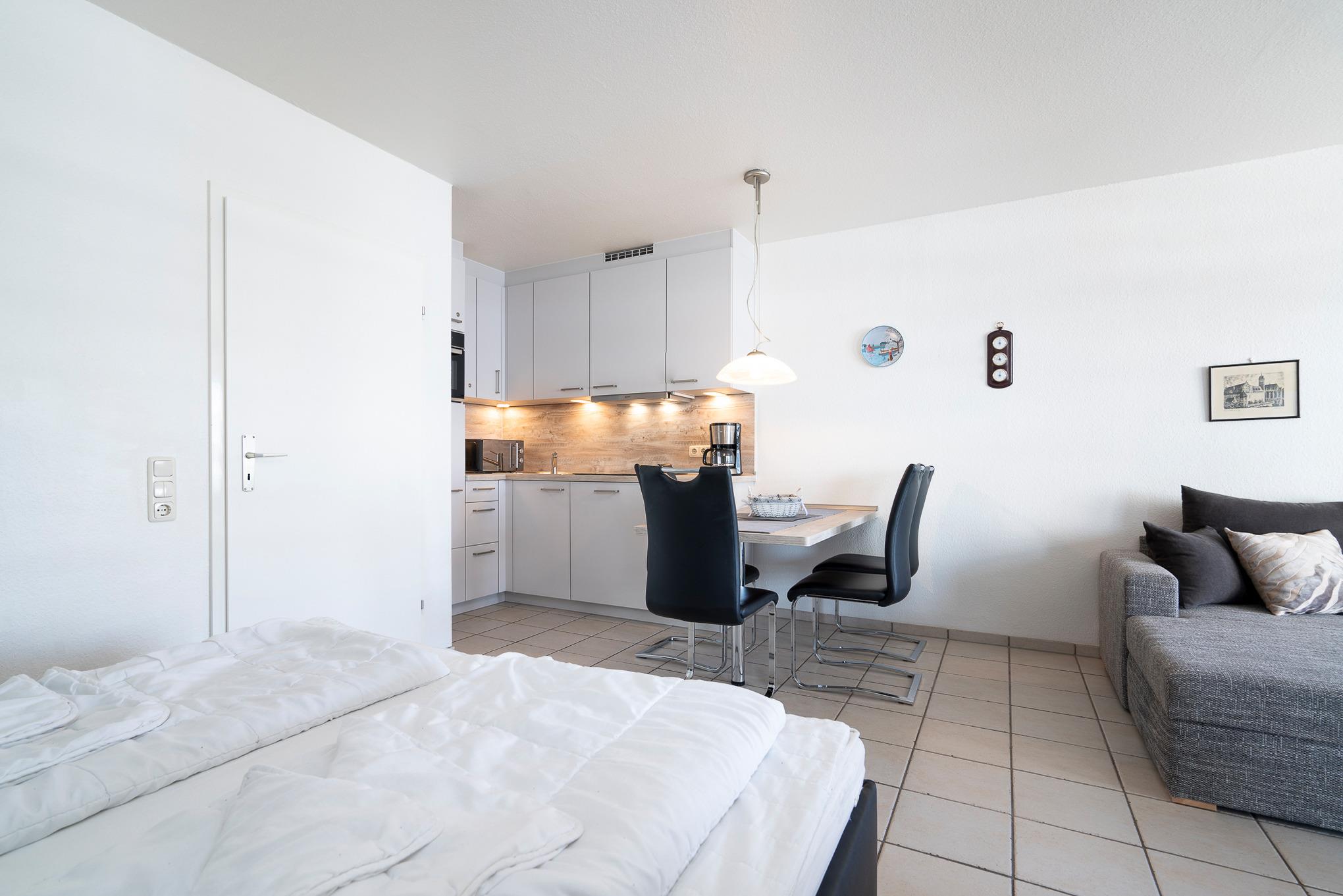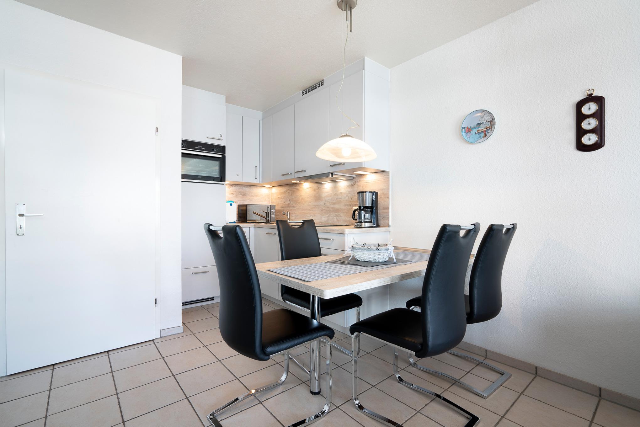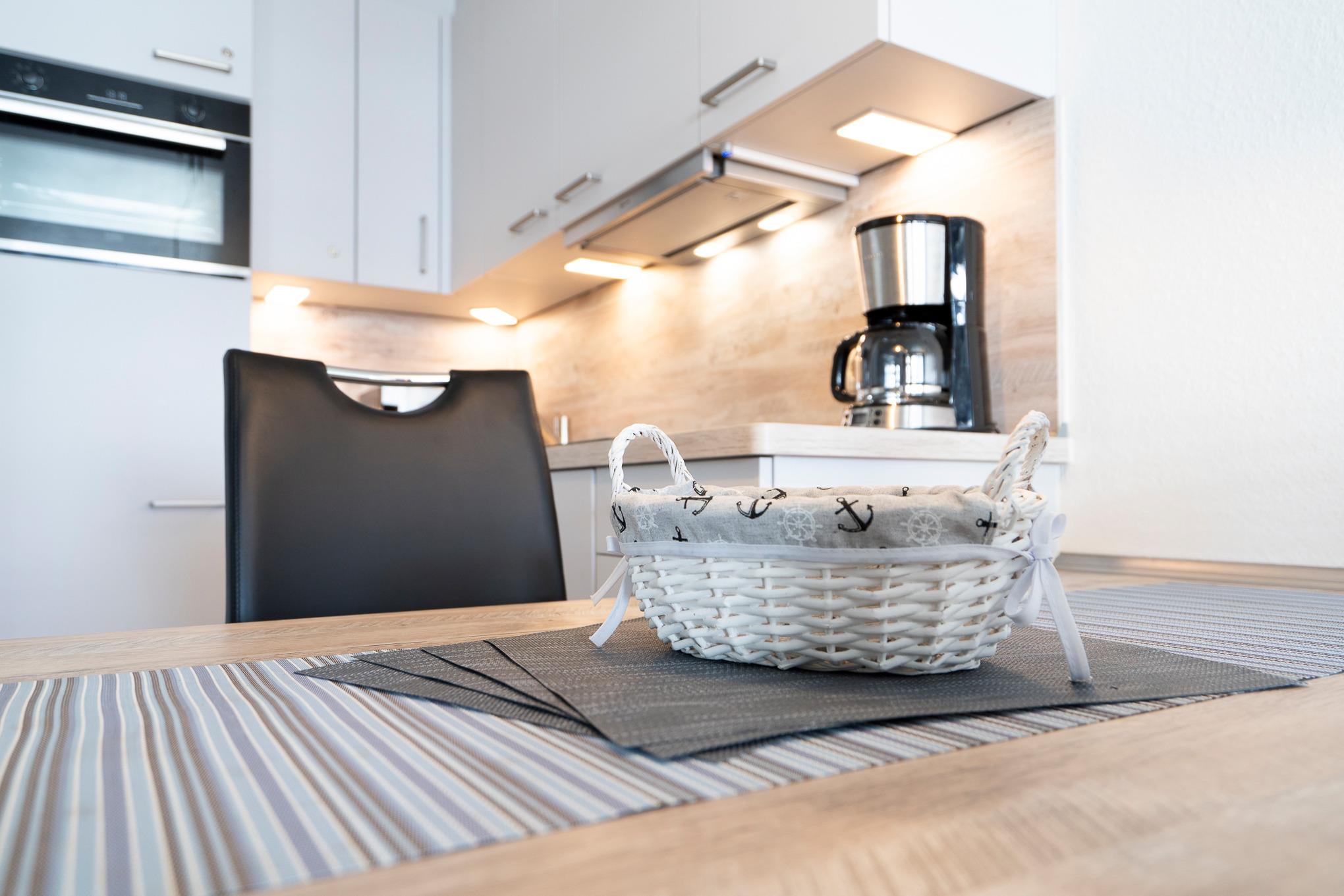 Moderne, neue, komplett eingerichtete, zum Wohnbereich offene Küche mit einem 4-Platten Cerankochfeld, einer Spülmaschine, Backofen, Kühlschrank mit kleinem 3-Sterne Gefrierfach, Mikrowelle, Kaffeemaschine, Toaster und Wasserkocher.