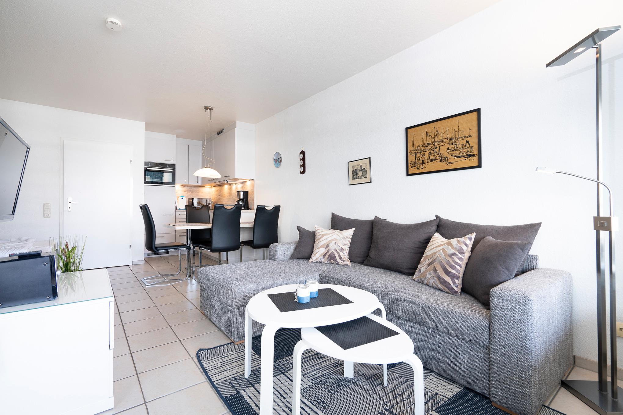 Moderner Wohn- und Schlafbereich mit Essplatz für 4 Personen. Der Wohn- und Schlafbereich ist mit einem Doppelbett (2x 80x200cm), 2 kleinen Kleiderschränken, einer Eckcouch und einem Couchtisch ausgestattet. Vom Wohnbereich besteht ein direkter Zugang zum Balkon. Zur Unterhaltung stehen ein Flachbild-Fernseher, ein DVD-Player und eine Mini-Stereoanlage mit CD-Player zur Verfügung. Der Wohn- und Schlafbereich ist gefliest. Die Fenster und die Tür lassen sich durch einen Vorhang blickdicht verdunkeln.
